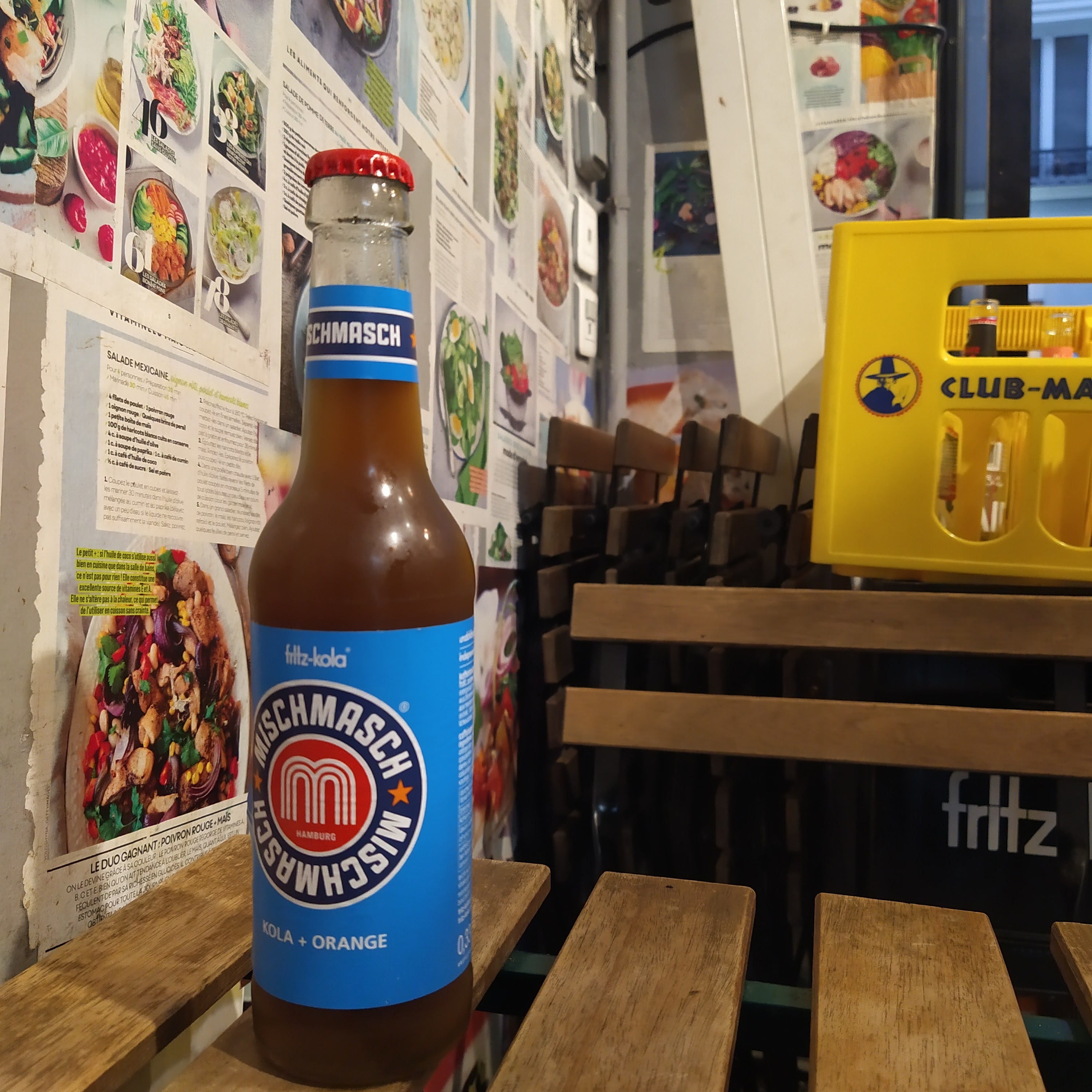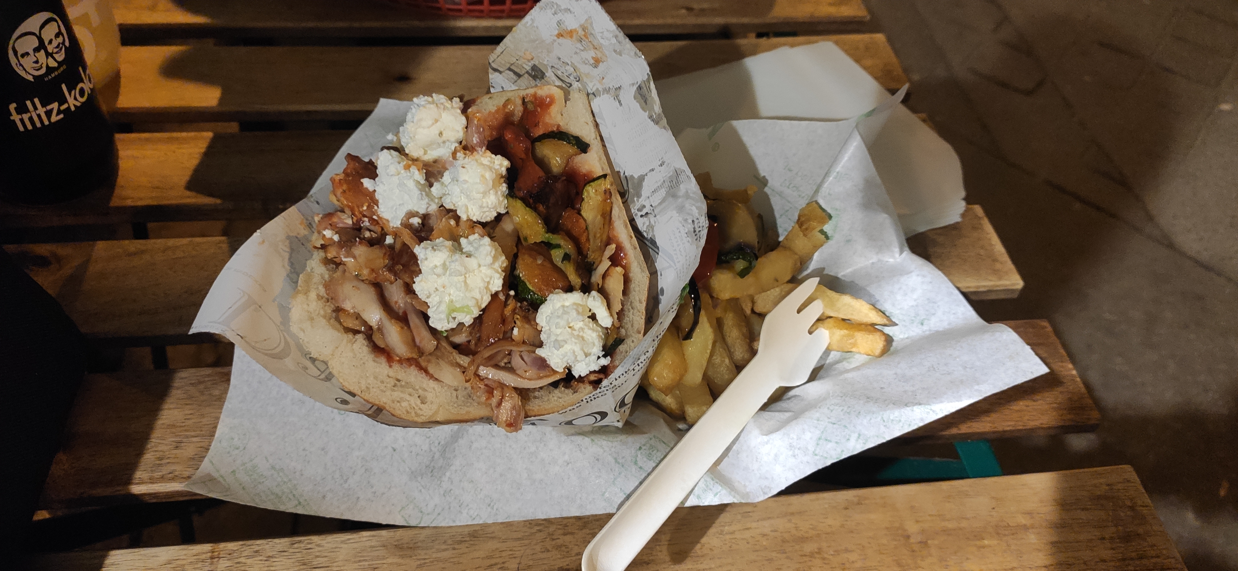 Absolument trop trop trop bon !! J'ai goûté la version vegan avec la sauce sésame/citron et c'était vraiment une merveille !! Le seitan est souple, parfumé et digeste et la composition proposée avec les légumes est juste folle en goûts et assainissements. Le pain est moelleux mais légèrement croustillant à l'extérieur, bref, ne n'ai vraiment rien à dire ! Et en plus c'est beau 😍 Ce que vous voyez sur le dessus c'est de la fêta vegan qui apporte un petit goût en plus très sympa. Ah, heureusement qu'une fourchette est fournie pour la dégustation vu comme c'est bien garni 😅 Mention + + pour les boissons car on retrouve du Fritz Cola et du Club maté dans les frigos.