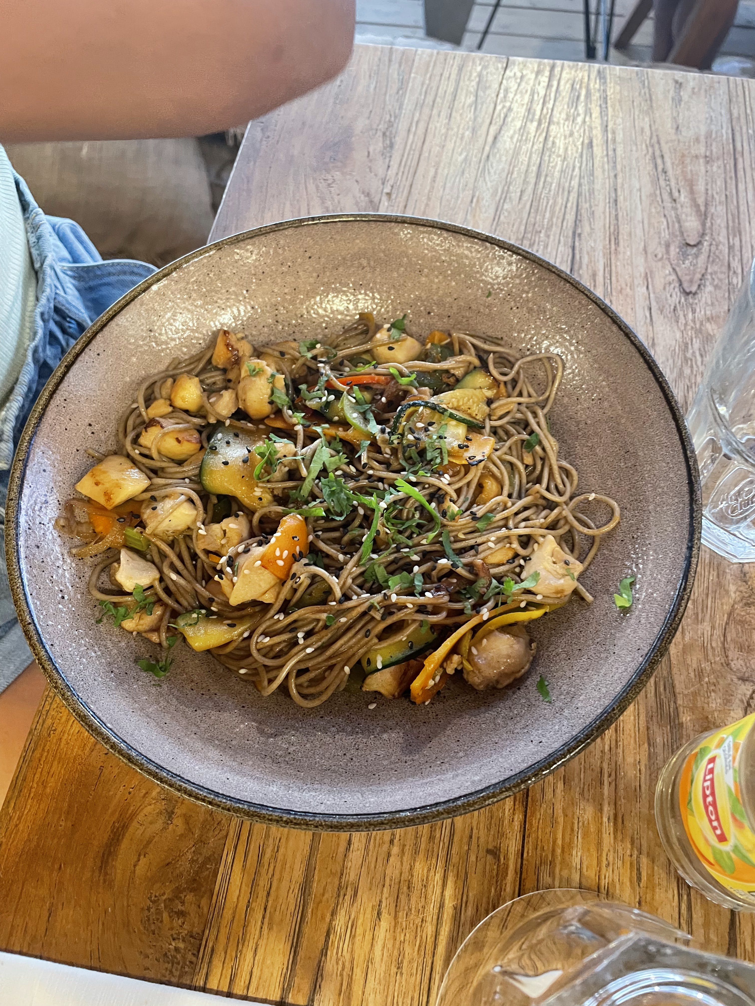 Décoration du restaurant parfaitement accordé avec l'emplacement. Personnel accueillant. C'est le seul restaurant qui nous a proposé une gamelle pour le chien. Très agréable pour dîner le midi. Service rapide. Wok de poulet délicieux. Tout les critères y sont présents pour recommander le restaurant. Nous y sommes retournés l'après midi pour les jus de fruit. Au top ! 👍🏻
