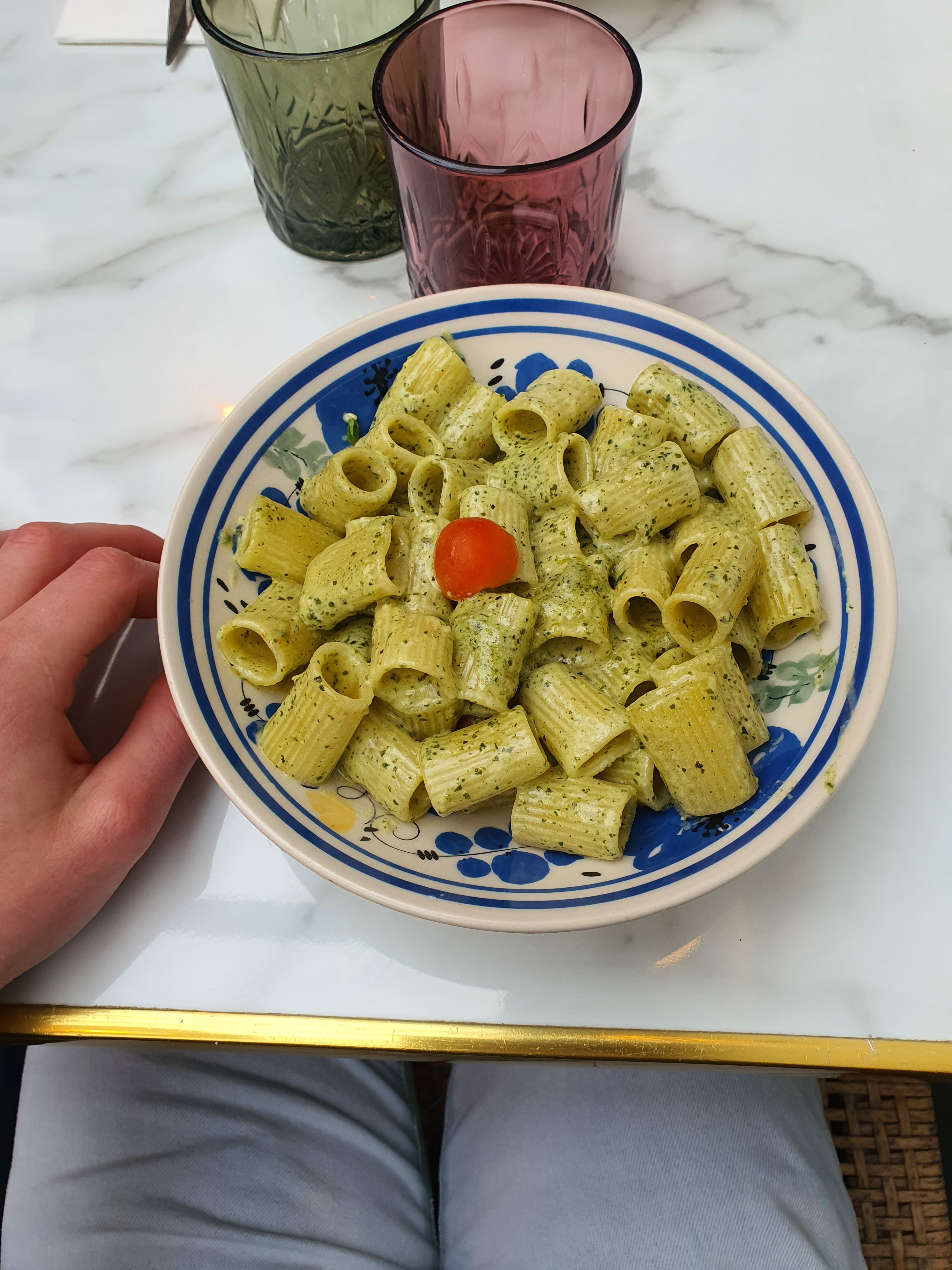 Pâtes au pesto très bonnes! Un services sympa. Repas délicieux. Petite de déception au dessert, un tiramisu servi simplement et pas assez imbibé a mon goût. Pas trop d'air entre la salle et la terrasse extérieure.