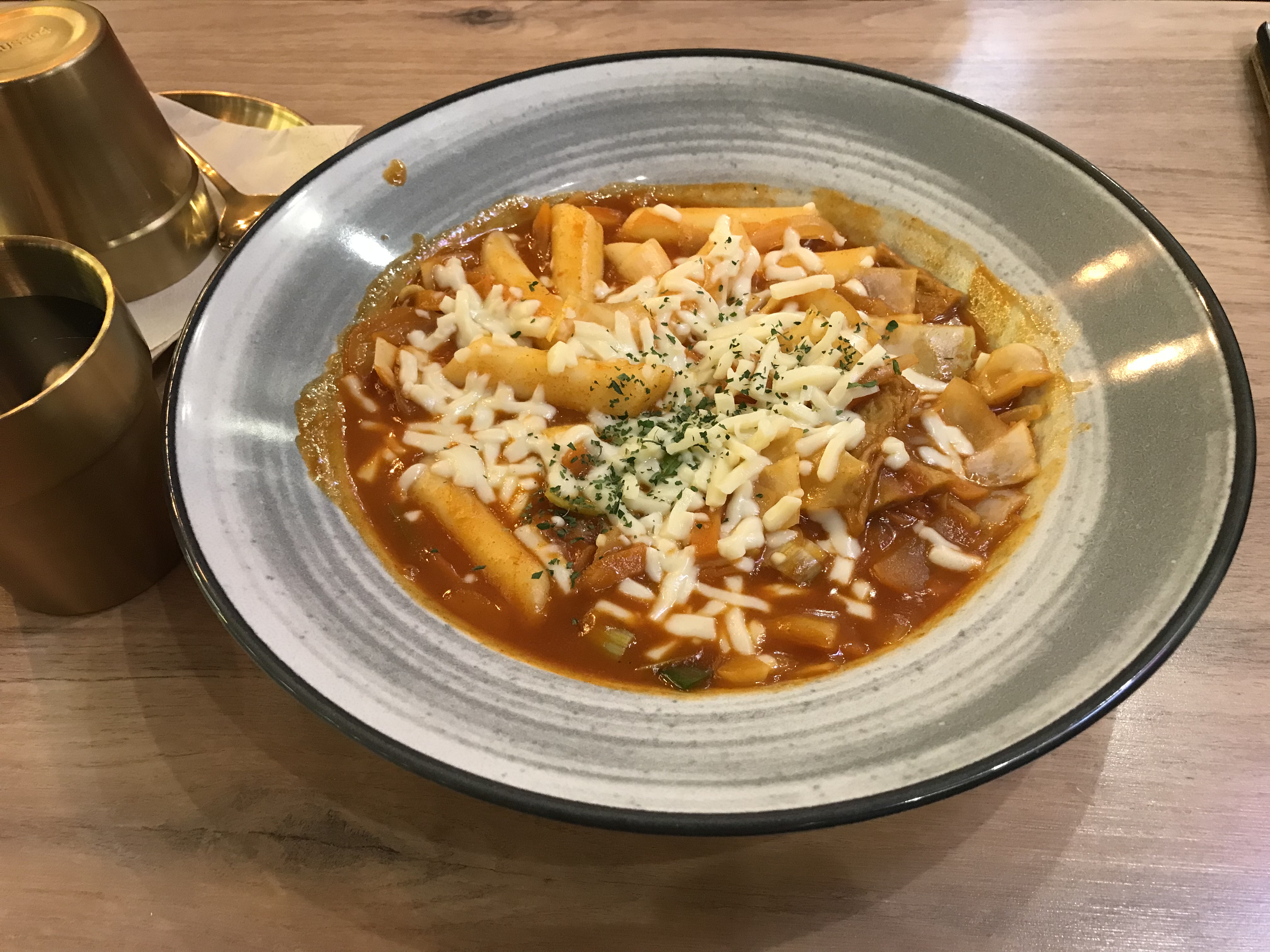 Restaurant où l'on mange bien ! On y est allé un samedi soir et pas besoin de réserver. Leur spécialité poulet fromage beaucoup de goût et de saveur. Épicée juste comme il faut. La quantité est suffisante pour 2 personnes. Dommage que les accompagnements (kimchy, concombres, brocolis...) soient servis en toute petite quantité. Mais possibilité d'en commander à part en plus. Le kimchy de de choux est excellent. Les boulettes de kimchy sont de tailles correctes mais un peu léger en goût et saveur je trouve et le fromage n'est pas coulant. Dommage que l'on ne nous explique pas l'utilisation du réchaud (quand l'arrêter, faut mélanger...). Mais sinon service très agréable. J'y retournerai avec plaisir pour tester les autres spécialités tebboki et le poulet frit!