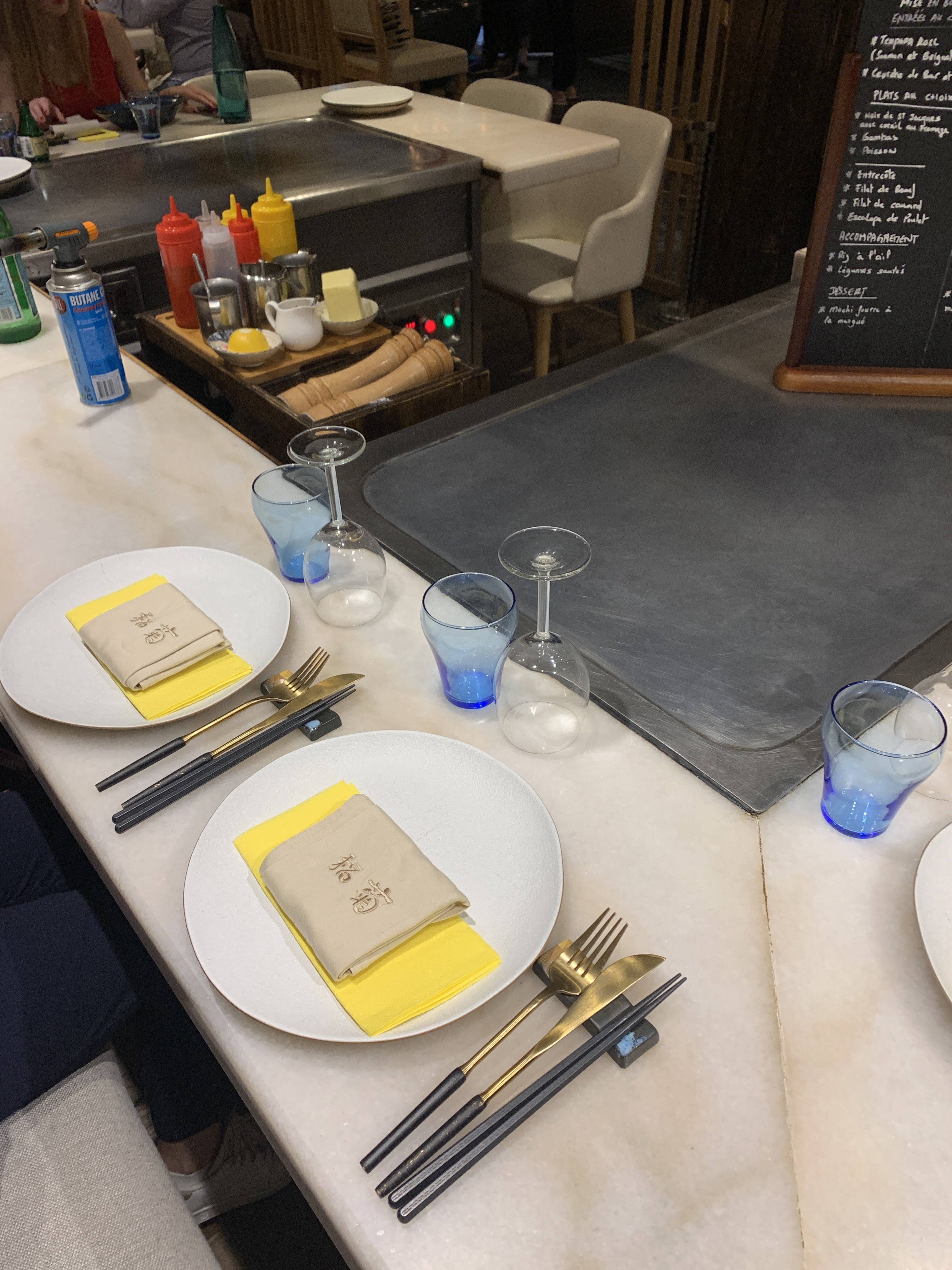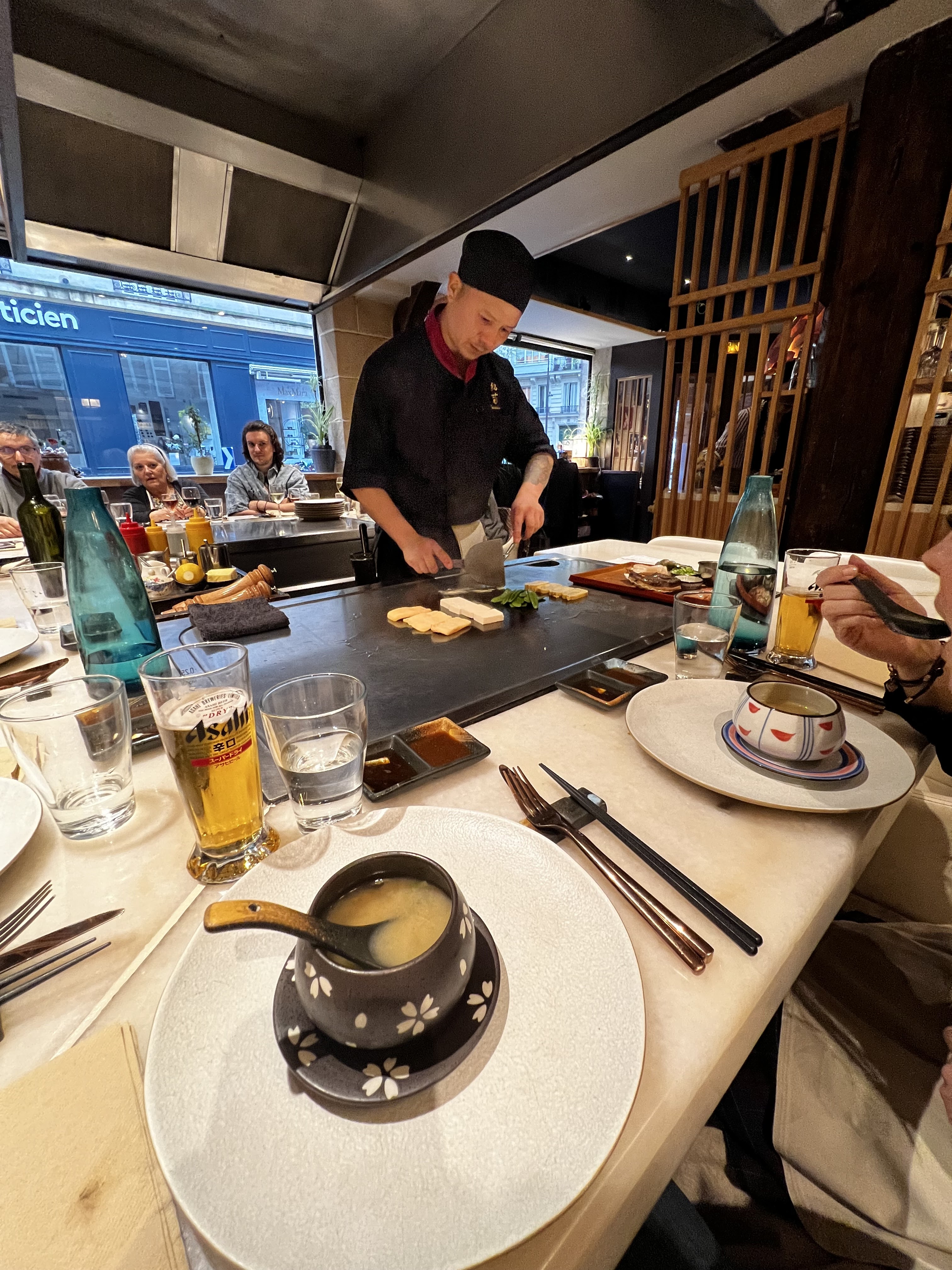 Original, on est assis autour d'une table carrée avec le chef au milieu qui cuisine les plats. On y va plus pour le spectacle que le goût. Les plats sont bien présentés, par contre les coquilles saint Jacques au fromage râpé ne sont pas terribles.