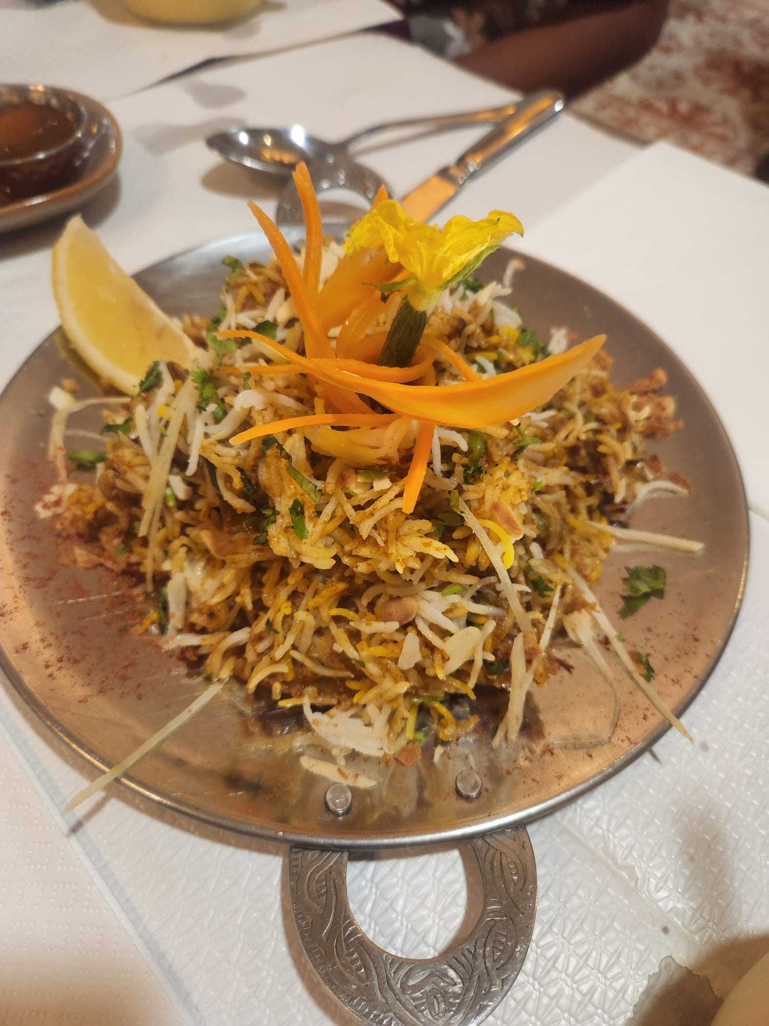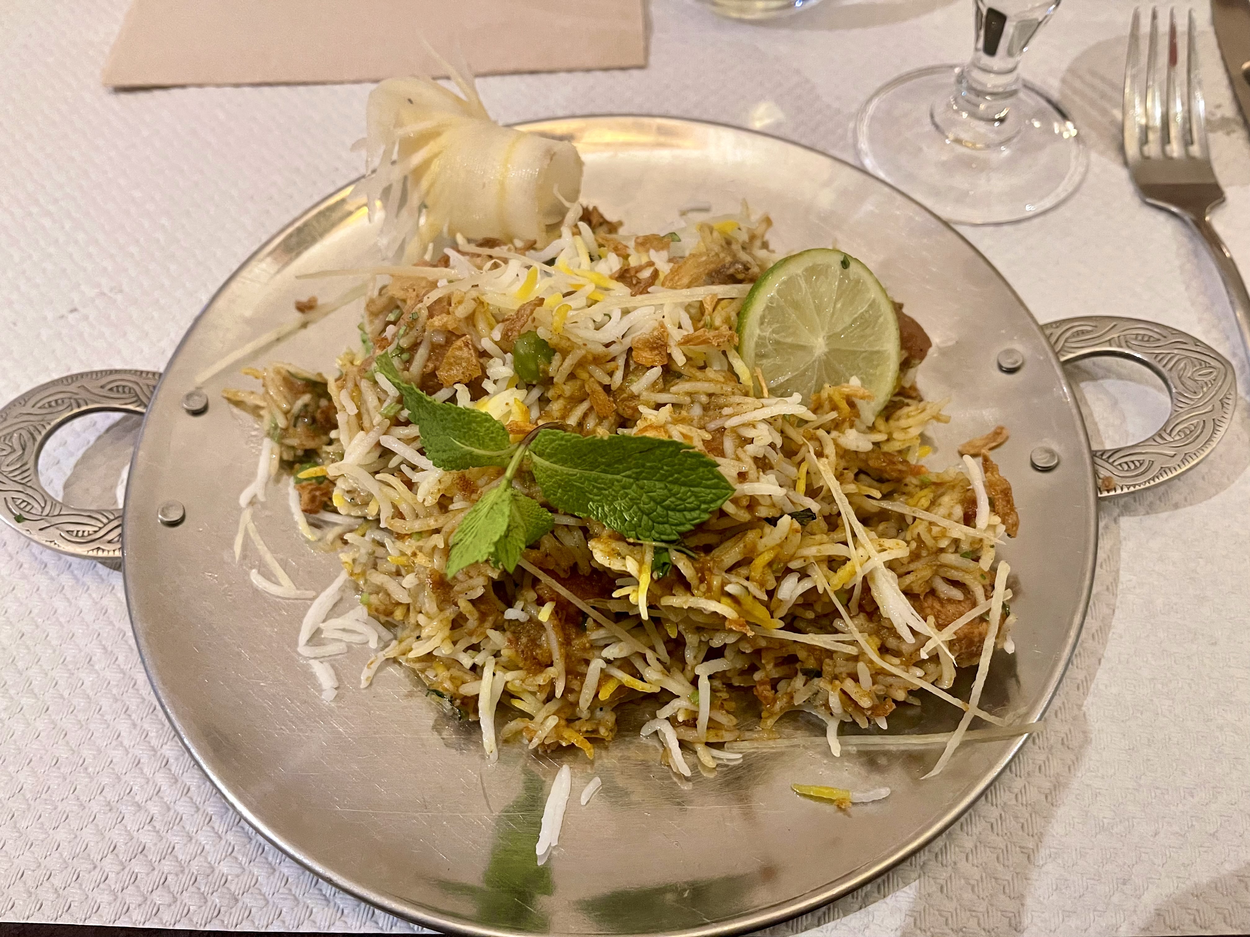 Superbes mets copieux et justement épicés. Le serveur demande si le degré d'épices souhaité. On sent la qualité et la fraîcheur des produits. La décoration bien opulente typique nous fait voyager sur le temps de notre pause dej entre collègues. Accueil sympathique et attentionné pour notre table de 9.