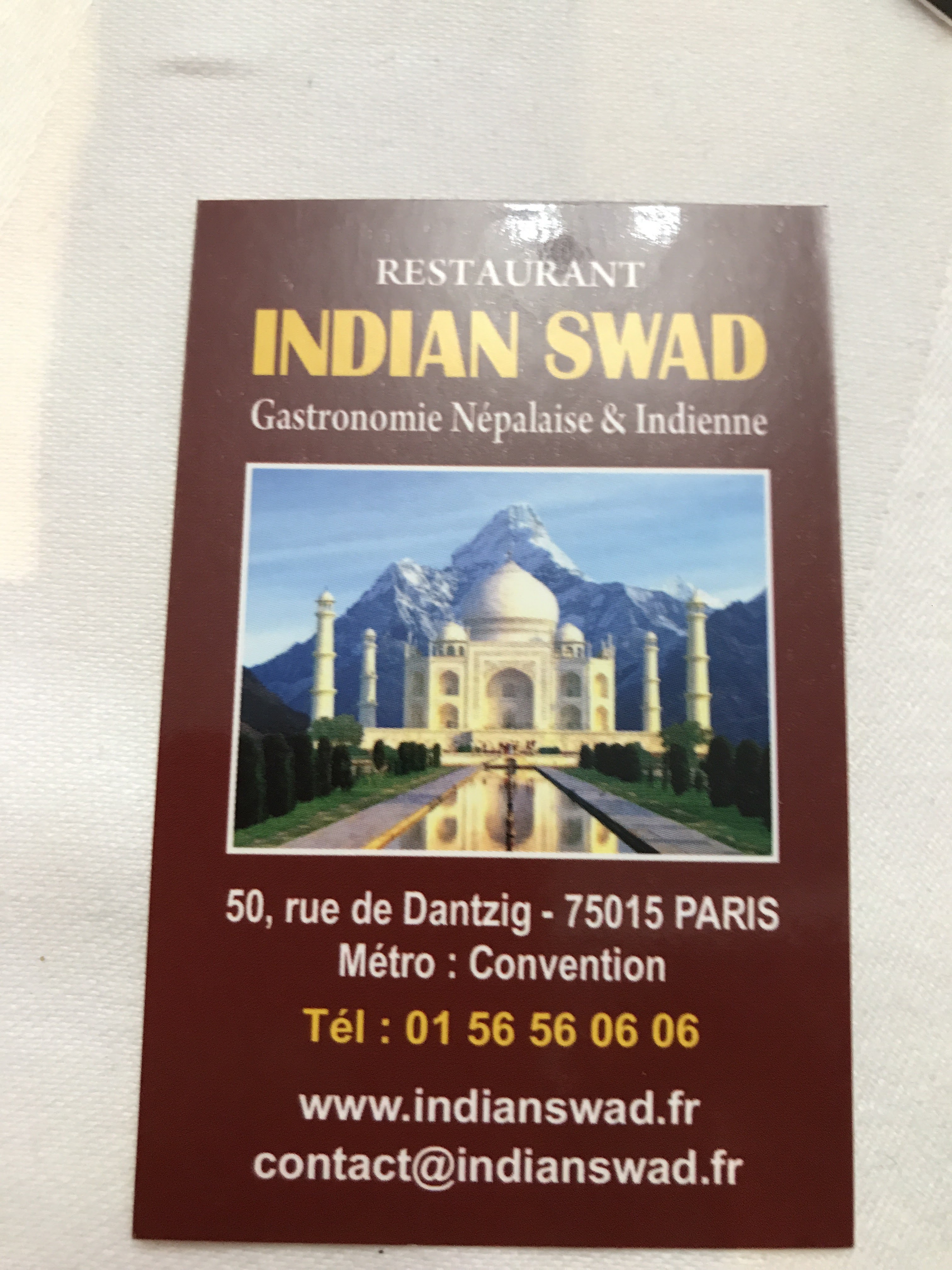 Voici toutes les informations sur le Restaurant indien Indian Swad qui ce trouve au 50 Rue de Dantzig, 75015 Paris (75). Sur cette fiche vous trouverez les photos, l'adresse, les horaires d'ouverture, le numero de téléphone et les avis clients.Vous pouvez églement rédiger un avis si vous le souhaitez en bas de page.