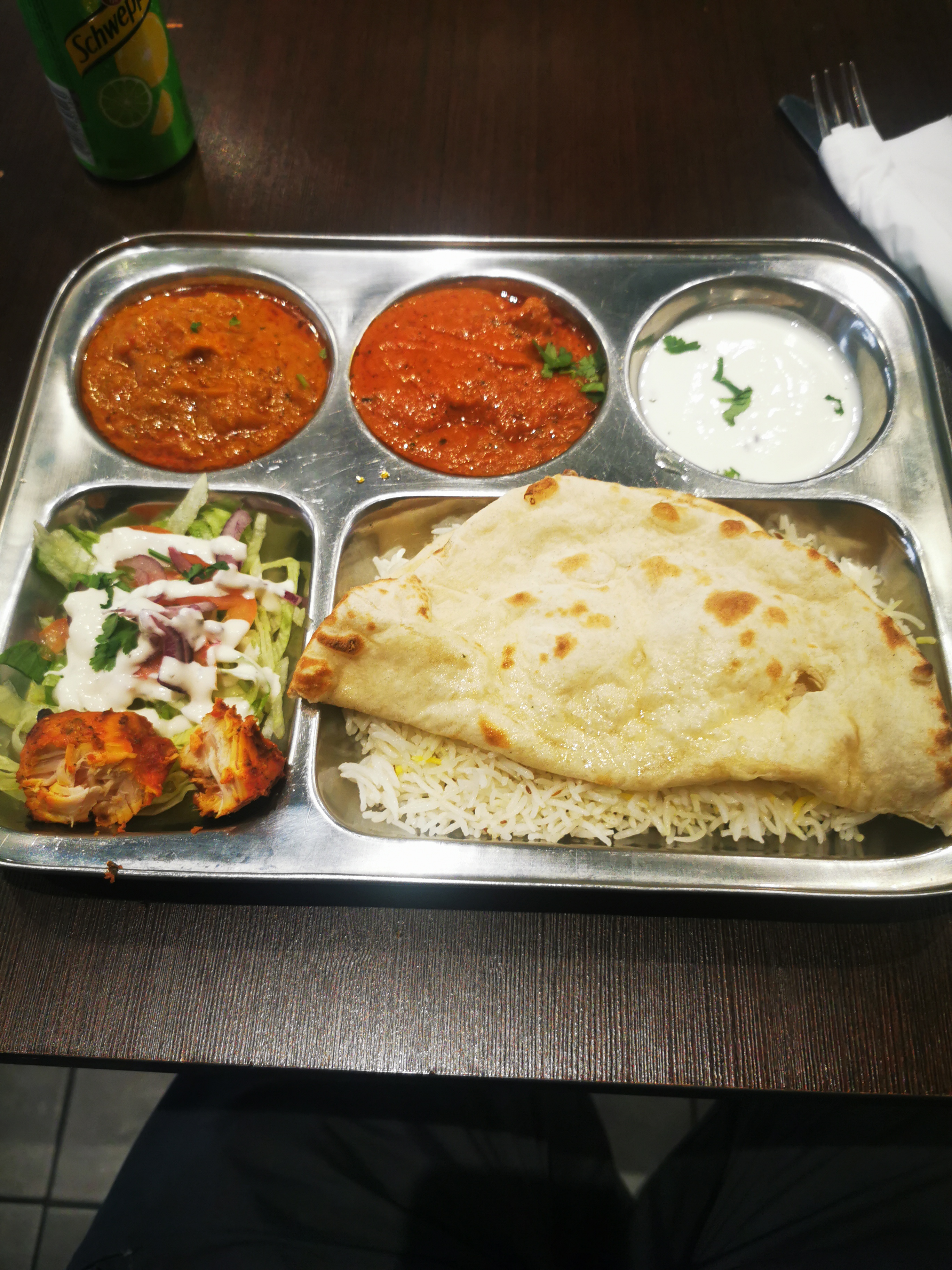 J'étais vraiment content de la nourriture. Et le service était bon. Poulet tandoori très épicé avec frites et riz et légumes et pain naan le tout à 9€ : une bonne affaire !