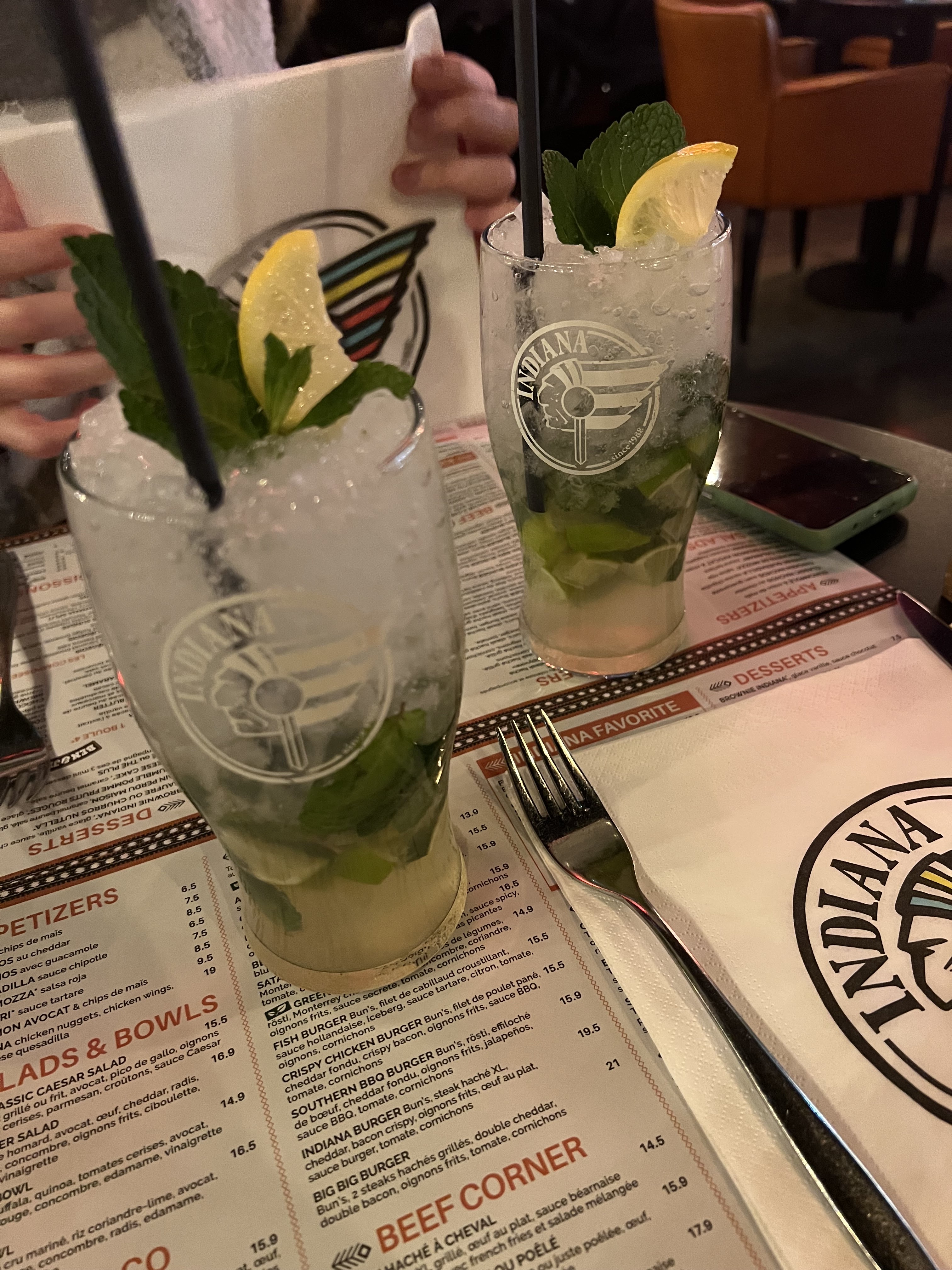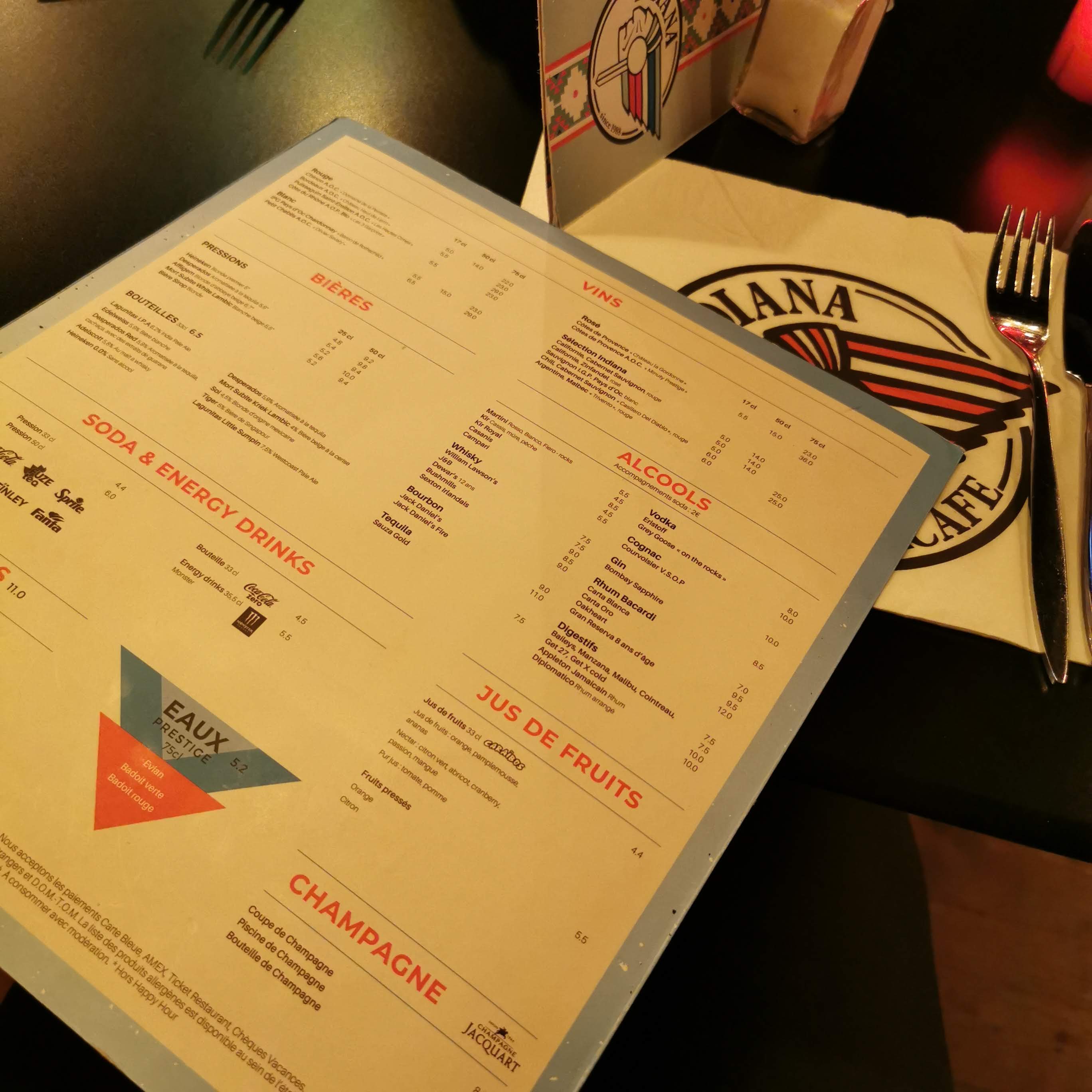 Mes amis et moi même sont allés dîner a L’Indiana la semaine dernière et on a eu un service exceptionnellement excellent, notre serveuse et le jeune homme à lunette ( qui semblait être le responsable) nous ont très bien accueillis et les cocktails et le repas était délicieux j’y retournerai plutôt 2 fois qu’une merci 🙏🏼