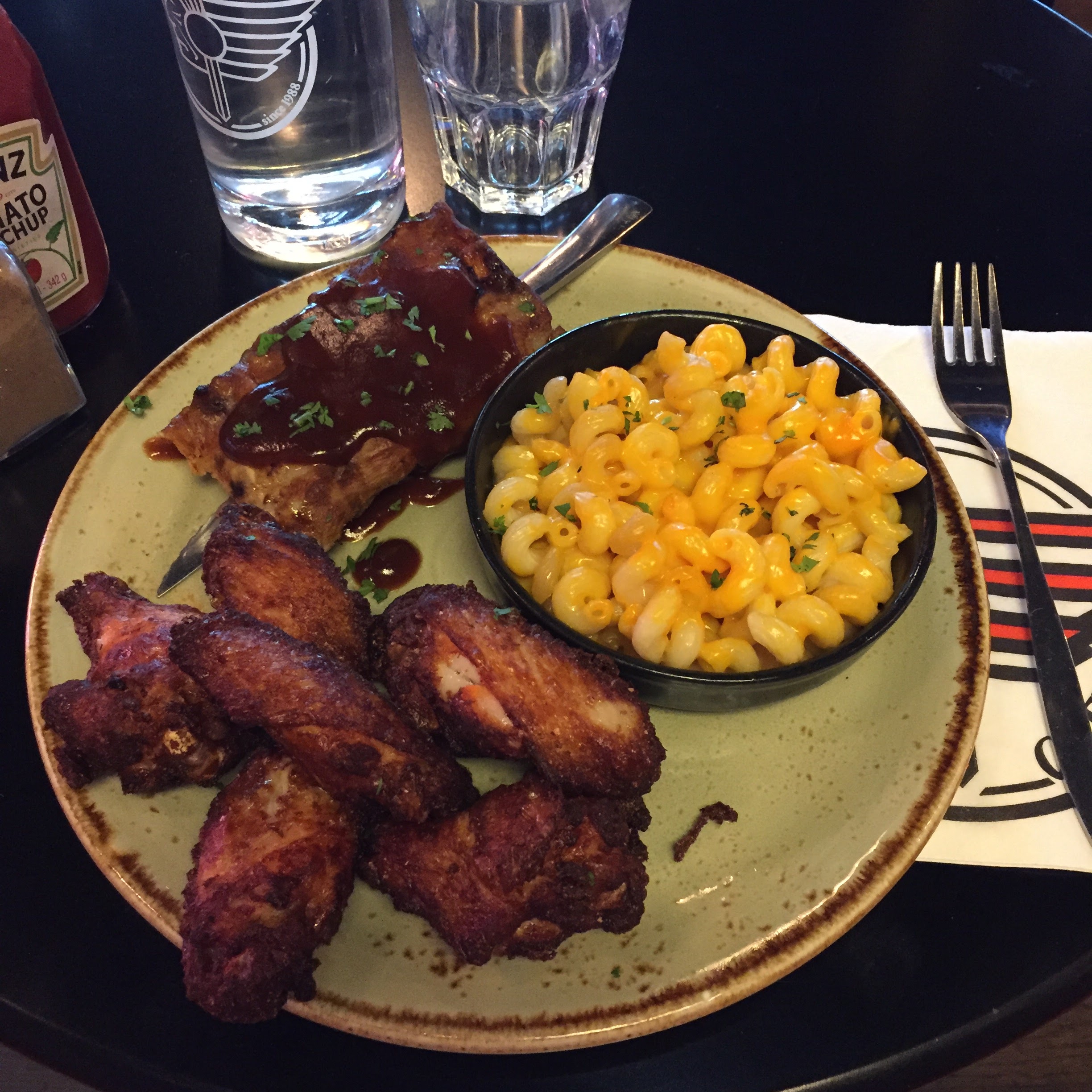 un peu trop cher. les côtes levées au barbecue ont un goût médiocre, mais les ailes épicées sont bonnes.