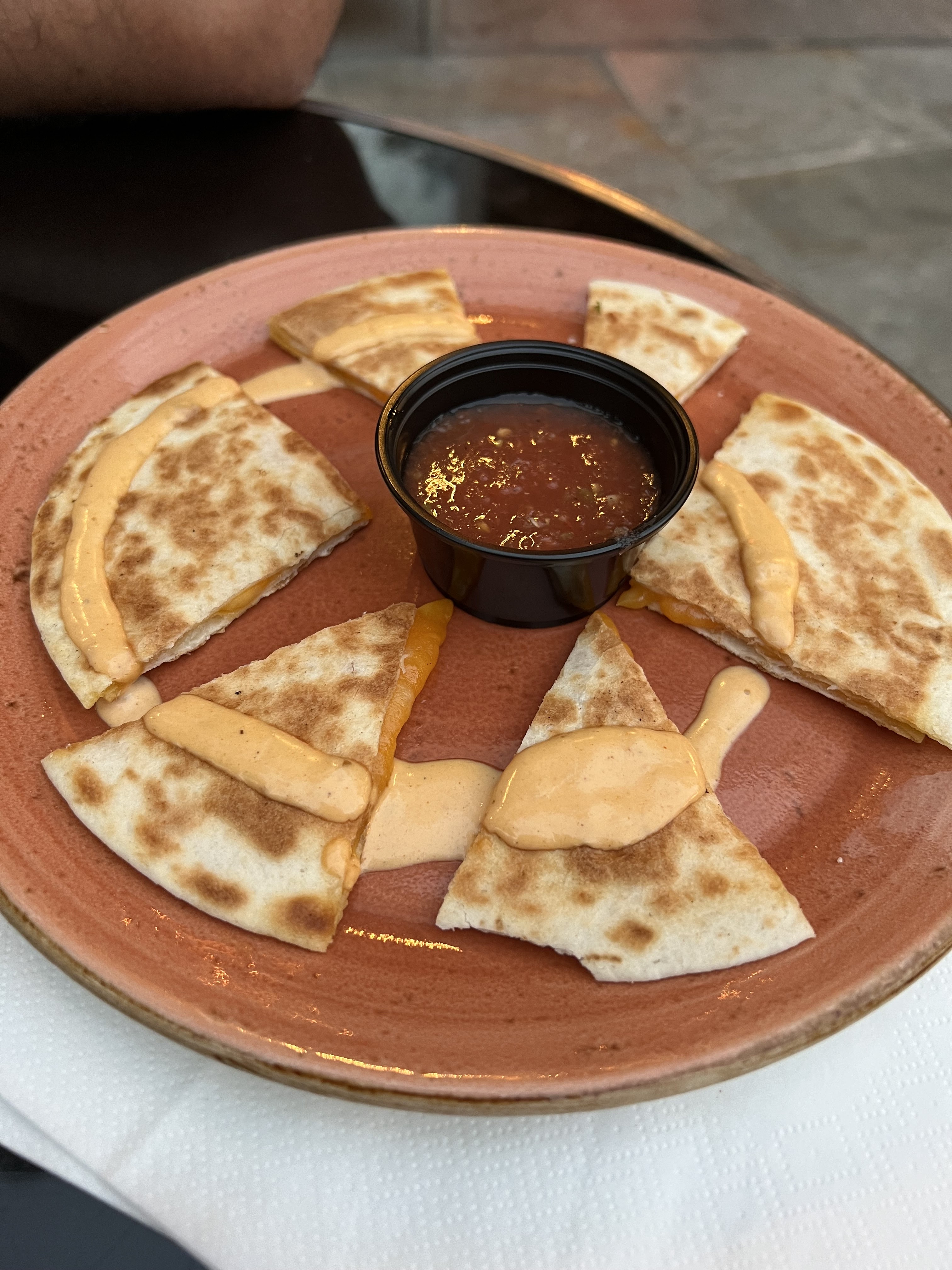 Accueil super sympa, bon endroit bien placé ! Petit bémol, mon verre était fissuré à 2 doigts d'exploser dans mes main tout coulait partout nous avons dû de nous même le redeposer car personne ne venait, et l'assiette de Quesasillas assez légère 😅 c'est dommage il y a un bon potentiel !