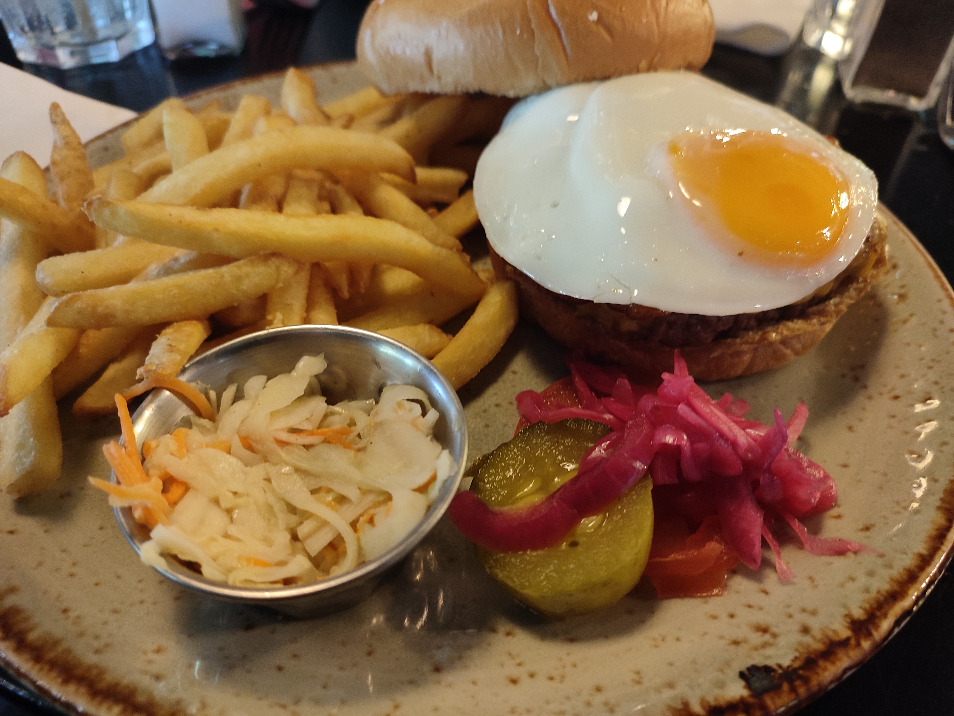 Plat un peu fade et très tiède coleslaw sans sauce, tomate pas mûre , burger végé sans réellement de goût caché par sauce pimentée, rien d'extraordinaire