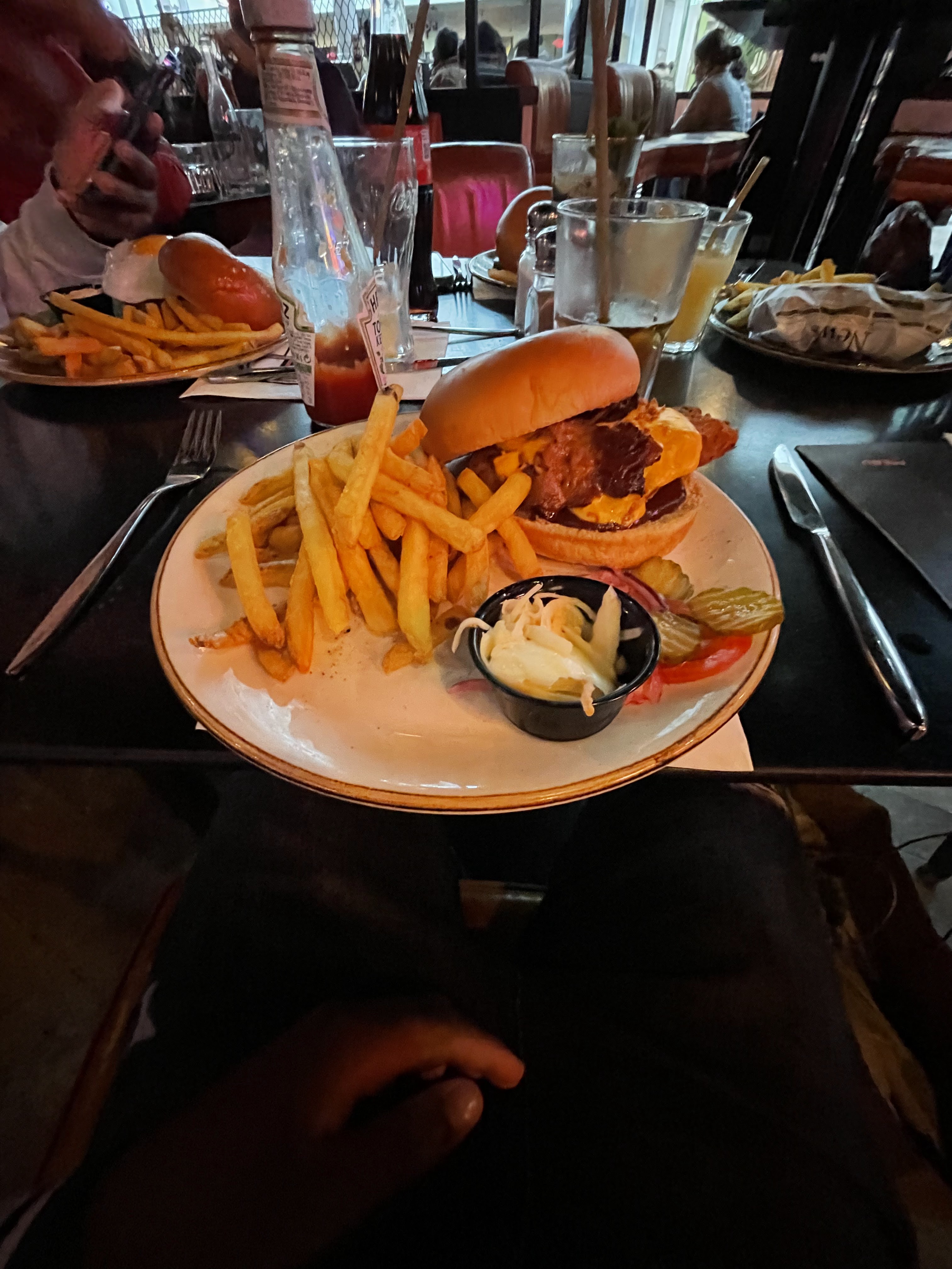 Restaurant propre, pas beaucoup de monde quand nous y sommes allées. Bon service et serveuse à l'affut pour remplir la carafe d'eau. Grosses portions. J’avais oublié de dire que je voulais des frites de patate douce (elle ne nous avait pas demandé si on voulait autre chose que des frites normales) mais elle a vite réglé le problème en m’en apportant dans une assiette annexe. Les burgers étaient bons! Sans faute.