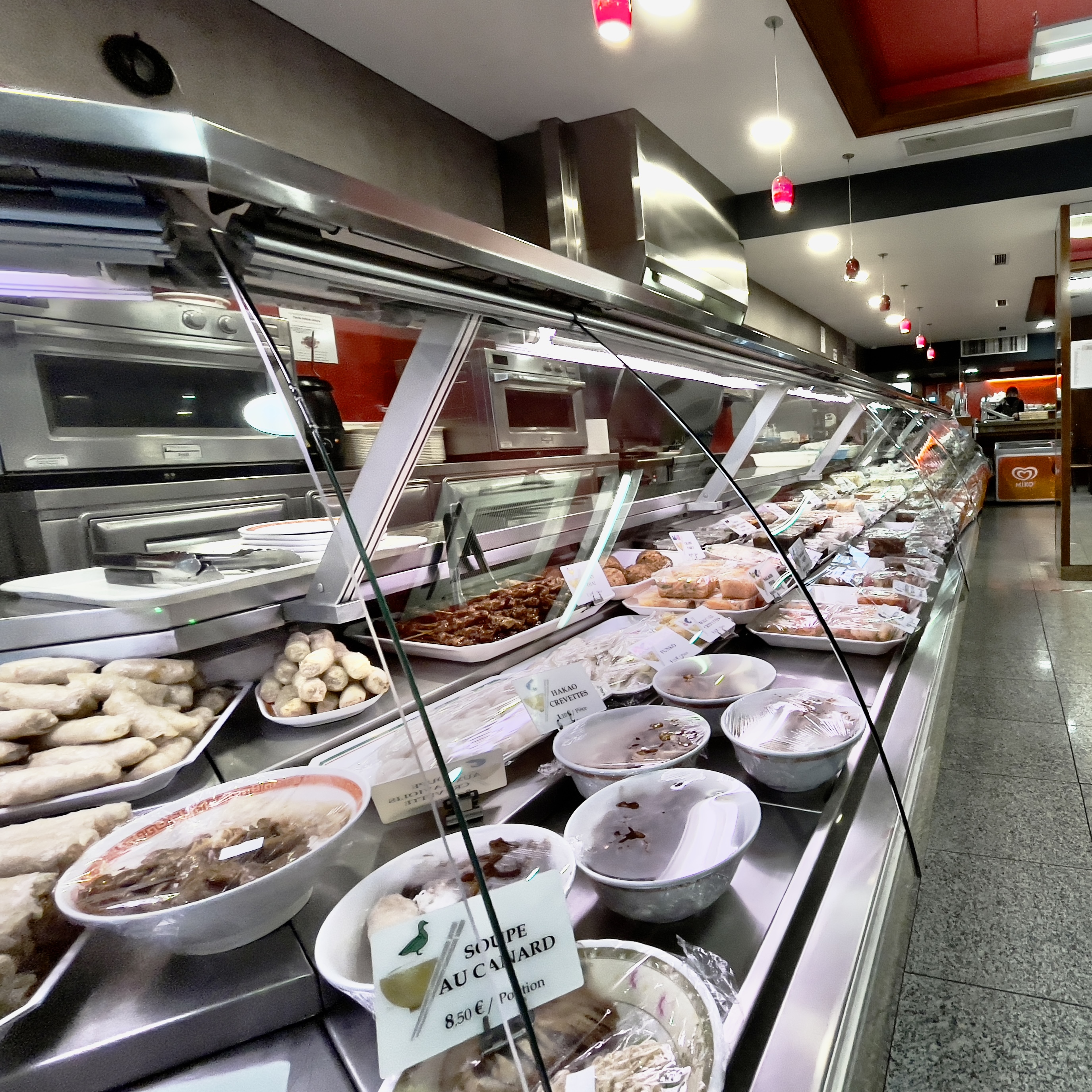 Traiteur à emporter ou consommer sur place. Bon et variés entre 12 et 15 euros si l'on veut de l'entrée au desserts. Sinon juste une assiette de nouilles au poulet pour 5,50 également =) etc..