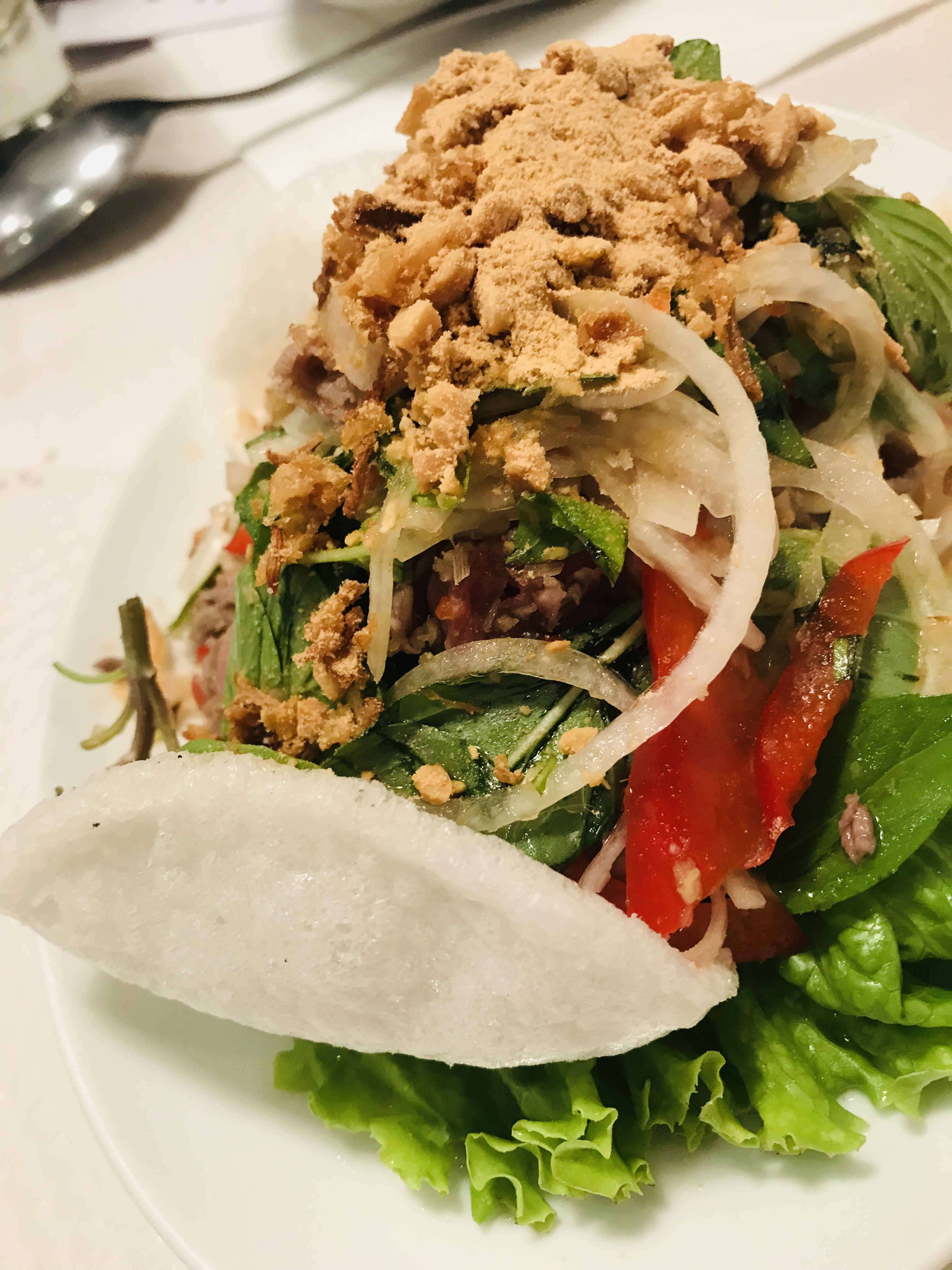 Restaurant délicieux, nous avons mangé un Bánh ướt thịt nướng et des Banh cuon et des crêpes Banh Xeo ainsi le dessert à base de haricots rouges et de lait de coco. Il y a plus de choix de plats vietnamiens que dans d’autres restaurants. Et pour couronner le tout, le patron est adorable. Merci pour le masque.