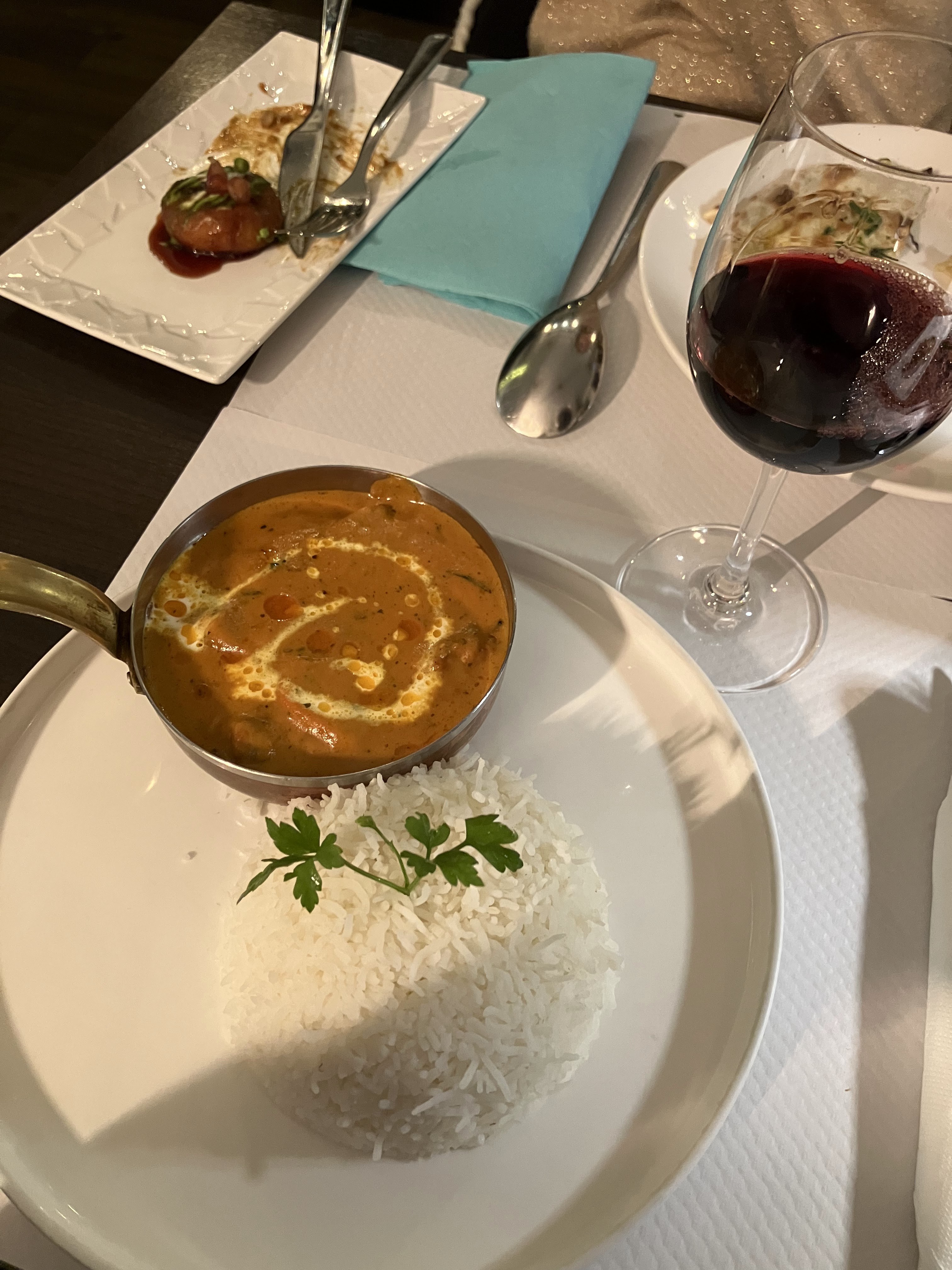 Une expérience 5 étoiles ! C’était super, j’étais déjà venue et j’avais beaucoup aimé, en terrasse en été ! Mais là en plein hiver, j’ai adoré la décoration du lieu, nous avons mangé à 7 et c’était très convivial ! Idéal pour des repas familiaux ou entre amis. Le service est rapide, souriant et très agréable. Les serveurs sont au petits soins! Les plats sont vraiment bons, mention spéciale pour le butter chicken, le Cheese nan bien cuit et la sélection de vins : côtes du Rhône et pinot noir. Assiettes bien présentées avec le riz en dôme Je recommande vivement ! A bientôt
