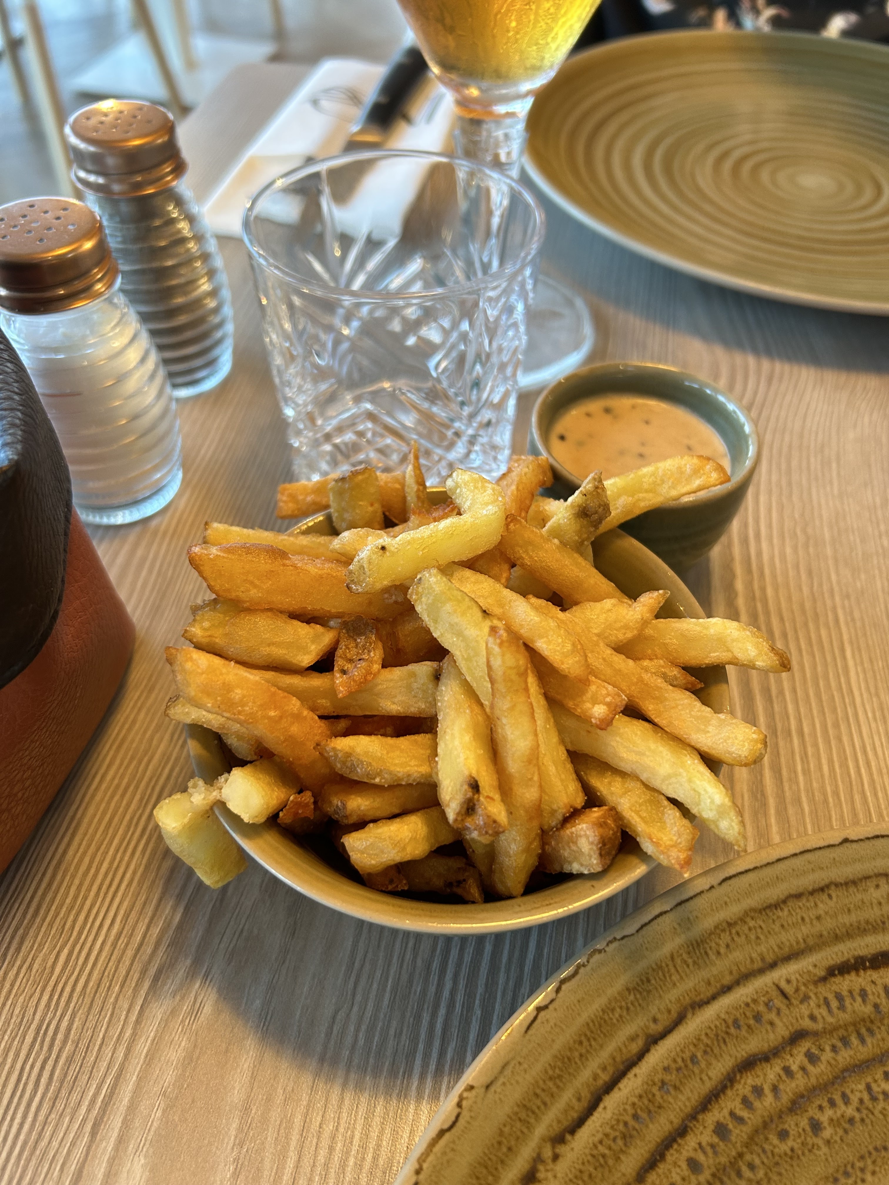 Rien à redire sur l'accueil et le contexte. Par contre le service est long, l'accompagnement de plats est en supplément donc on paye 27€ pour un filet de bœuf minuscule ( qui est très bon quand même mais à un goût de trop peu )et il faut rajouter 5€ pour avoir des frites soi-disant fraîches mais qui sont surgelés en réalité. Et si on demande un accompagnement car il n'est pas automatiquement proposé par le serveur donc je me suis retrouvée avec petit filet de bœuf et rien avec. Après réclamation mes frites sont arrivées mais j'avais déjà bien-sûr fini mon filet. Je ne recommande et n'y retournerai pas.