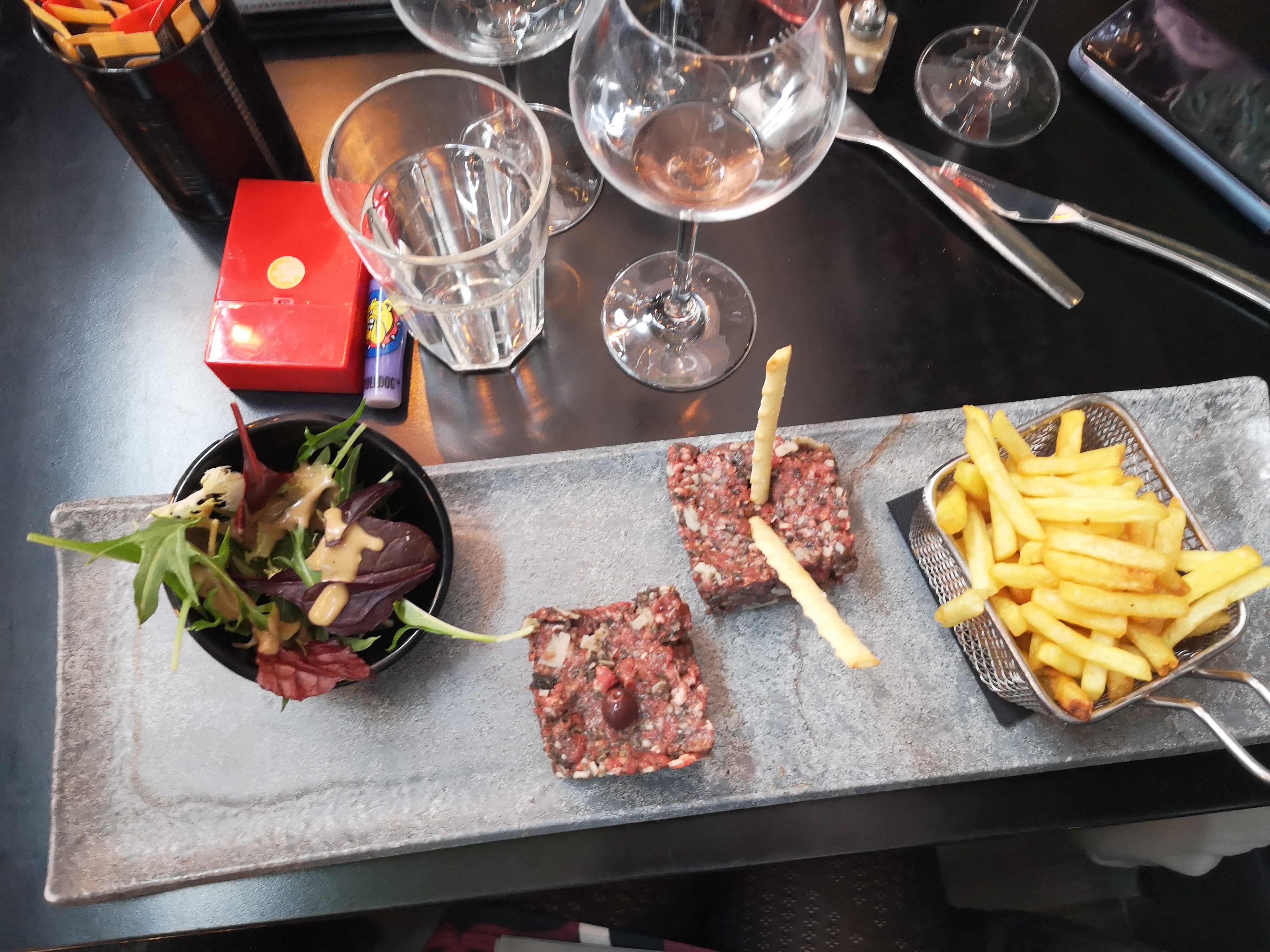 pour notre anniversaire de mariage nous avons choisi votre restaurant accueil super sympa quand au tartare plutôt restreint je pense pas que le poids est en dessous de la norme quand aux frites grillées et froides on a évité le dessert dommage les autres fois c'était un sans faute