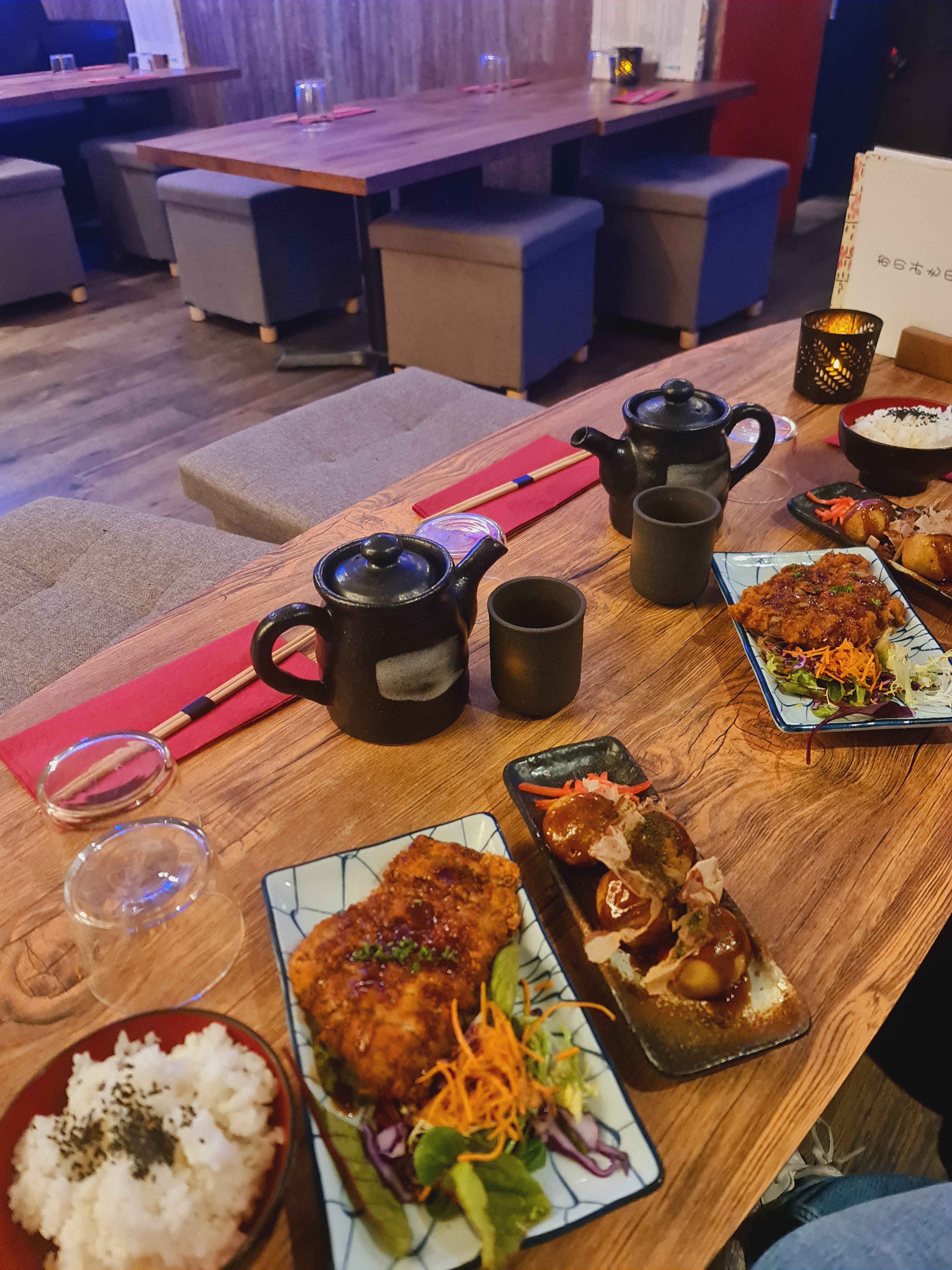 Immersion dans un restaurant typiquement japonais, avec des tables basses ou il est possible de s'asseoir sur des tatamis . Formule proposé durant le midi à 15eu , et en soirée ambiance tapas .