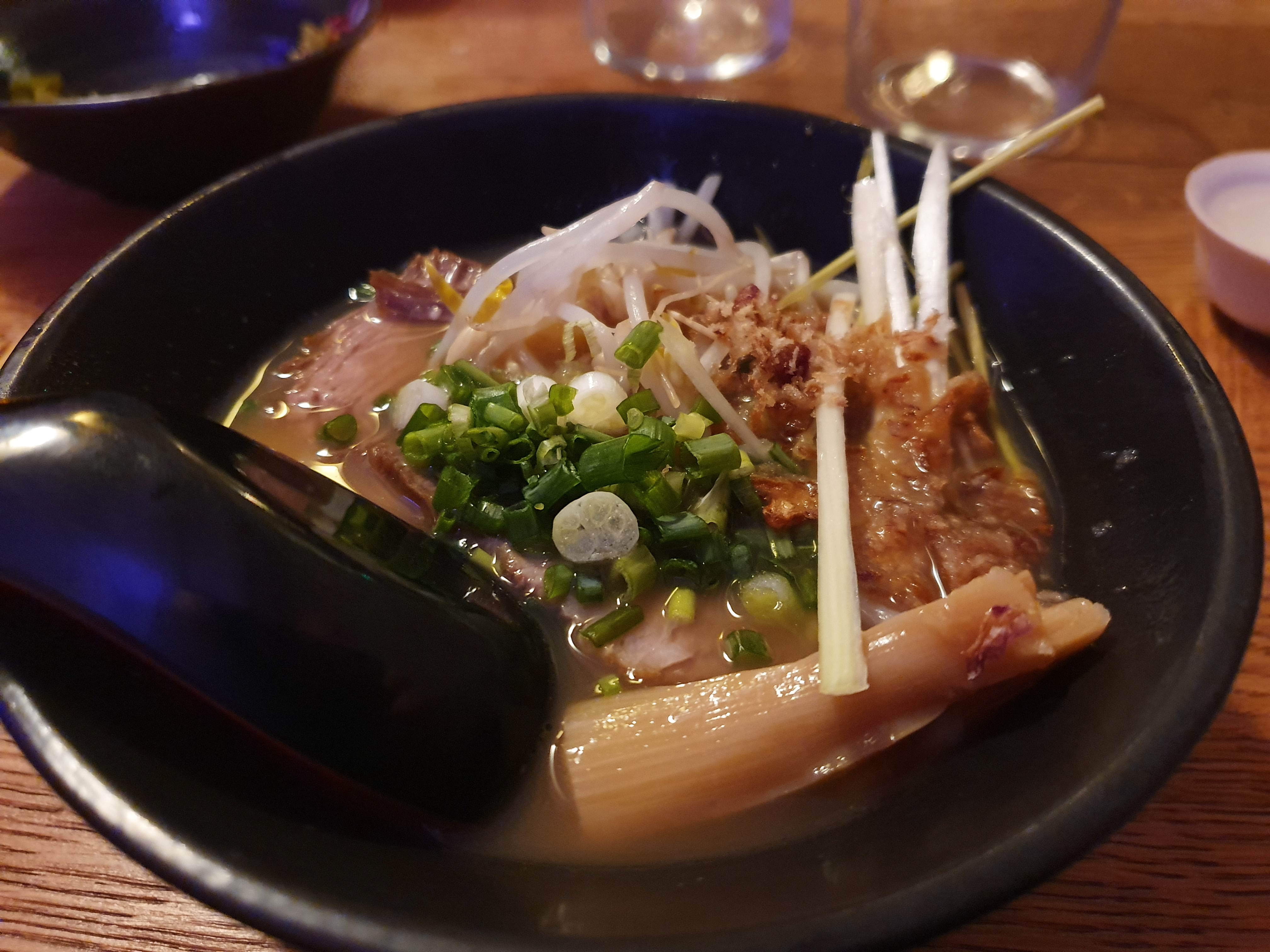 Un régal ! Les padrons grillés avec les lamelles de bonite qui bougent avec la chaleur c'était magique et délicieux ! Les ramens étaient top! On a dégusté plein de saveurs différentes. Pas hyper emballés par la grosse croquette à base de pommes de terre qui est impossible à déguster avec des baguettes (ou on n'avait pas le mode d'emploi...) sinon tout ce qu'on a pris était très bon et j'ai hâte de goûter le réseau de la carte. Bon, la carte est un peu complexe et nécessite beaucoup d'explications du personnel qui est tout à fait charmant et donne toutes les précisions nécessaires qu'ils connaissent par cœur...mais tout est inconnu, à la fin j'avais déjà oublié les explications du début. Les habitués doivent savoir ce qu'ils auront dans l'assiette, les aventuriers apprécieront la prise de risque, mais pour les chipoteuses comme moi ce n'est pas évident de choisir. Petit bémol pour le timing. On se fait doucement pousser dehors à 21h pour qu'ils enchaînent sur le 2eme service. On a envie de goûter encore plein de choses, les ramens qui ne sont pas préparés avant une certaine heure, mais du coup on n'a pas et le temps de goûter les desserts... En vrai on avait tellement bien mangé qu'on n'avait plus vraiment faim et on était contents de rester sur les ramens.