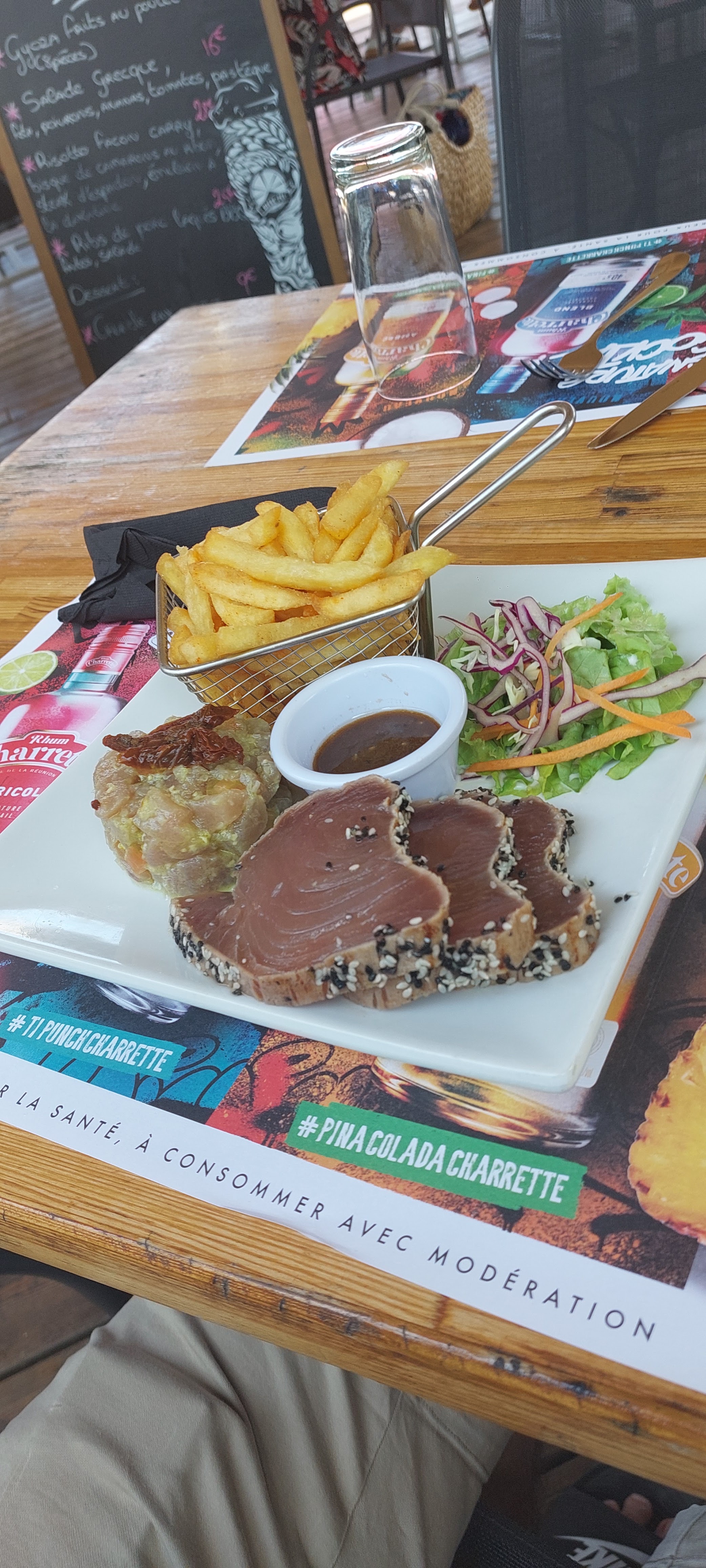 Cadre et personnel super sympa, mais le service est un peu long. J'ai pris un tartare de thon et je trouve qu'il manquait un peu de Pep's. Les frittes maison auraient mérité d'être accompagnées d'une mayonnaise maison.
