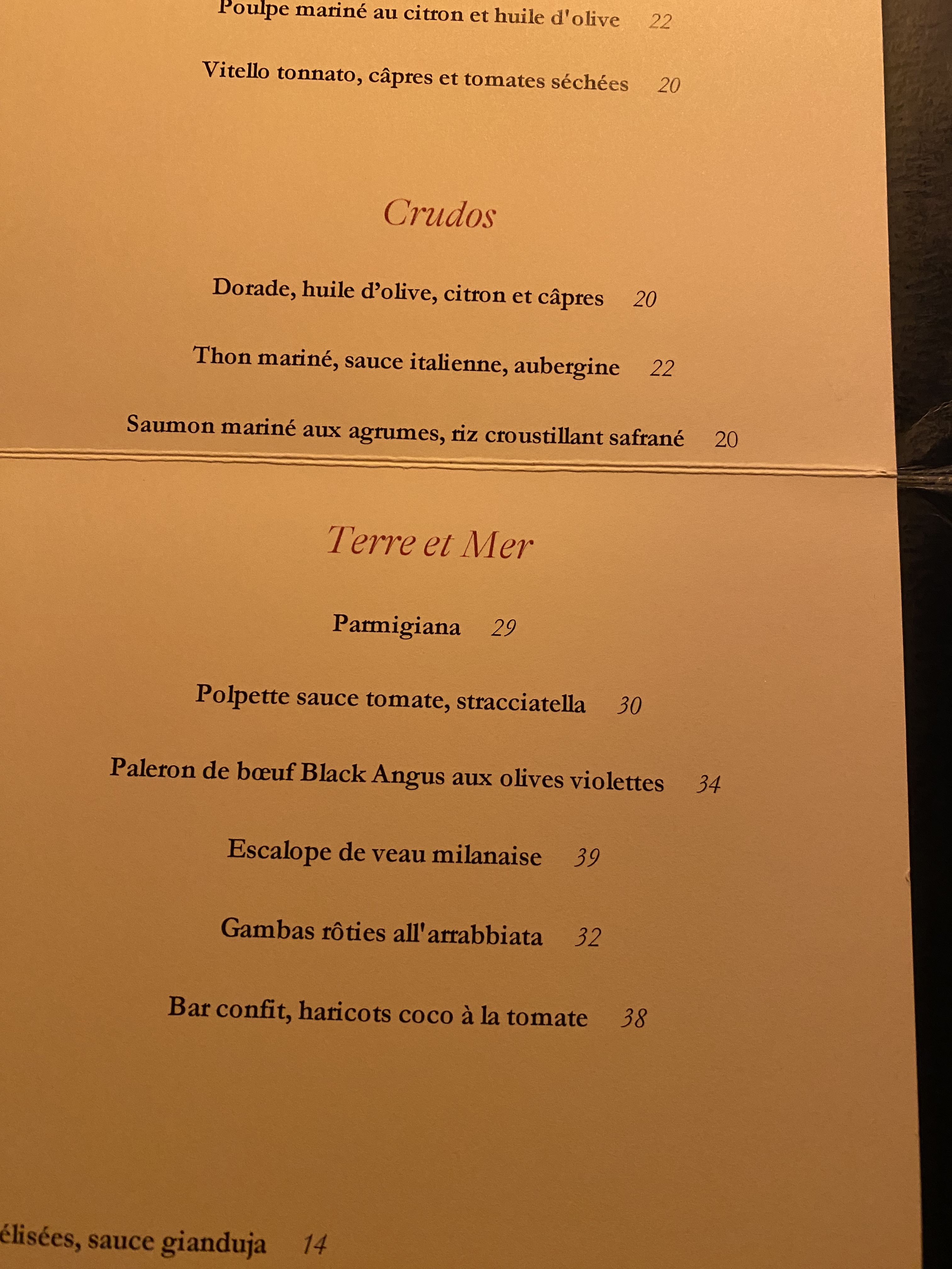 Si la cuisine est très bonne elle n’avait rien d’origine ni très élaborée, nous avons trouvé les tarifs beaucoup trop élevés comparé au contenu des assiettes. Aussi, sur certains entrées/plats ou desserts les quantités sont parfois légères en sommes la générosité à l’italienne n’est pas toujours au rendez-vous. Concernant le cadre, le restaurant est joli mais assez bruyant et les tables sont assez proches donc pas très intimiste. Nous y avons tout de même passé un agréable moment.