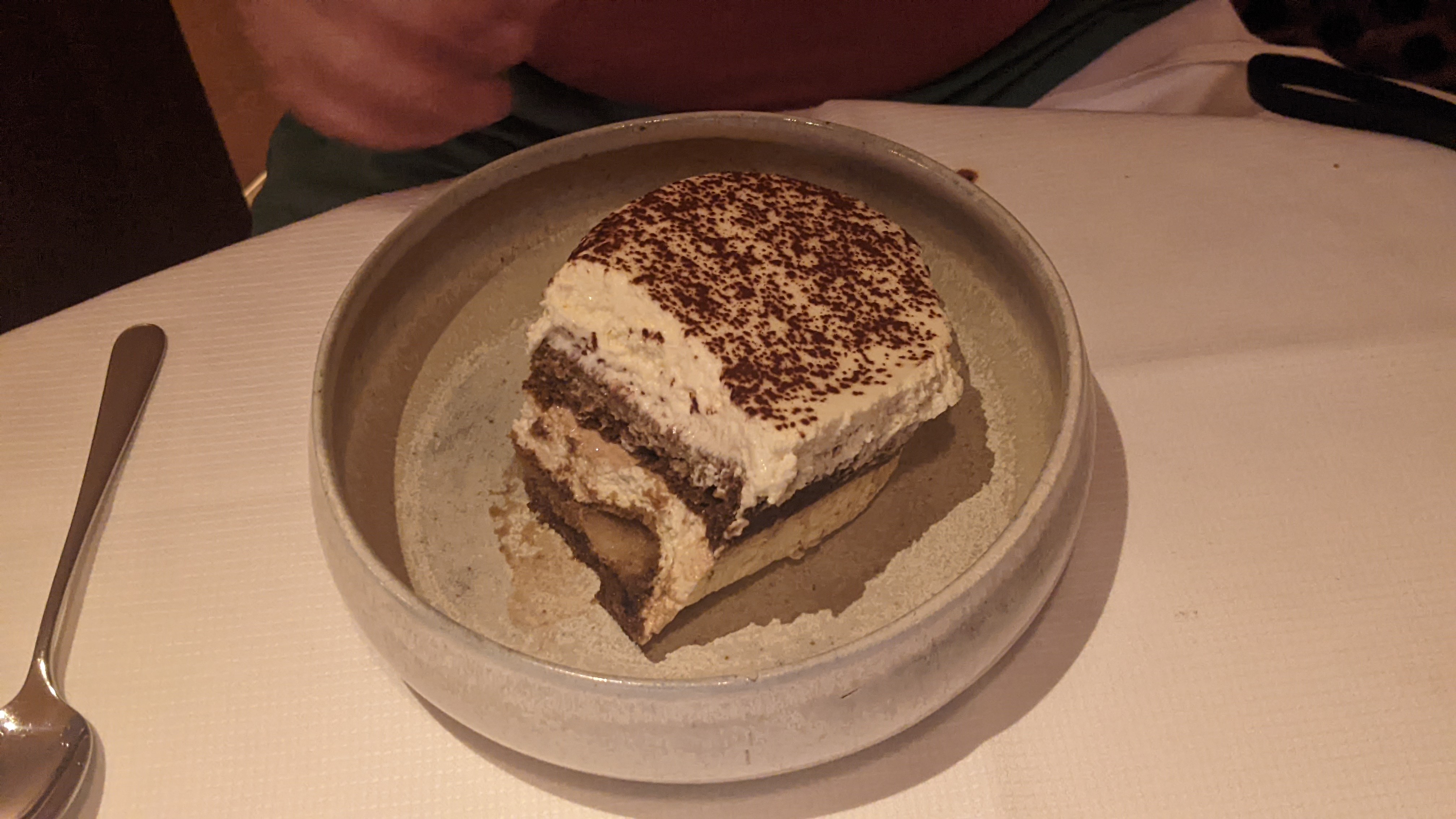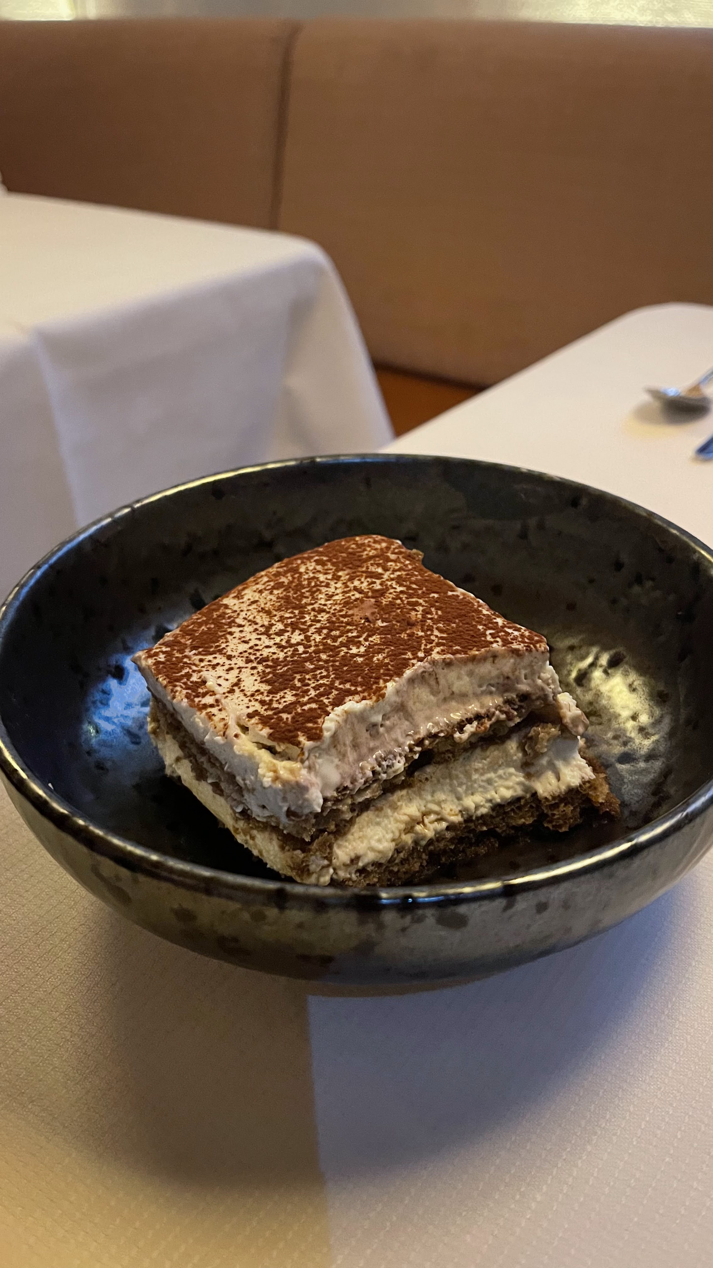 Nous avons passé un excellent moment dans ce restaurant, malgré notre retard nous sommes merveilleusement bien accueilli. Le repas sans fausse note, de l’entrée au dessert. Nous n’avons pas opté pour le tiramisu en dessert en revanche nous l’avons aperçu à la table voisine, la présentation est certainement à revoir ?