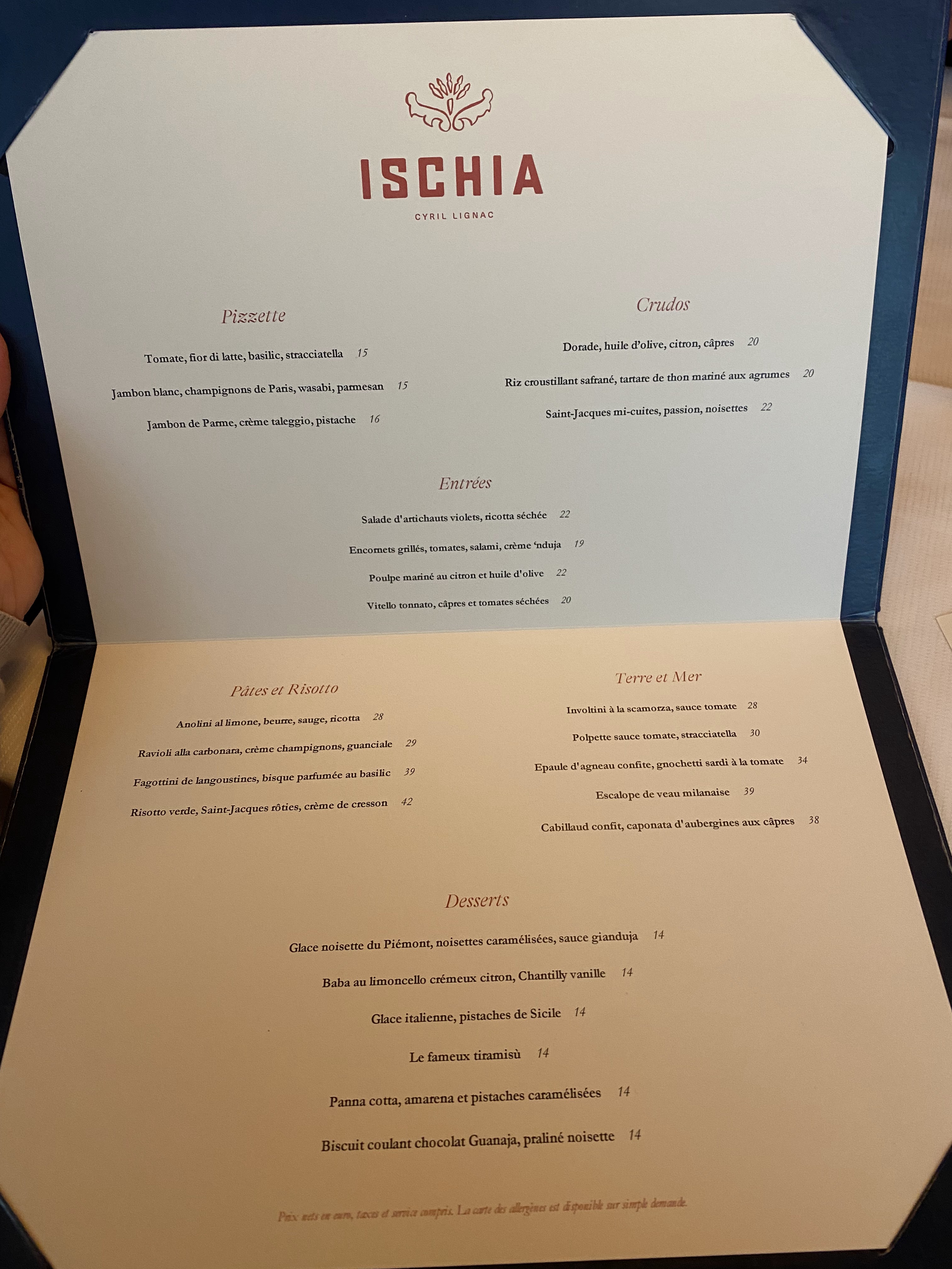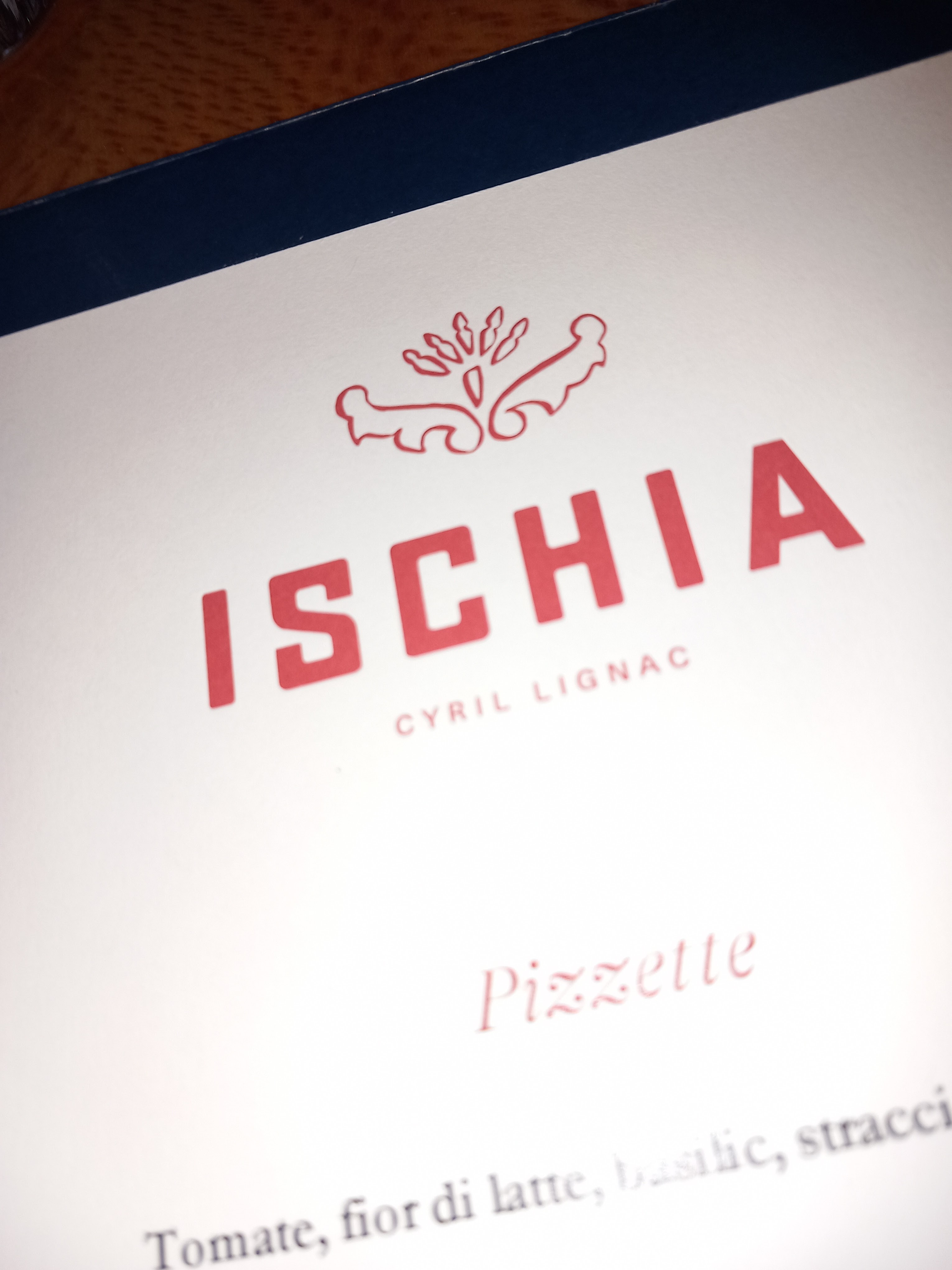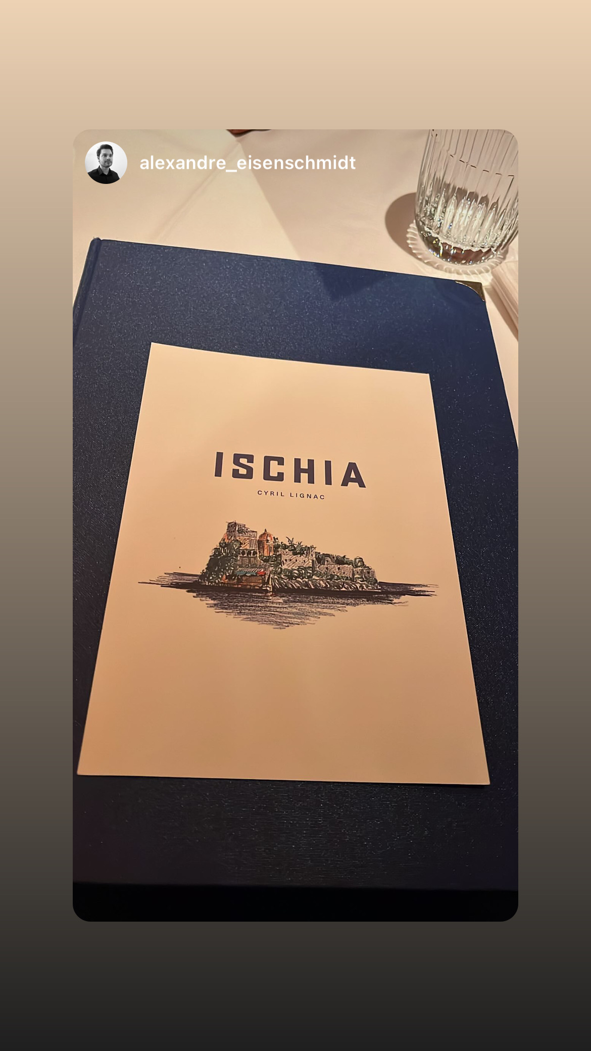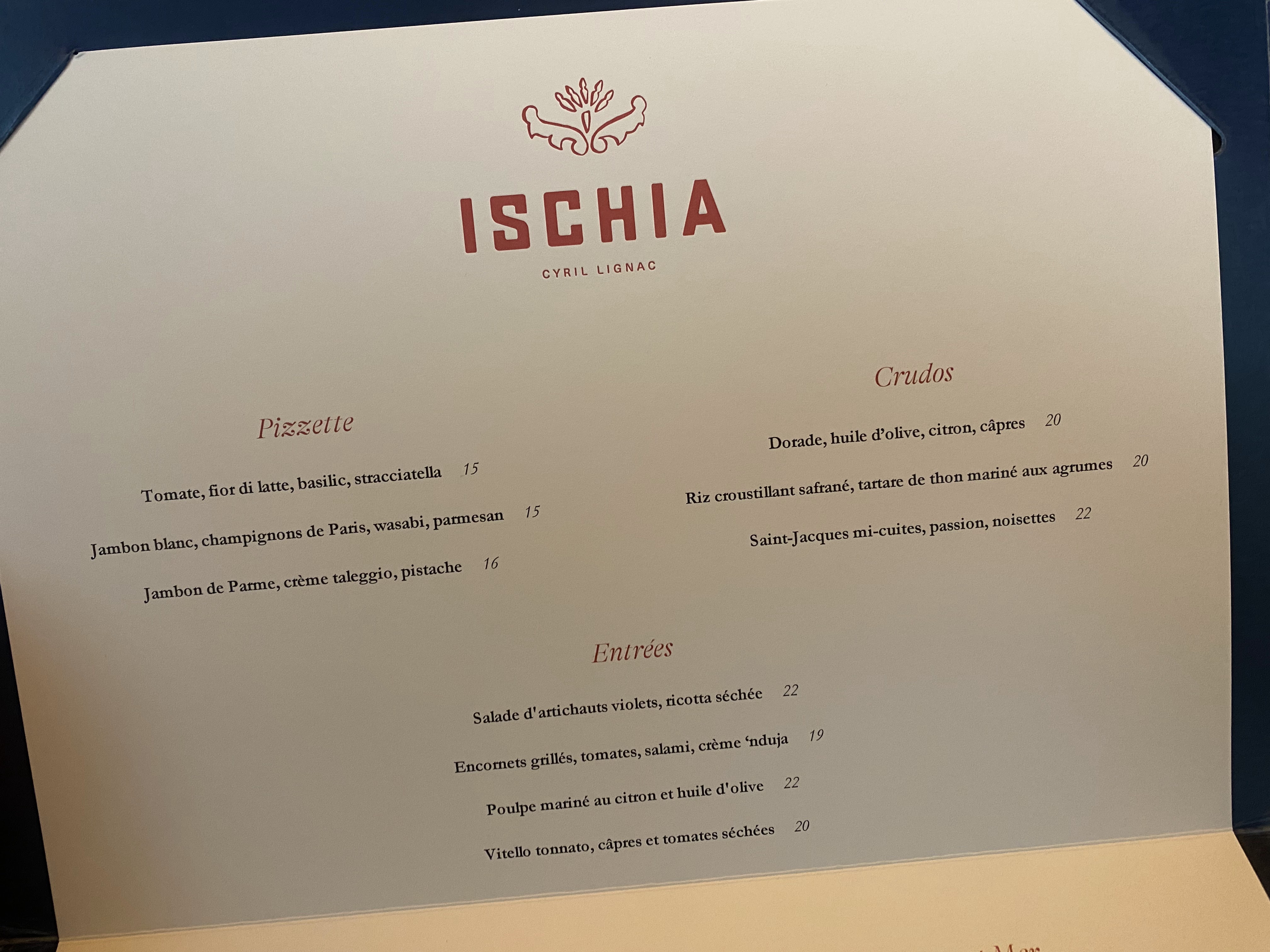 Ischia fait partie des restaurants appartenant à Cyril Lignac. Ischia est situé à l'emplacement de l'ancien restaurant étoilé qu'il possédait. La qualité des plats est très correcte et du même niveau que celle rencontrée dans les autres restaurants du groupe avec par exemple un excellent paleron de bœuf Black Angus. On y retrouve le style Cyril Lignac. Le service est convivial mais un seul regret, des prix un peu élevés.