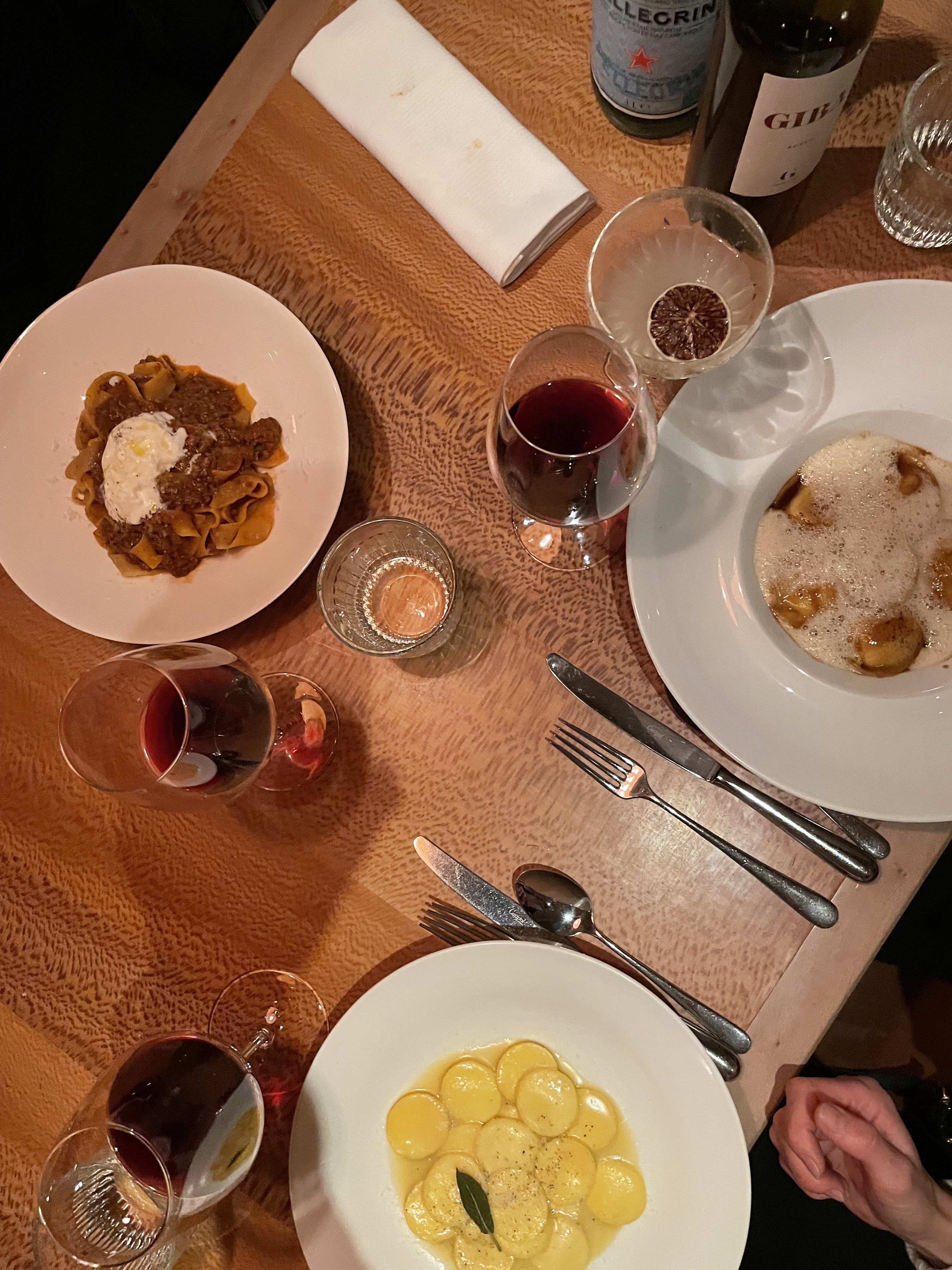 Des entrées simples et copieuses (pizzettes, burrata, Vitello), des plats de pâtes recherchés et délicats avec des portions de restaurants gastronomiques (coup de cœur pour l’anolini) dès 18€ et des desserts dignes du chef pâtissier Lignac pour 10€ (Jamais mangé une glace aussi onctueuse que sa glace noisette). Attention, il faut comprendre que vous ne devez pas y aller pour manger juste un plat avec une boisson, vous resterez sur votre faim. Pensez à prendre une ou deux pizzettes à partager et un dessert pour vivre l’expérience à fond. Les prix nous le permettent ! La décoration est très épurée et recherchée à l’intérieur, plus simple (style trattoria) à l’extérieur. Cyril Lignac est venu à notre table nous expliquer un peu plus son concept et comment il avait pensé le restaurant. Bref une belle soirée avec un chef accueillant et facile d’accès dans un restaurant proposant une véritable expérience culinaire digne d’une trattoria revisitée.