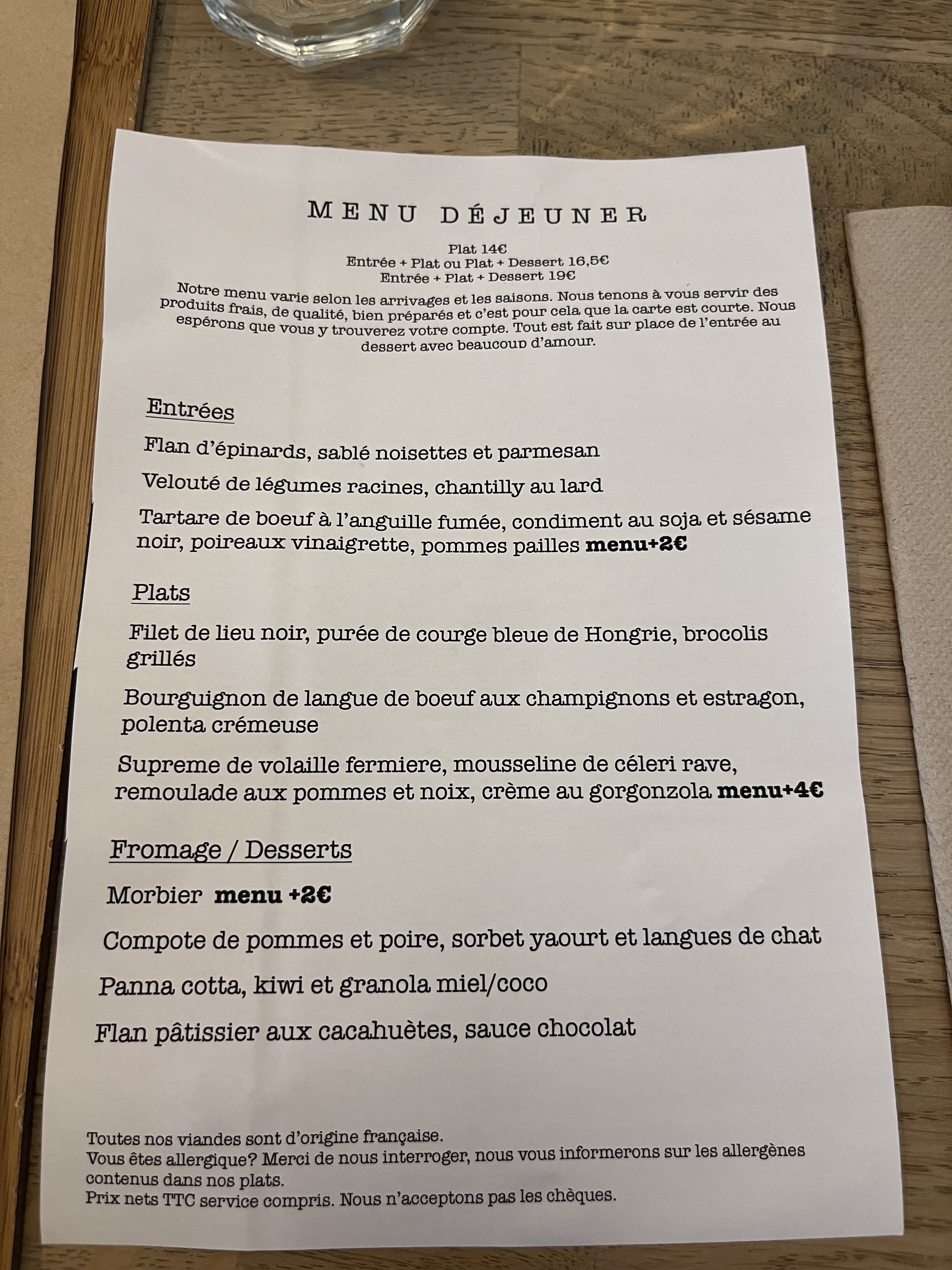 Entrée + plat 15,5€ Équilibré et subtile, ils ont réussi à me faire aimer des aliments que je n’aime pas de base. Carpaccio de betterave et flan épinards surprenant mais délicieux ! J’y retournerai!
