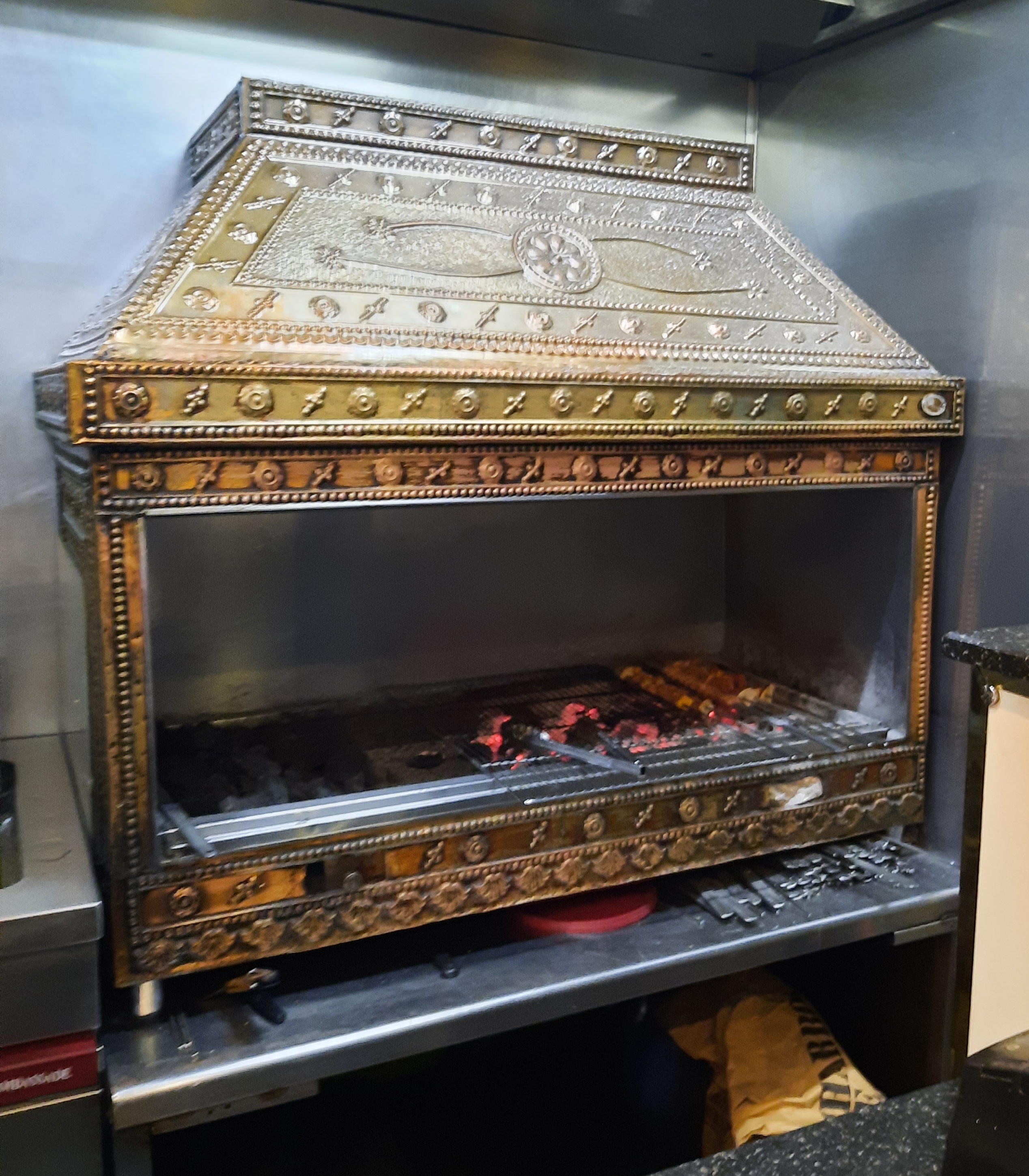 Cuisson sur feu de charbon de bois, très bons ingrédients, personnel agréable.