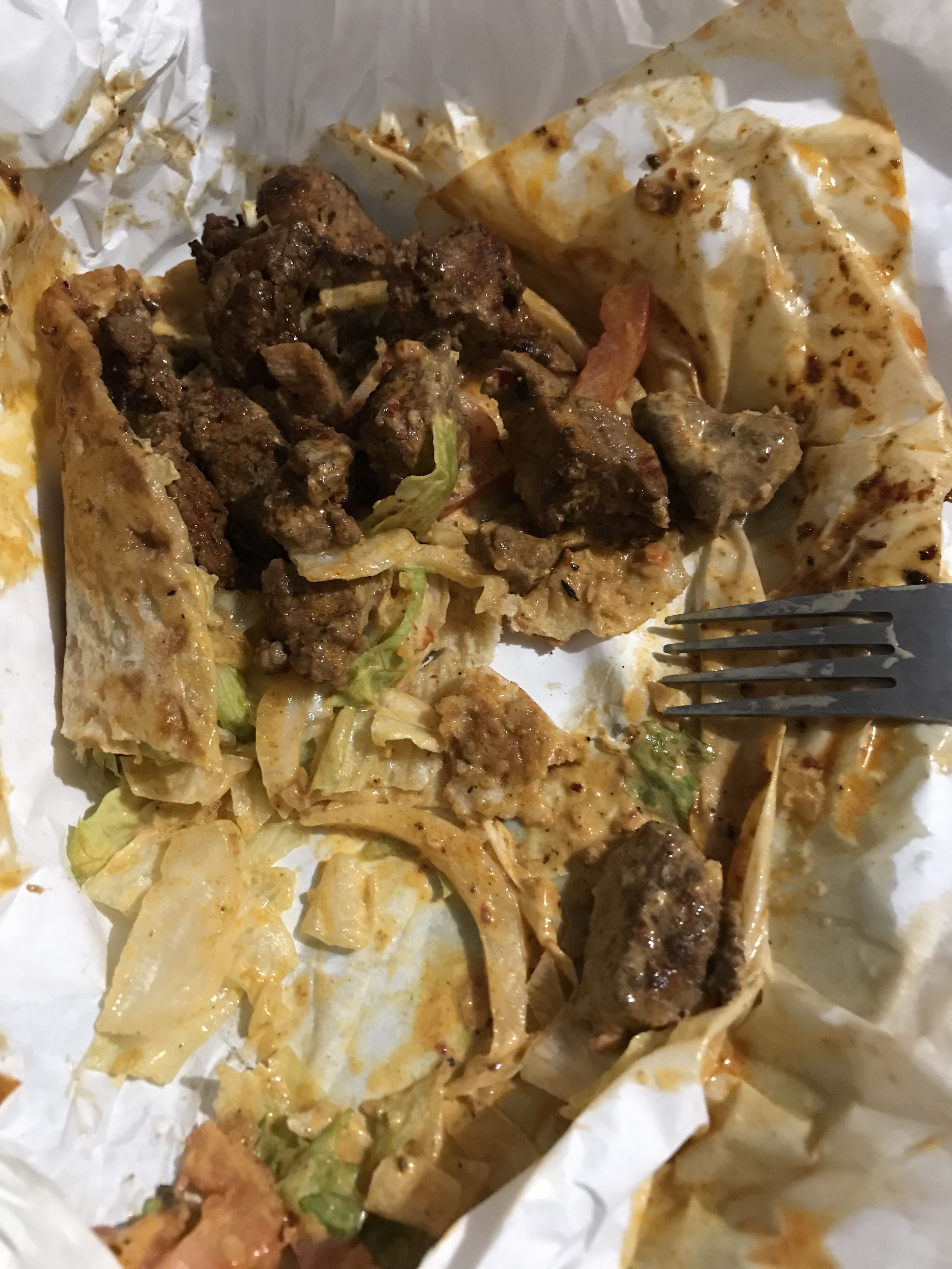 Plus jamais. Froid. Galette Nan froide et plastifiée. J’ai demandé de l’agneau je suis sûre que s’en n’est pas. Aucune tenue. Impossible à manger sans couverts: etalé, coulé, passé à travers la galette. A emporter mais impossible à manger dans la rue. Honteux. Je me suis faite avoir une fois. Je ne reviendrai jamais. On aurait dit une présentation pour un animal. Voir photo.