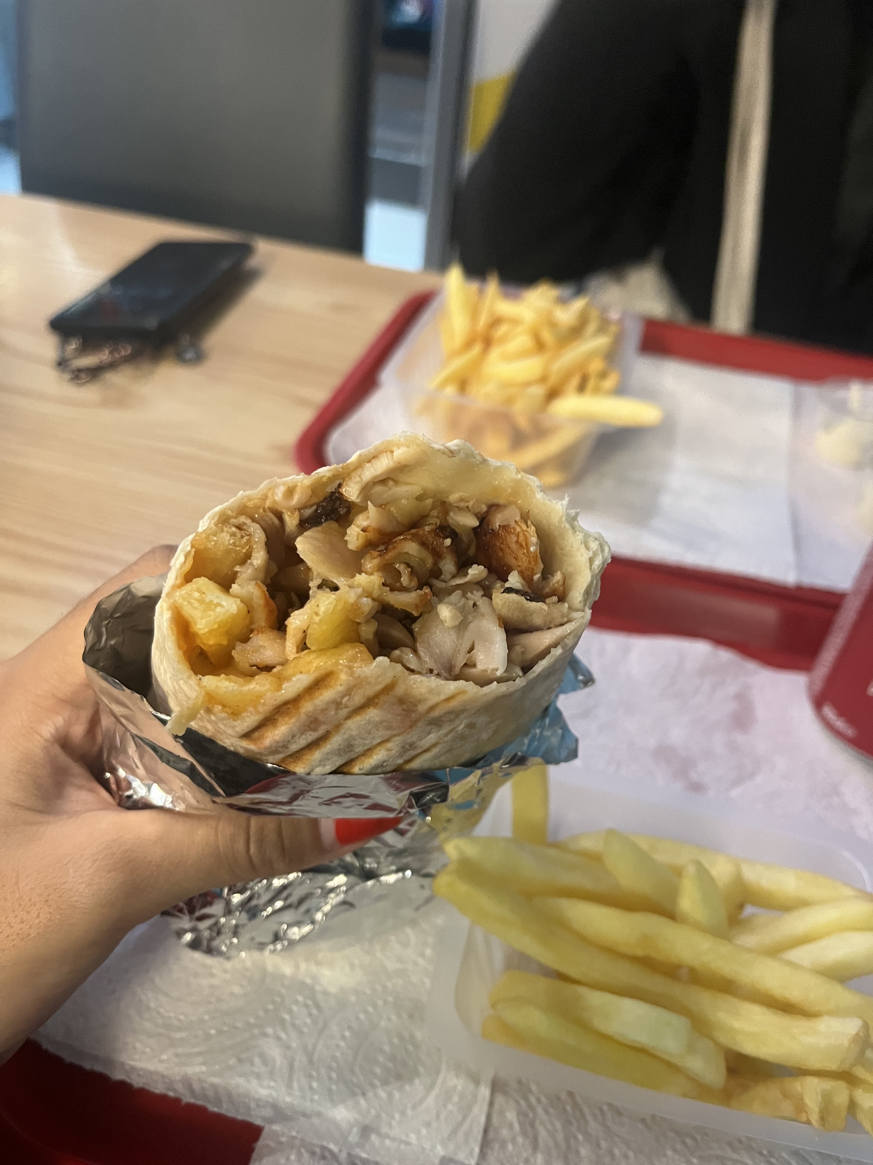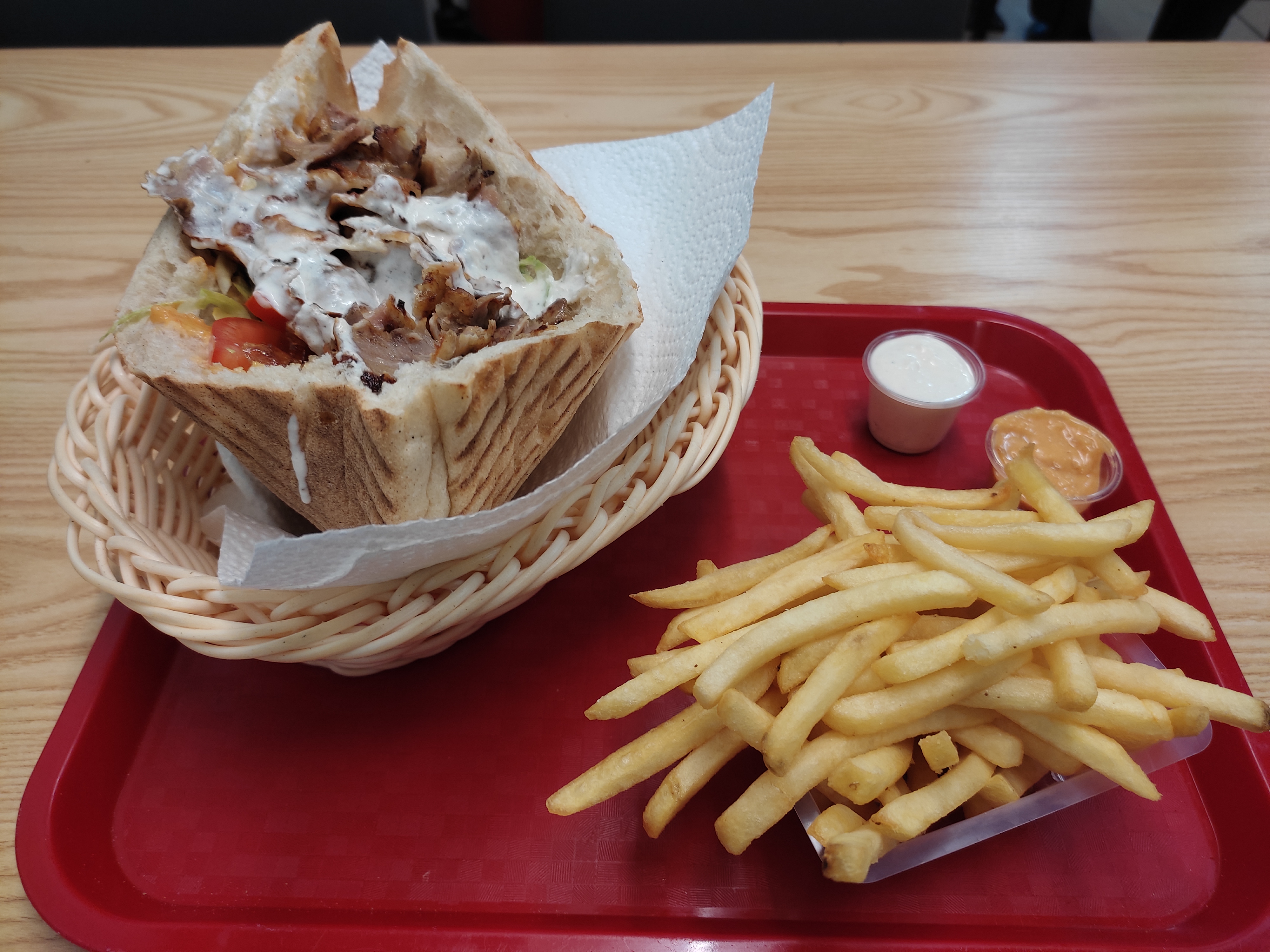 Kebab bon et pas cher à Lyon, j'ai pris le menu kebab qui comprend : kebab piadina, frites et boisson gazeuse. Les portions sont généreuses mais la piadina était un peu caoutchouteuse. Il n'y a pas de salle de bain, ils acceptent les cartes.