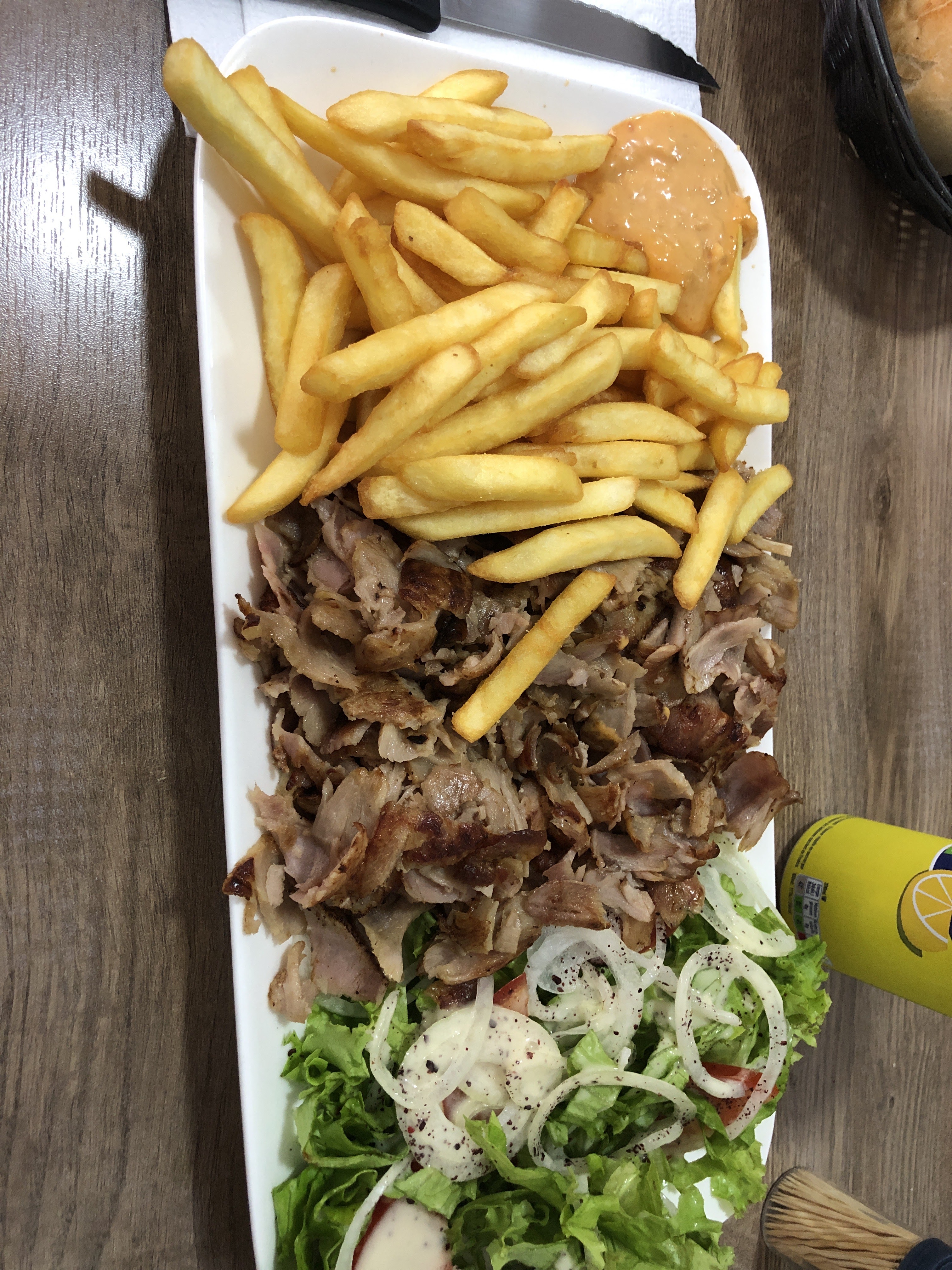 Pris kebab complet avec frites 7.5€ par personne. Crudités fraîches, viande et pain excellents le kebab était très bien garni nous nous sommes régalés 😋