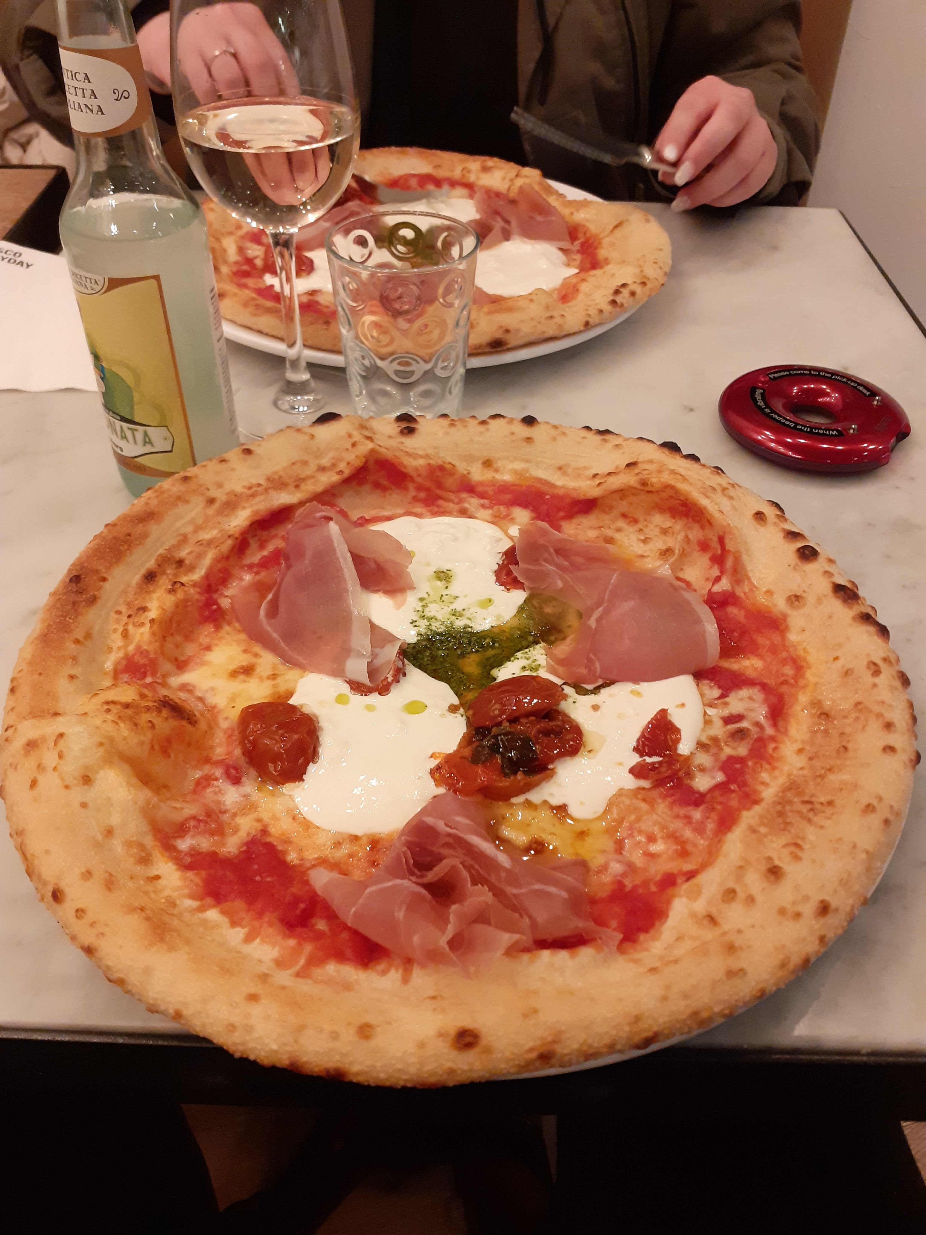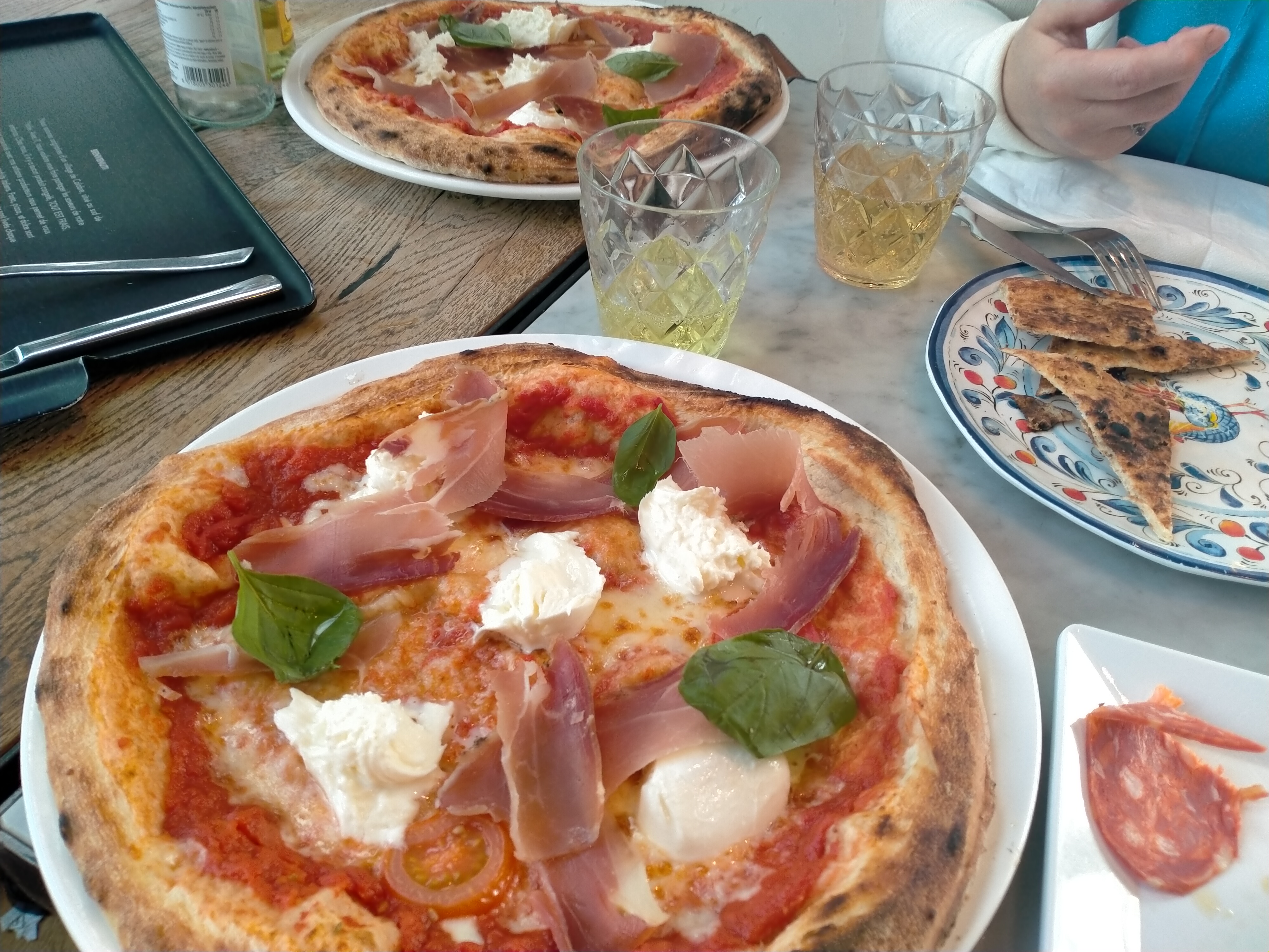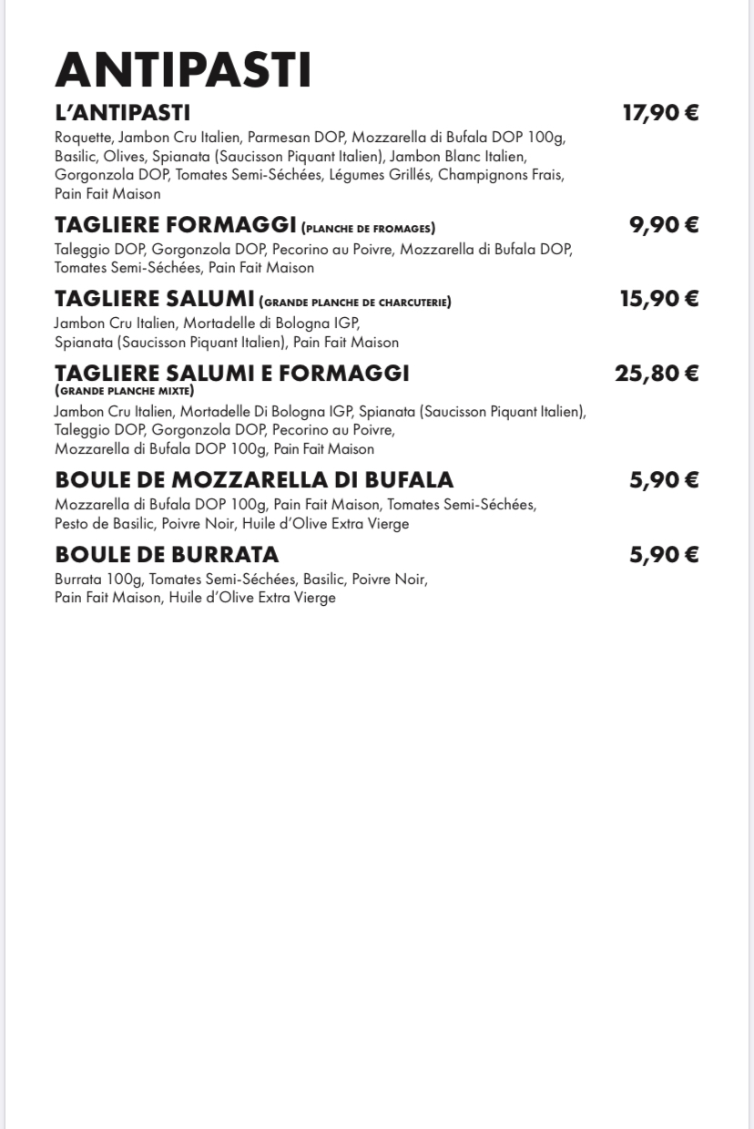 Points positifs: - Très bon accueil, très professionnel. - Très beau restaurant. - Le dessert (tiramisu au caramel) était délicieux. - Les boissons sont correctes et l'employée nous a bien conseillé sur les vins. Points négatifs: - Dans les cuisines ouvertes... le cuisinier était sur son téléphone, il s'est ensuite touché le visage (sans masque, ou du moins sous la bouche) et a préparé les pizzas... sans se laver les mains. - extra/ jambon sec = 3,50€ pour trois fines tranches de jambon sur la pizza - pizza à la burrata/ sans la quantité de burrata affichée sur la carte, on voit sur la photo qu'il n'y a que trois cuillères de burrata (qui était liquide) Dans l'ensemble je recommande, mais l'hygiène est à revoir et le rapport qualité/prix est un peu haut.