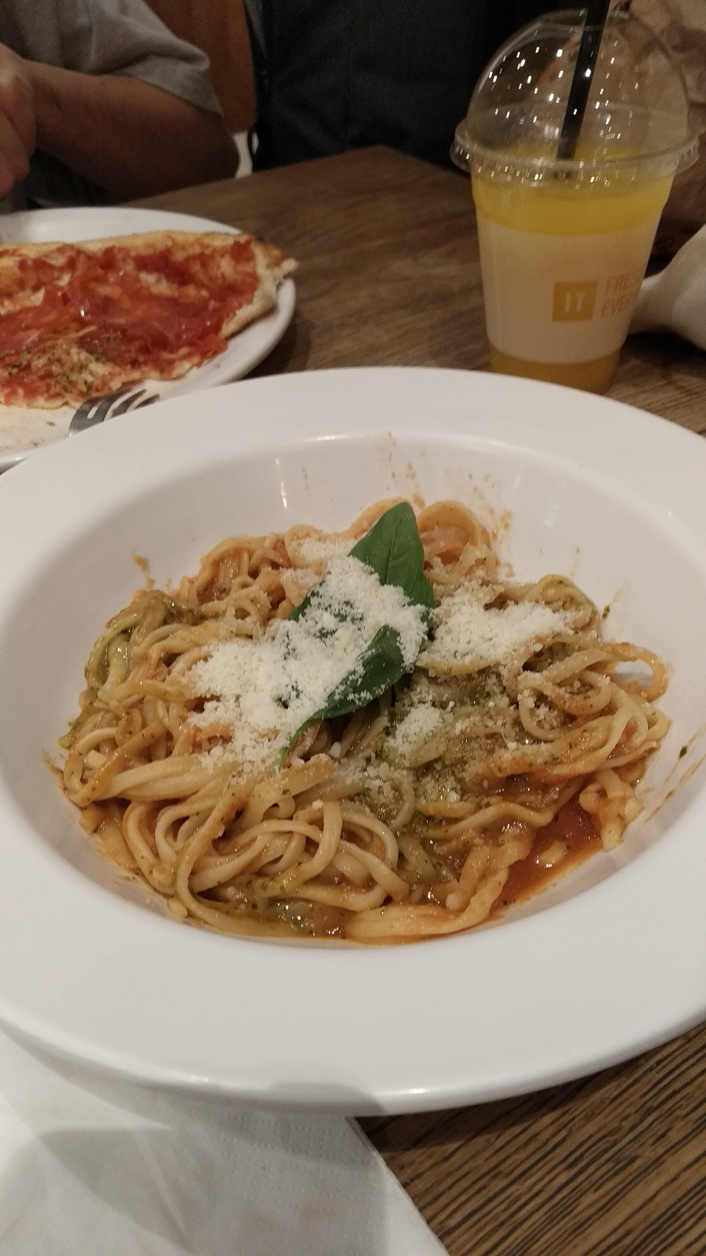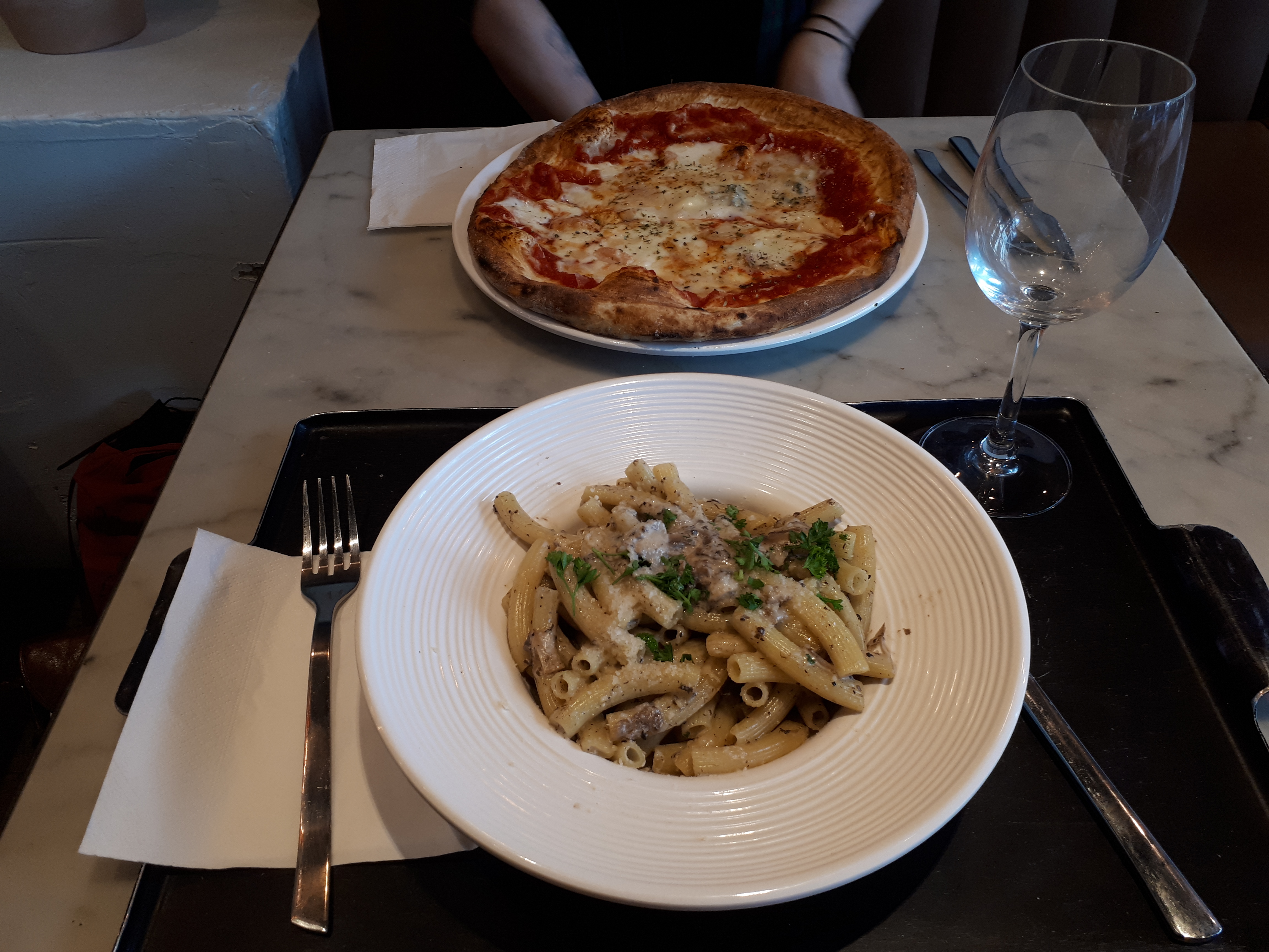 Overall 📍: le restaurant et la décoration sont très soignés. Malheureusement la salle est très bruyante. L'espace est assez restreint. Food 🍕 : les pâtes sont bonnes, il faut préférez une version XL car les versions normales ne sont pas très grande. Les pizzas sont très bonnes, parfaites pour les amateurs de pâtes fines. Drinks 🍸: les jus sont délicieux et le vin blanc correct. 🤩 Plats copieux ? Pensez au 🐕 bag si vous n’avez plus faim !