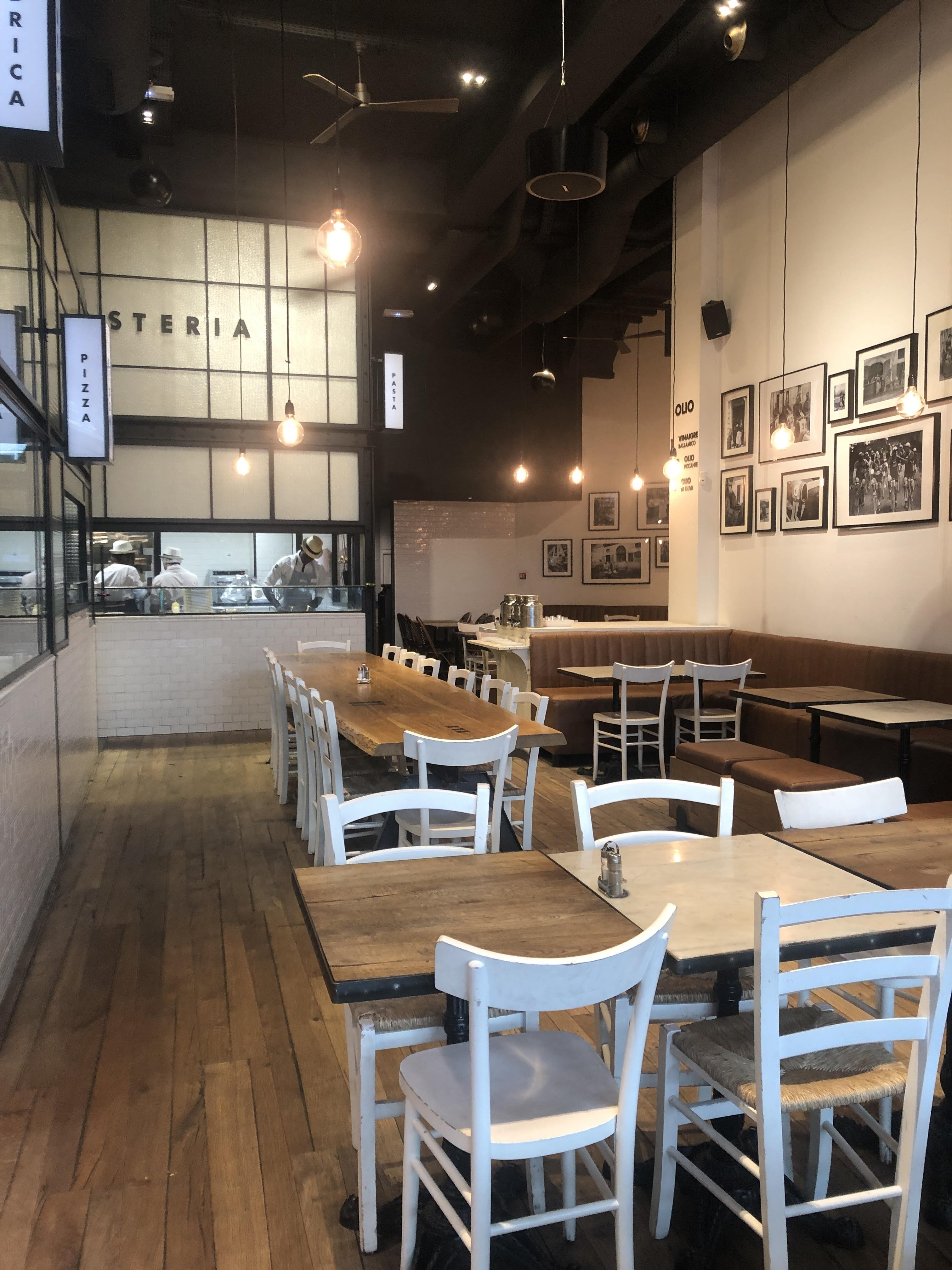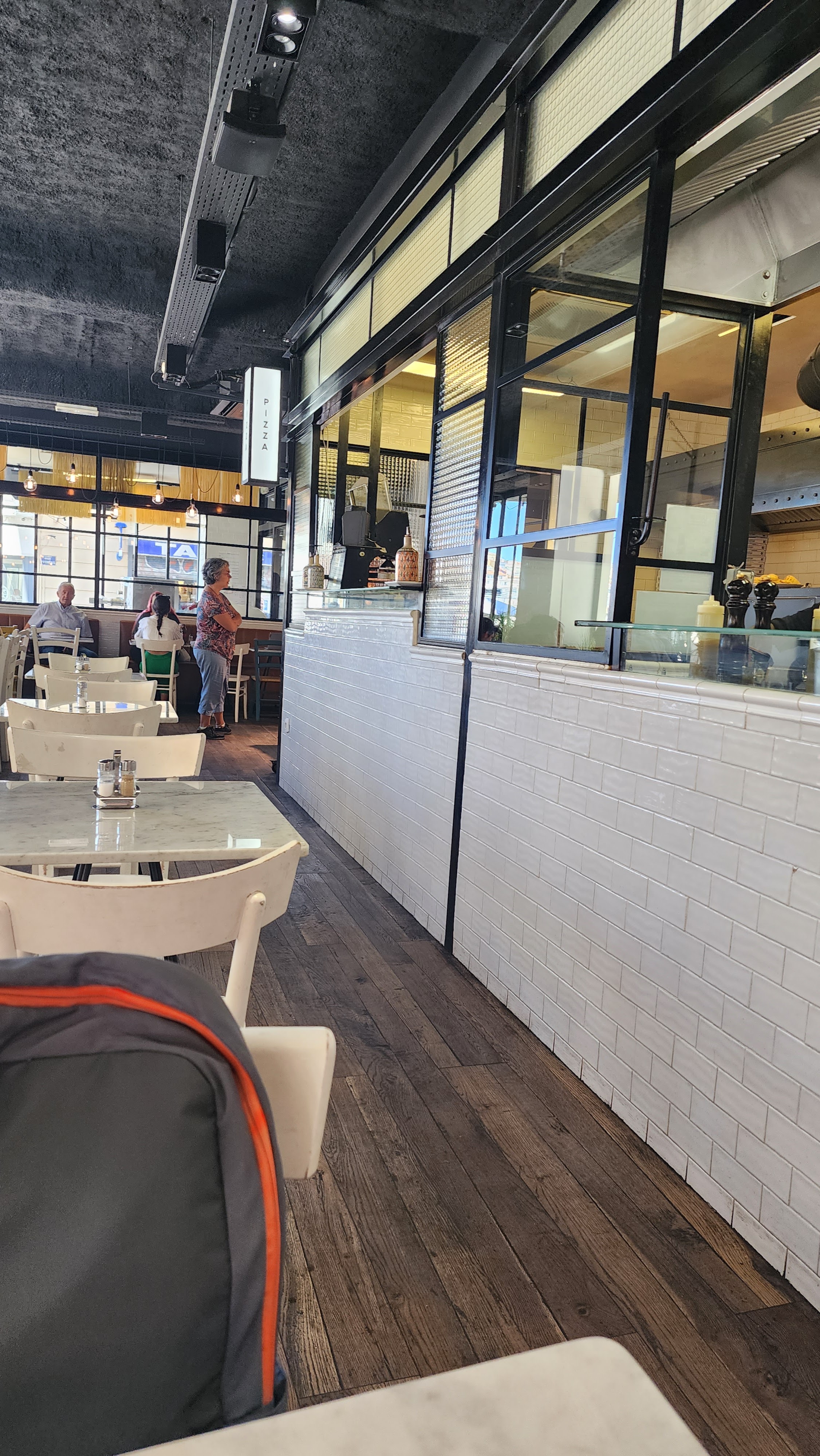 Restaurant ouvert et spacieux, les chaises un peu utilisée mais bon, je suis la pour manger...C'est un restaurant que vous faites vos command à la caisse et ensuite vous attendez que votre pizza ou pâte sont prêt. Les entrées et desserts sont prises à la caisse. J'adore leur tapenade noir, pas trop salè. Les pizzas, pâtes fine et croustillants et les pâtes sont très bons. Tout les deux sont fait sur place. (Désolée, pas de photos...j'avais trop faim et oublié de le faire 😅)