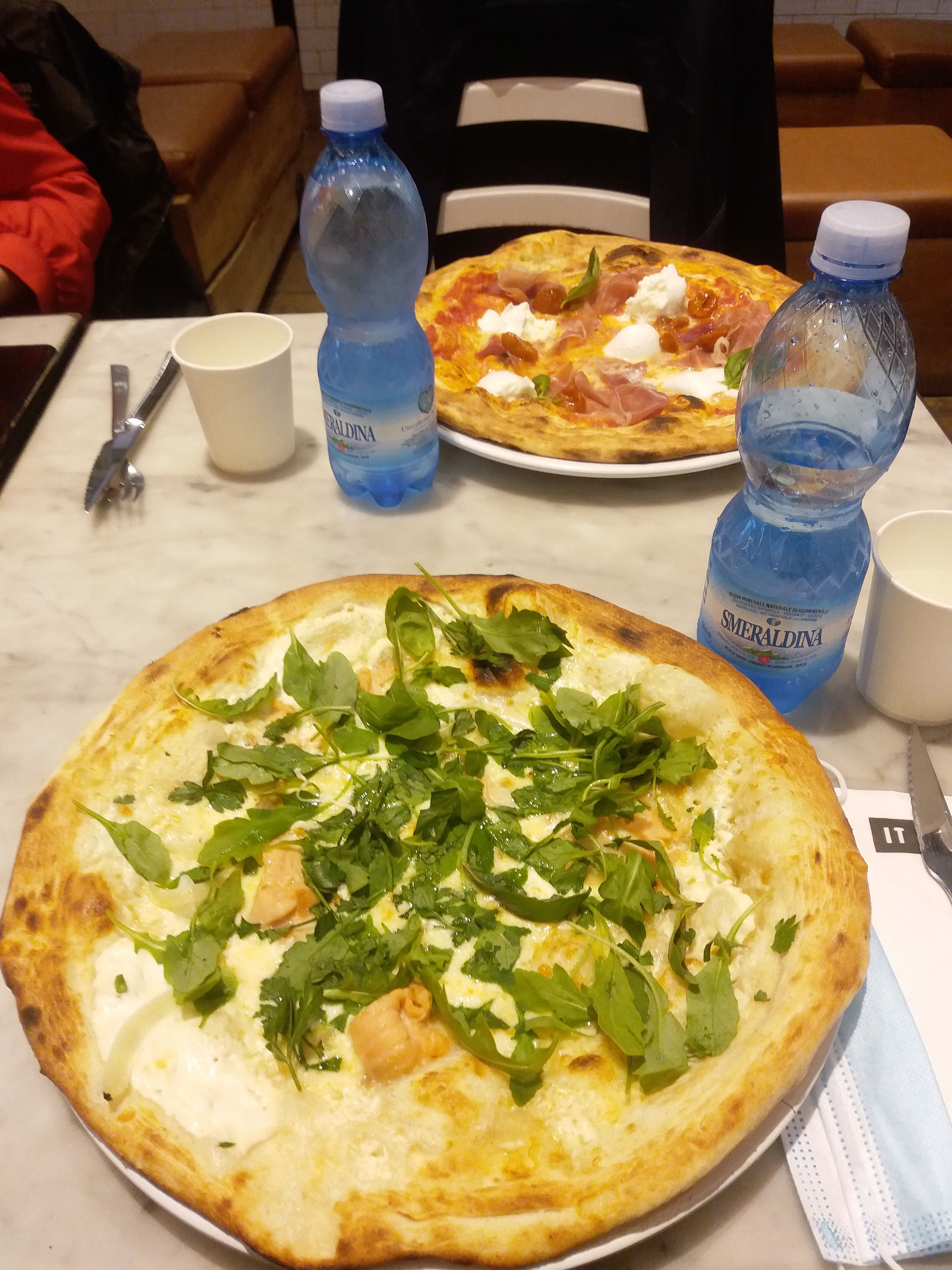 Très bonne pizza (Régina), minimaliste sur la quantité de produits pâte très fine, le goût du vinaigre balsamique et de la roquette l’emportent trop sur les autres produits (champignon, jambon et fromage). Problème sur les tables, trop bancales.
