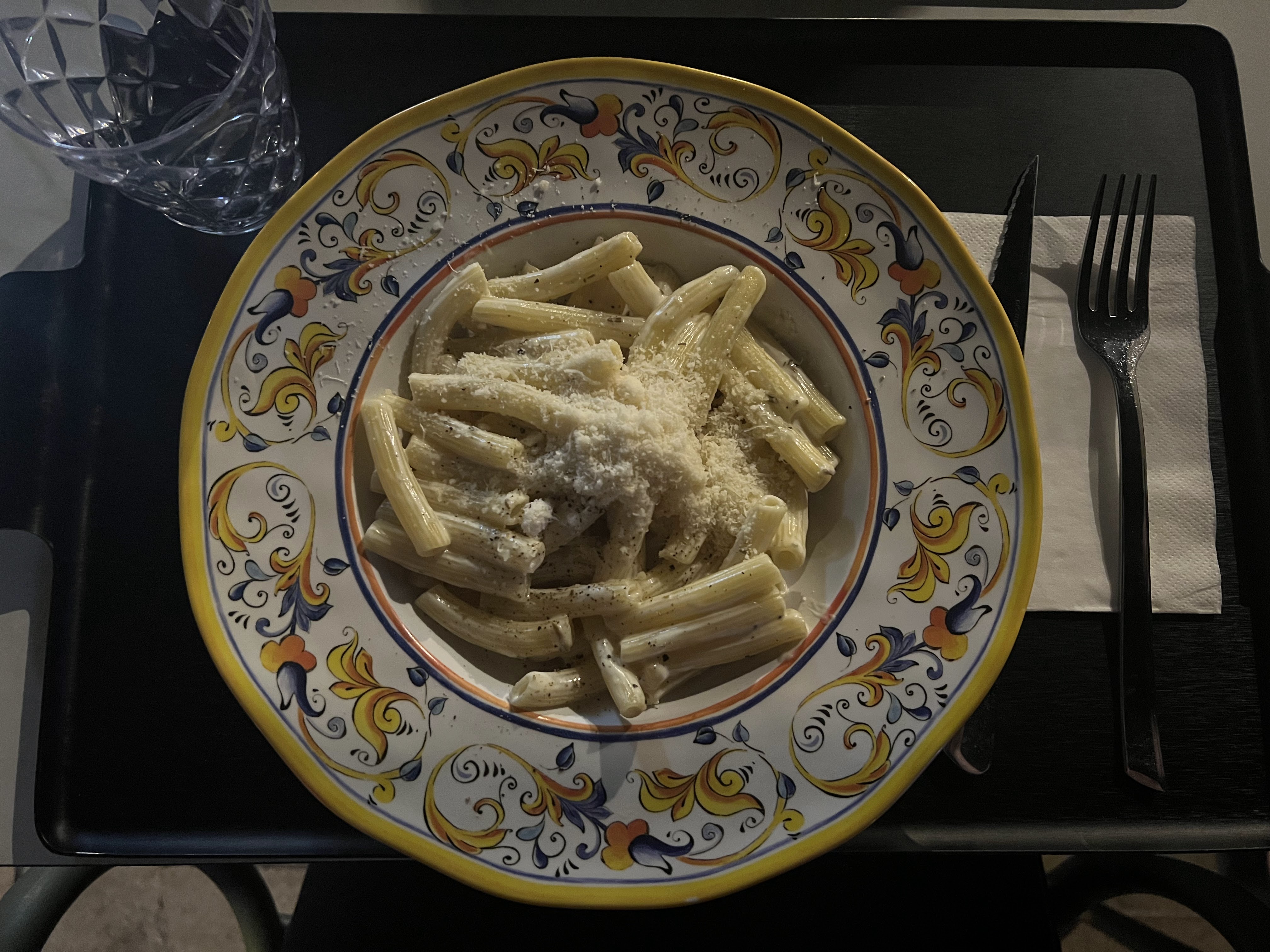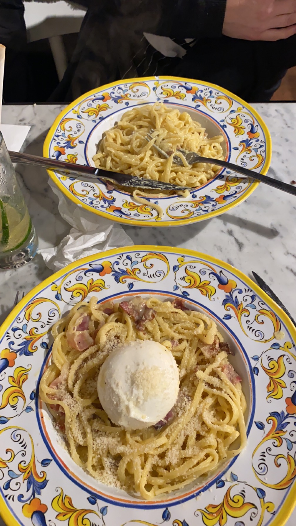25 Euros par personne pour : des pâtes del mar pour 3 minis crevettes dans l’assiette (ça fait cher la crevette), pas assez de pâtes, une boule de Bourrata en entrée et un verre de vin, sans service en salle, dans de la vaisselle en plastique (et pour cause nous sommes nos propres serveurs). Ambiance playlist d’ado a fond les ballons. Impossible de s’entendre. Bref…. Pour 25 balles allez dans un vrai restau…