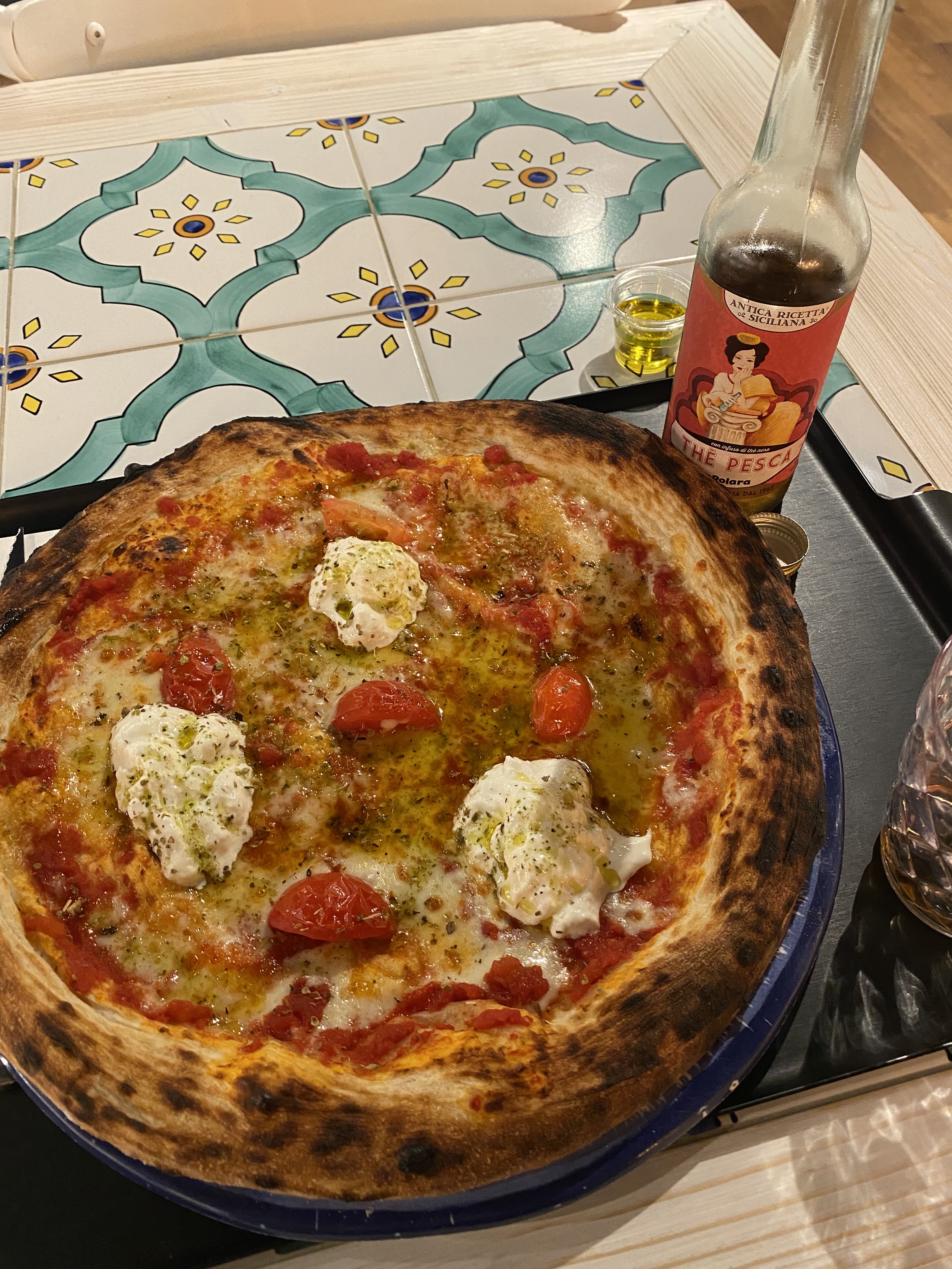 J’ai pris une pizza avec de la buratta c’etait pas mal, pizza tres fine on sent que c’est fait maison. Les lieux sont tres beaux et le personnel est tres gentil. On les vois faire les pizzas etc c’est tres authentique j’aime beaucoup. Je vous conseille c’est pas mal en famille en ami en couple c’est sympa.