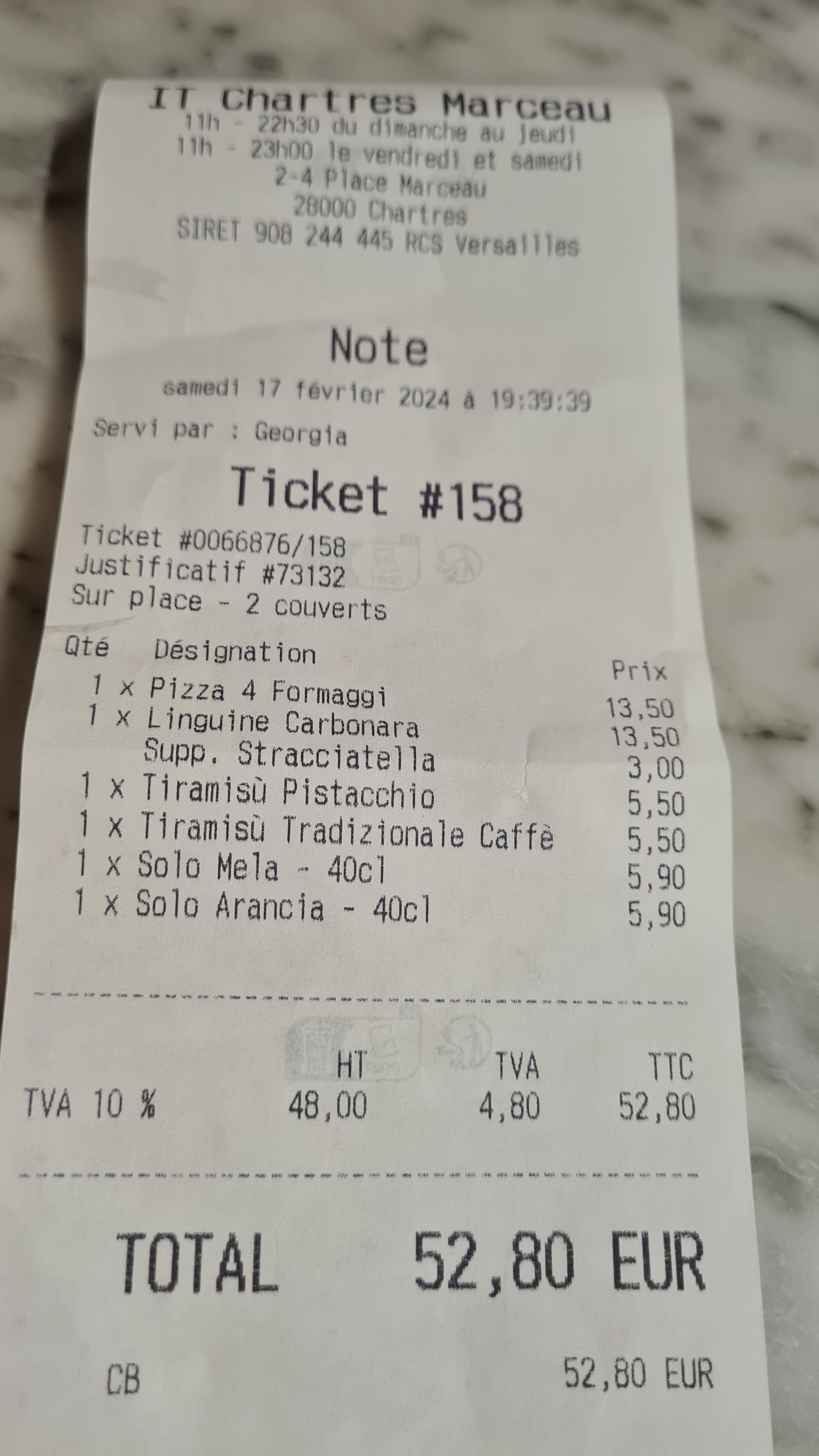 C est un MAC DO italien...et non un restaurant italien comme il en existe beaucoup à Chartres, avec la chaleur et l ambiance. 1 entrée à partager 2 pizzas pas très chargées 2 tiramisu 2 verres de rosé 77 €. Service fait par le client.....