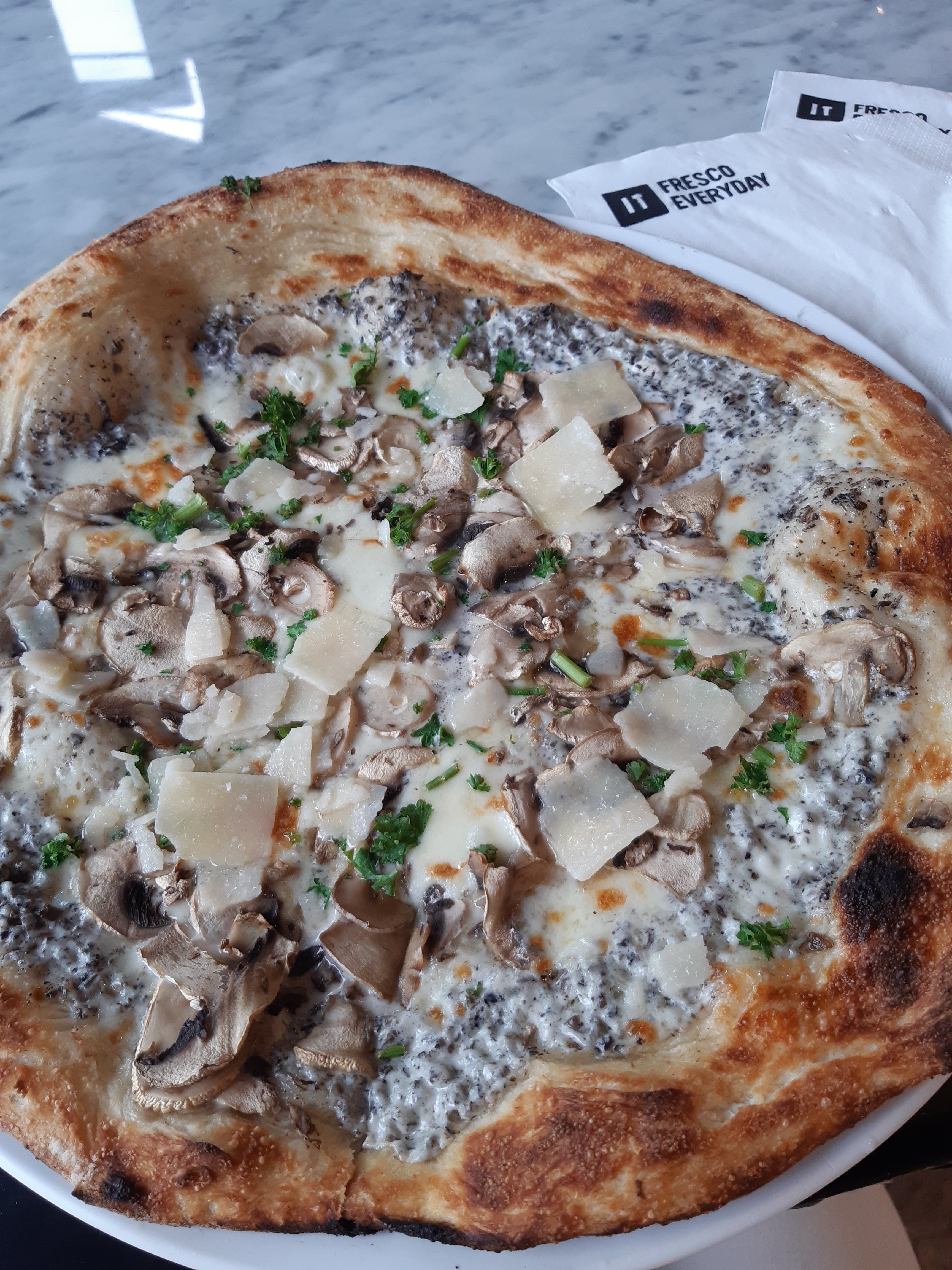 Restaurant agréable, nous avons été très bien accueillis par Aron à l'entrée du restaurant avec un grand sourire et une part de pizza à la truffe. Les caissières identiques, serviable et souriante. Les pizzas sont fines et bonnes, j'ai moins apprécié la pizza à la tomate, j'ai trouvé ça un peu léger et vide en terme d'ingrédients, les salades sont belles et bonnes. Néanmoins, il faut juste revoir la vaisselle et les desserts (congelés).