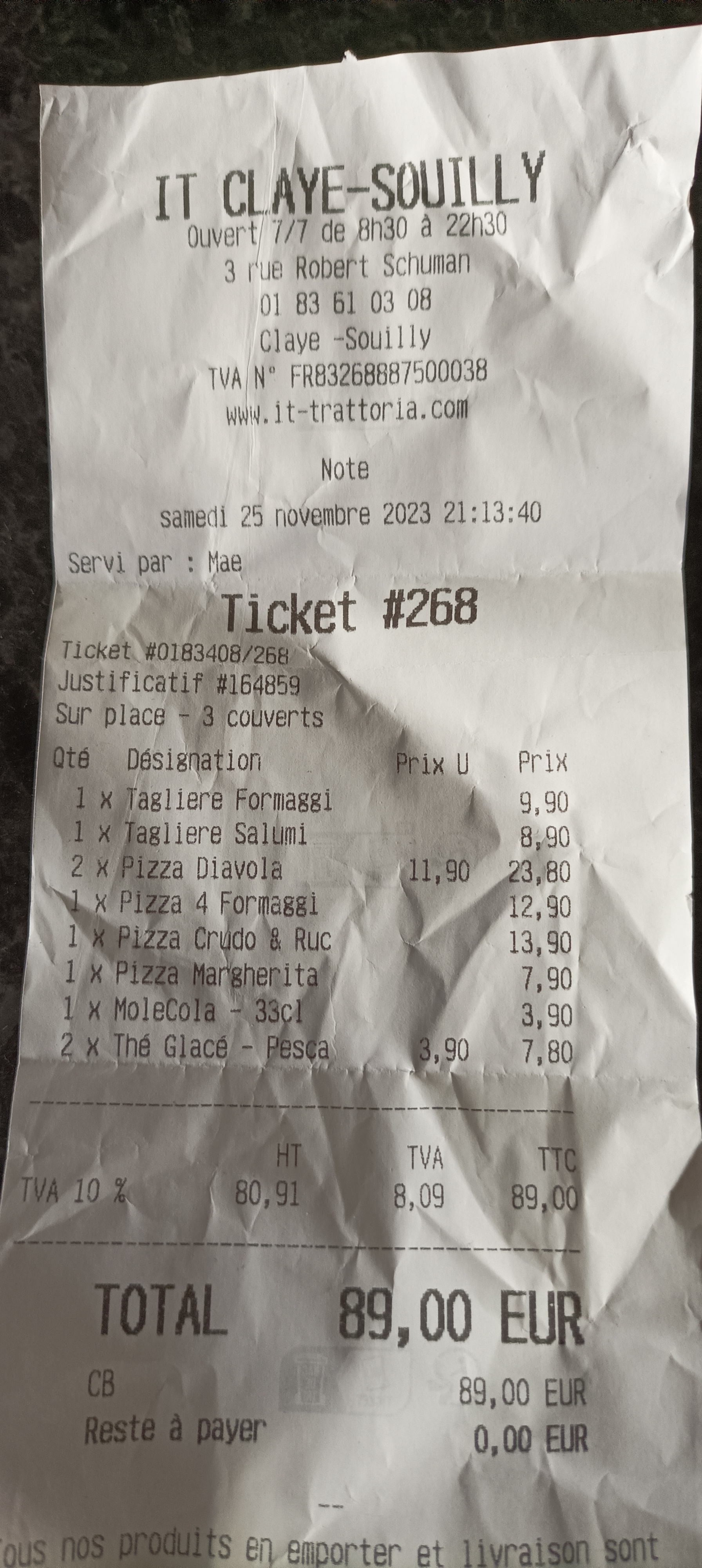 Je n'avais jamais encore faire la petite zone de Claye souilly et je ne connaissais pas ce restaurant ! Les prix sont très bien et les plats le sont tout autant ! Une entrée (mozza) + pizza + café pour 15 euro Fait à la mano au comptoir et tout frais !