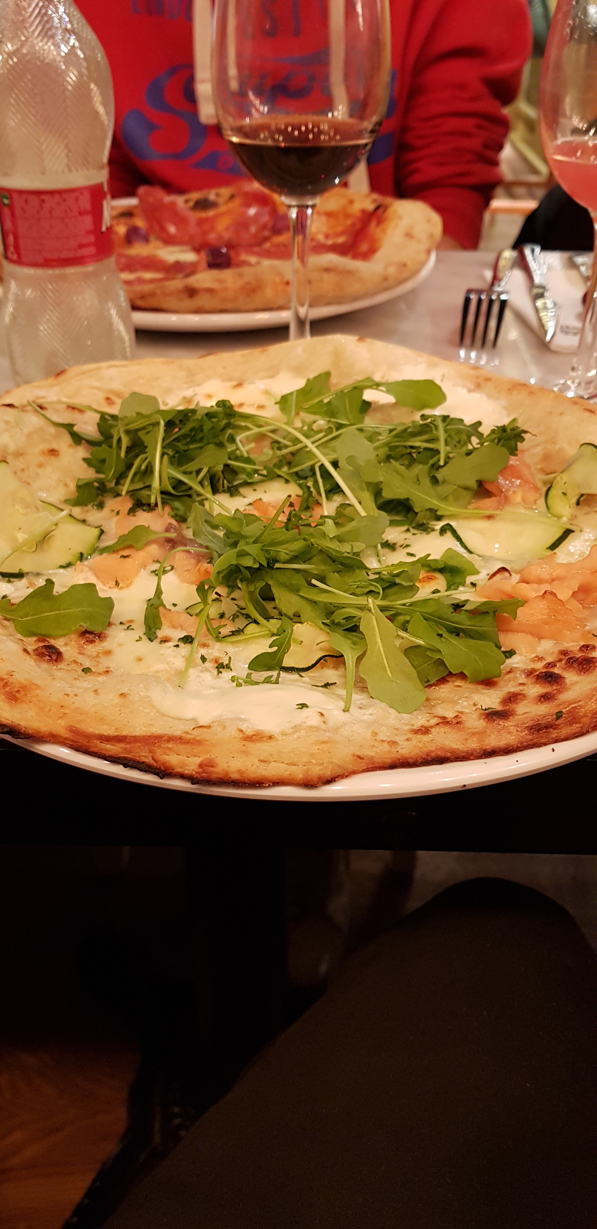 Soirée repas de service du 23 novembre ambiance sympa personnel aux petits soins nous étions une grande tablée et pas grand monde dans le restaurant ma grande déception : ma pizza saumon pizza arrivée noyée dans le jus ... d'eau... de la mozzarella ?... trempée la pâte... pâte très fine, pas grave en soi saumon qui est tellement salé qu'il ressemble en goût à de la truite?... ou alors qualitativement absent... vraiment déçue, pourtant j'en ai mangé des pizzas! je revenais d'un road trip d Italie j'ai sondé les autres collègues, car peut-être que les pâtes sont meilleures... pas si sûre selon celles autour de moi... Dommage Pourtant ai mangé dans la même chaîne de restaurant sur Paris, excellent ! car c'est des restos franchisés ?... que la qualité des plats est meilleure... en tout cas, vraiment déçue, ça ressemble à une cantine plutôt... Du coup , plus jamais cette chaîne