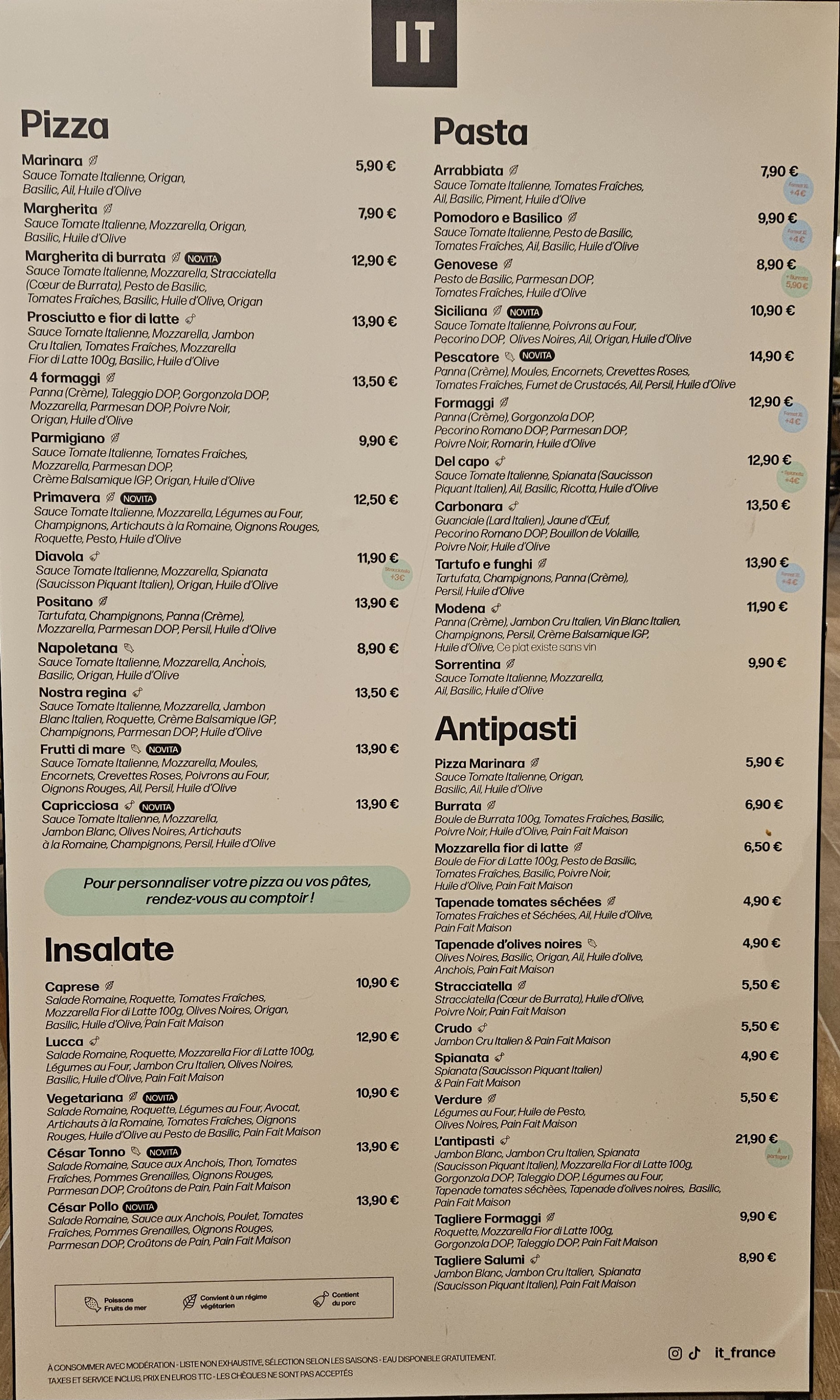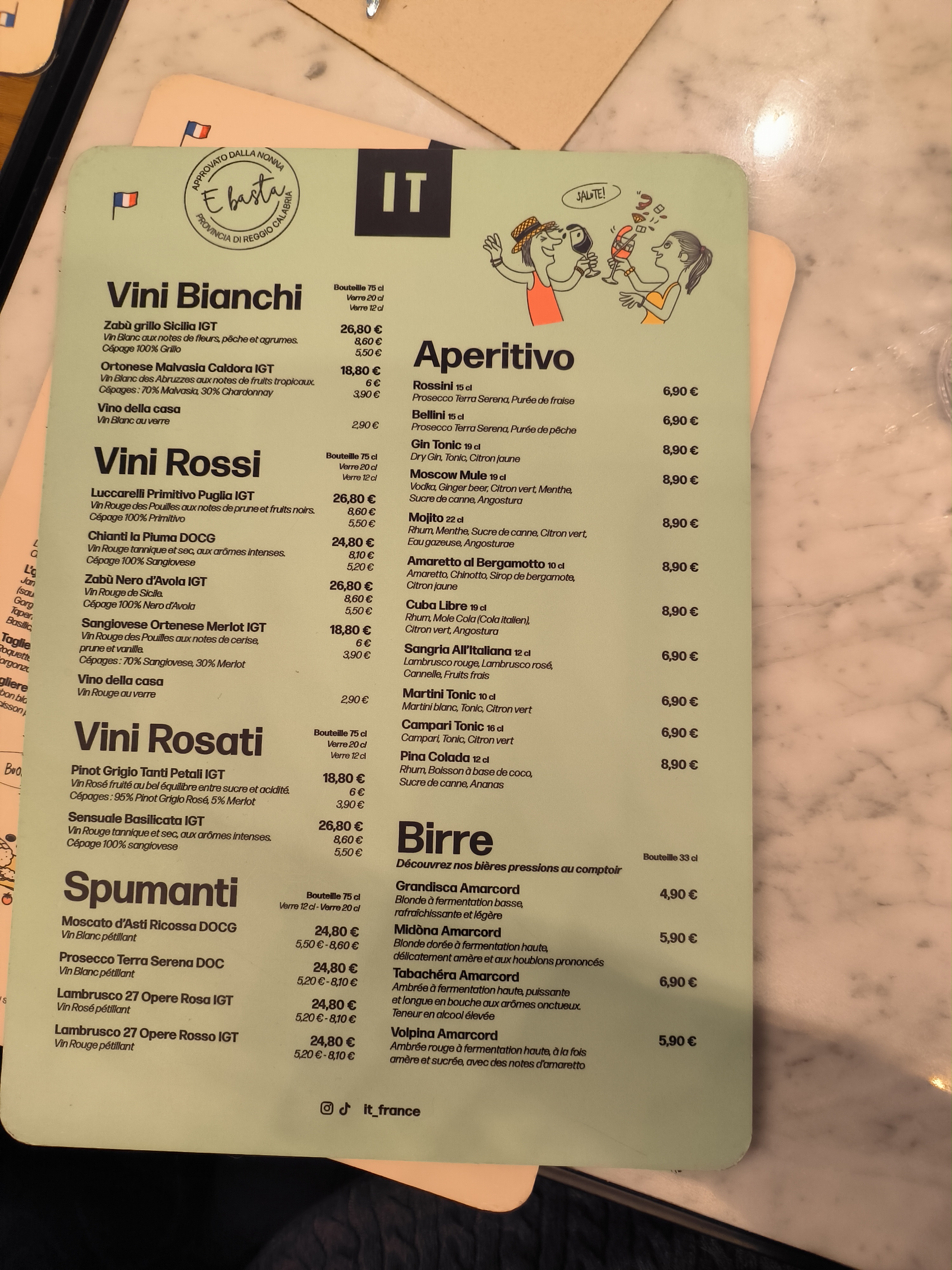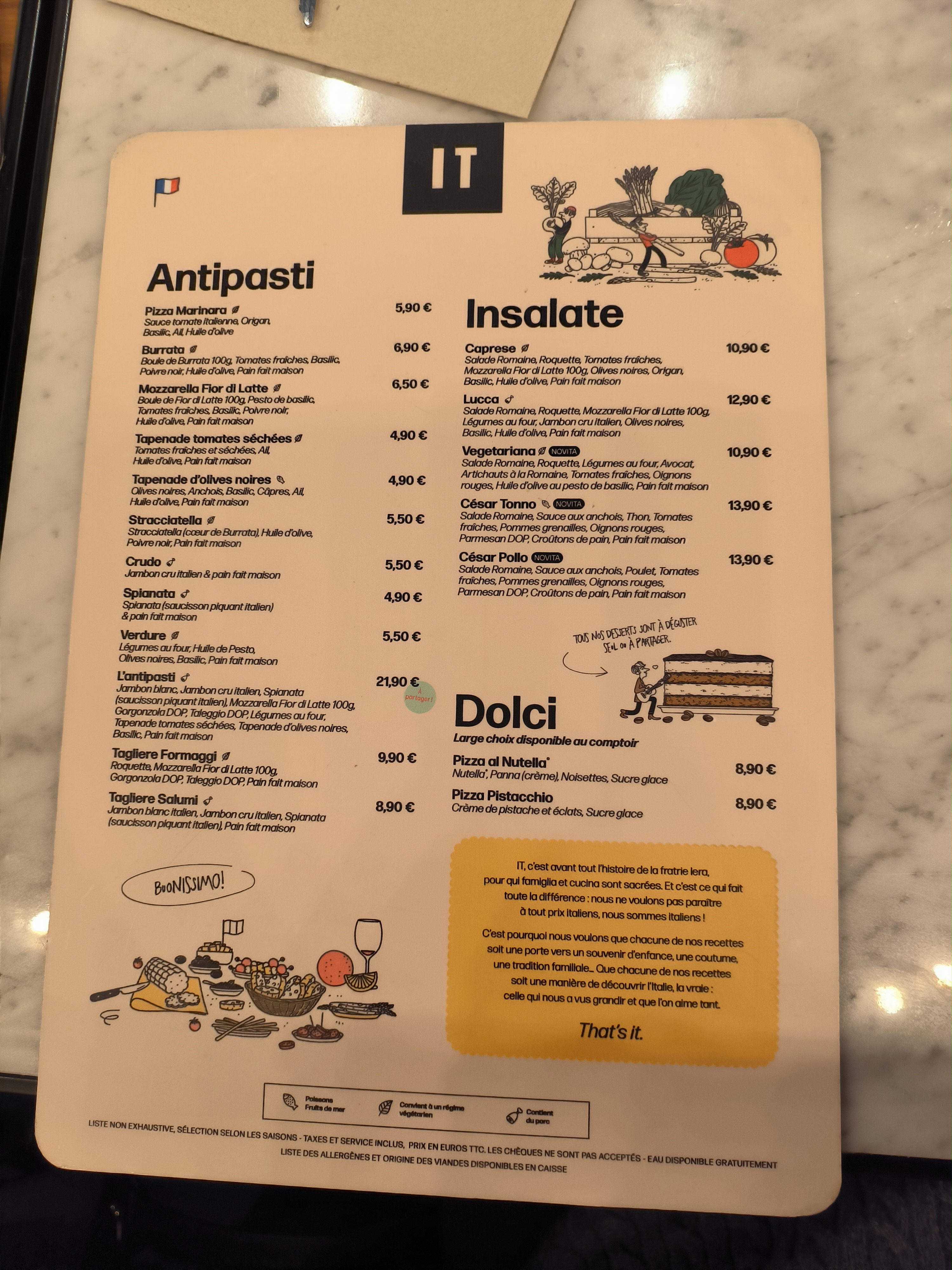 PIRE IT de France ! J’ai pris des pates sauce tomate, basilic, ails, mozzarella car (la moitié des plats de la carte n’était pas disponible) et aucun gout n’était présent. Pate trop cuite, gout tomate absent comme coupé à l’eau, et plate tout simplement fade ! Servir ca est innaceptable ! FUYEZ !