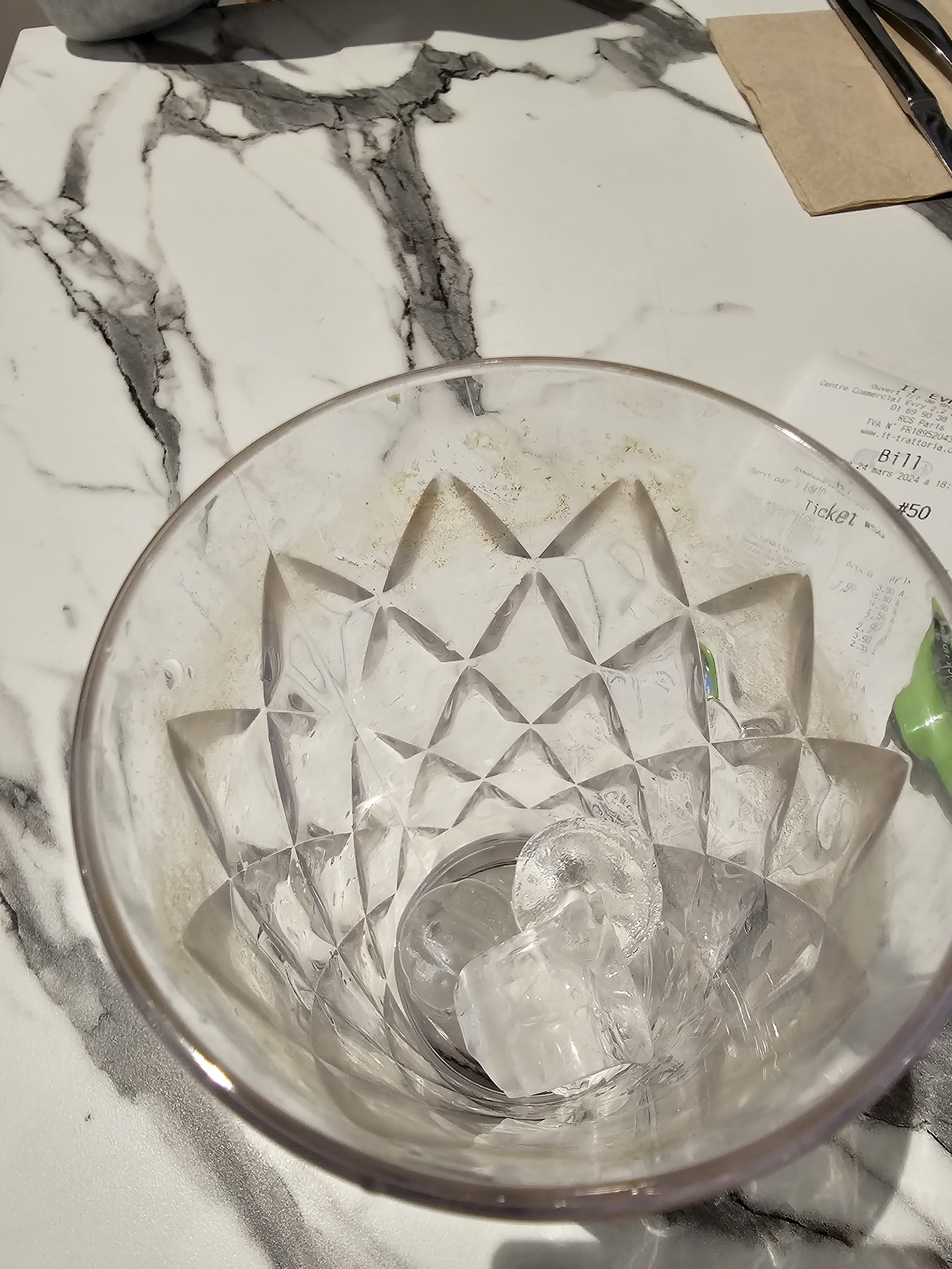 un bout de verre dans mes pattes carbo 😅 super dangereux si je ne l’aurais pas vu. de plus, les pommes de terres de ma salade étaient crues et il manquait les tomates.. a fuir!