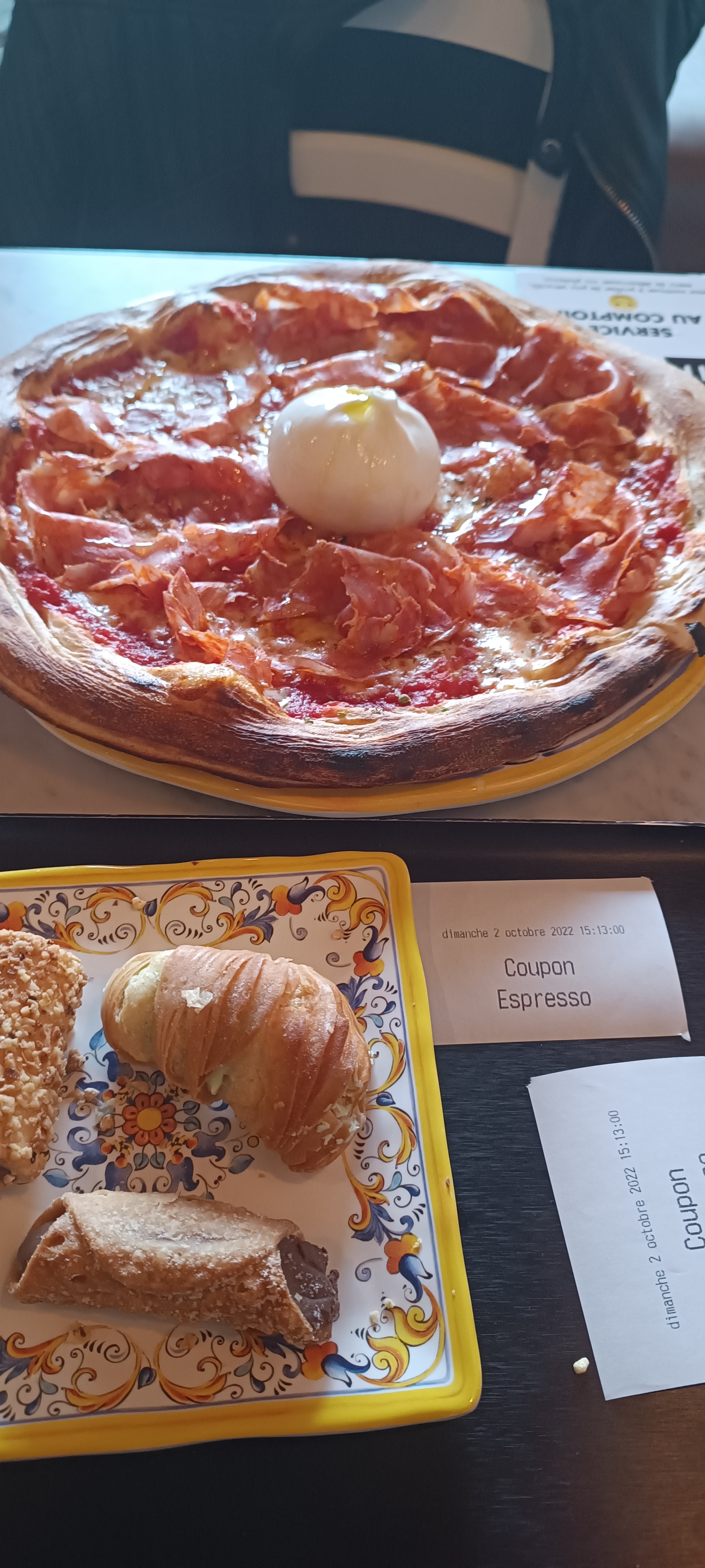 Je ne mets aucune note pour le service puisqu'on doit le faire ! Bonne pizza mais la charcuterie que l'on avait prise en entrée était sèche et l'accompagnement était quelconque (aubergines et poivrons) la mozzarella était également quelconque. Pour deux verres de vin, une petite assiette de charcuterie (sèche) et une boule de mozza et deux minuscules bouts de fromage, deux morceaux de pain au gorgonzola deux cannoli siciliani et une pizza (qui était par contre très bonne) 58 € c'est cher ...