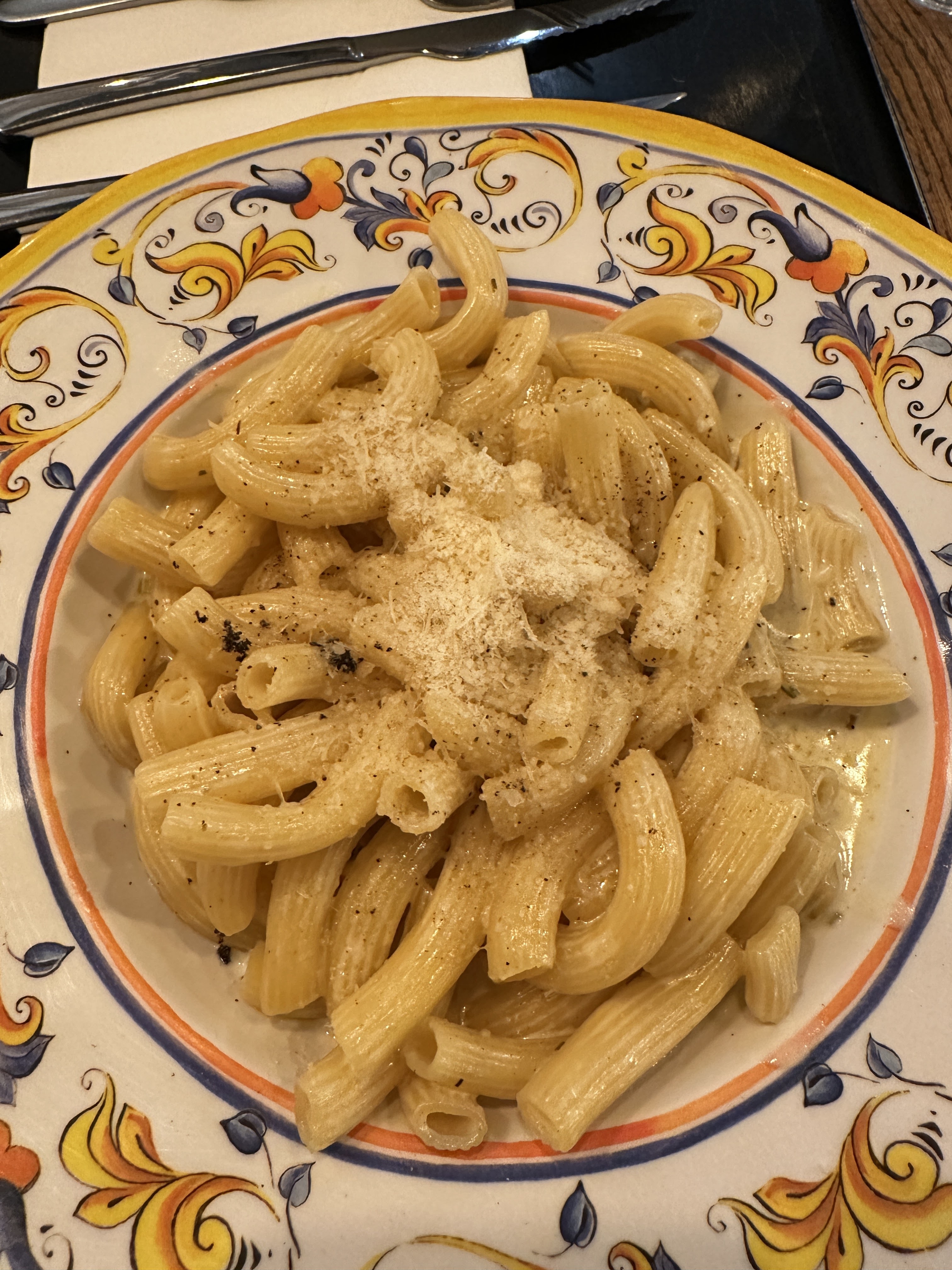 les pâtes sont beaucoup trop poivrée moi qui n'apprécie pas le poivre ce n'étais pas un bon plat... en trop petite quantité, et pas de parmesan à table donc impossible de se resservir du parmesan