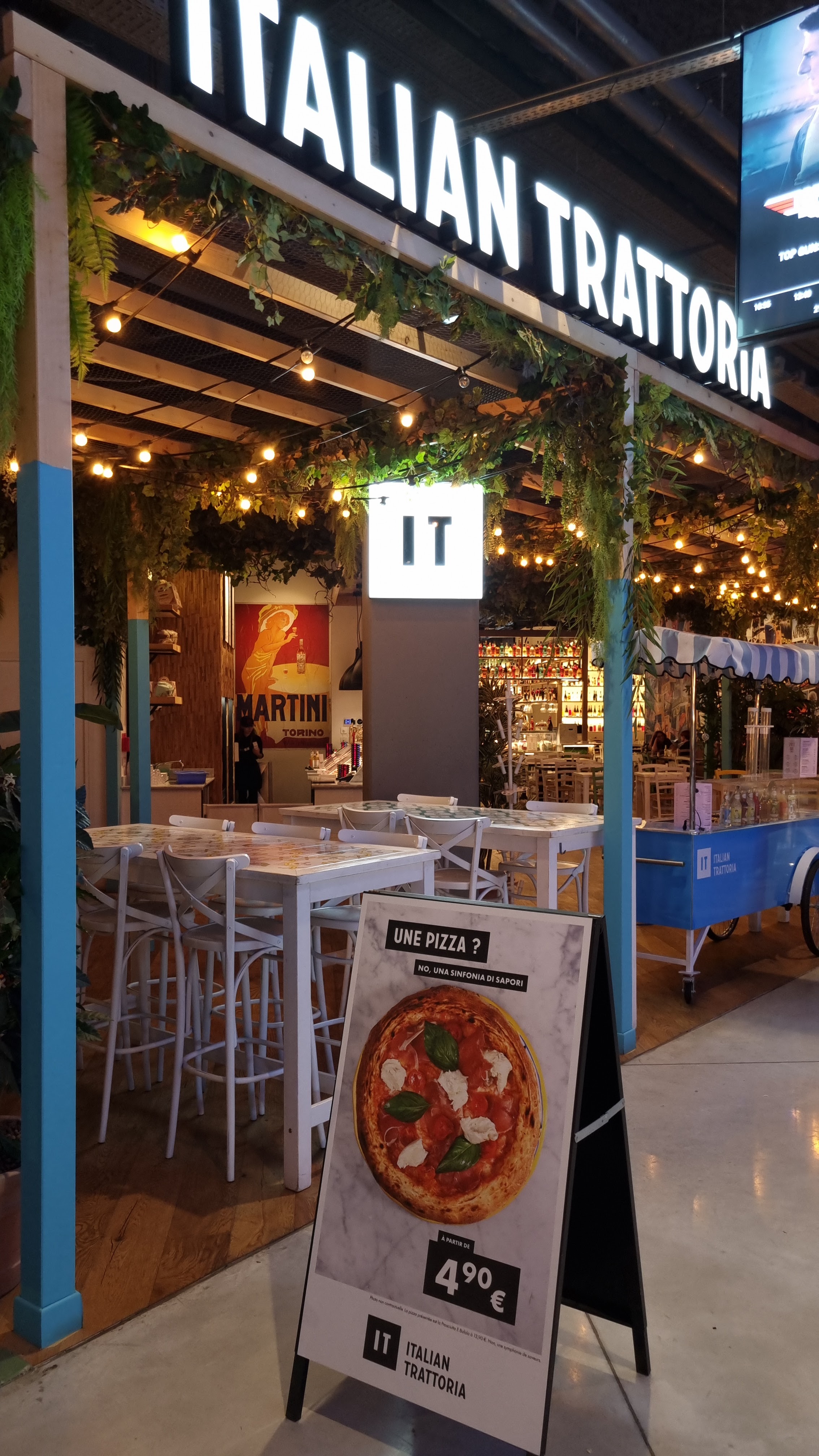 Italian Trattoria, c'est un peu McDo où vous mangez des pâtes ou une pizza. Heureusement que cette dernière, une primavera, ne coûtait que 6,90€. Une offre spéciale, paraît-il, sans doute mise en place pour compenser la rupture de stocks de garnitures et matières premières. On ne sait pas si c'est temporaire ou permanent... Les 3 petits morceaux d'aubergine devaient se sentir bien seuls au milieu de la pâte vaguement recouverte de fromage. La bière est pas trop mal, mais là le prix explose. On m'a proposé un dessert au prix tout aussi exhorbitant, que j'ai refusé. Un lieu très bruyant et à des années lumières de l'Italie, où vous aurez le privilège de vous sentir un tant soit peu écolo le temps d'un déjeuner, en buvant dans des verres en plastique réutilisables pleins de rayures. Écolos mais pas ragoûtants. J'ai testé, je n'y reviendrai pas.