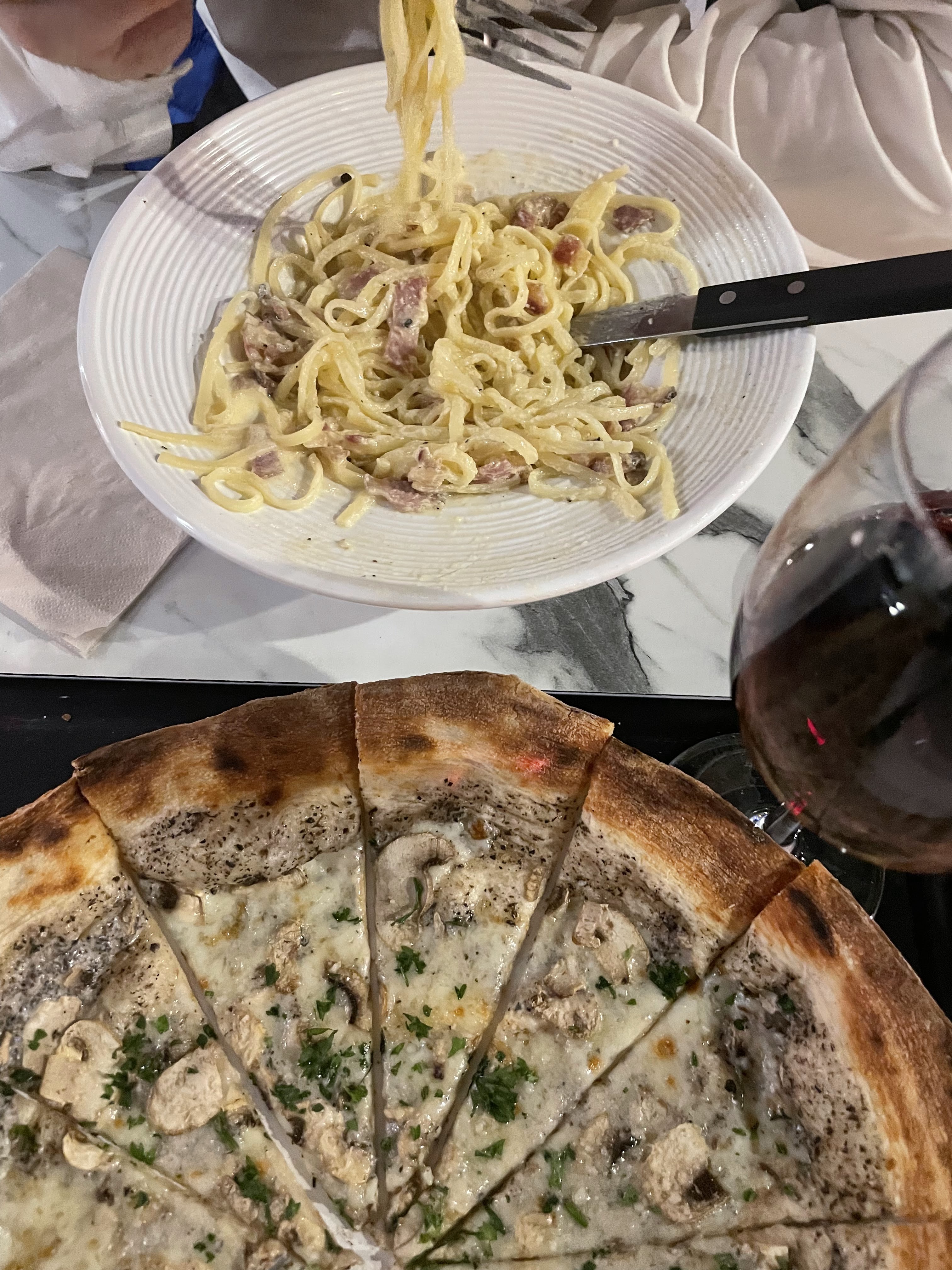 Nous avons été très déçu, la qualité des plats équivaut à un bon vieux fast food bas de gamme. Le plat de pâtes à la carbonara était minuscule et la pizza était peu garnie et séche.
