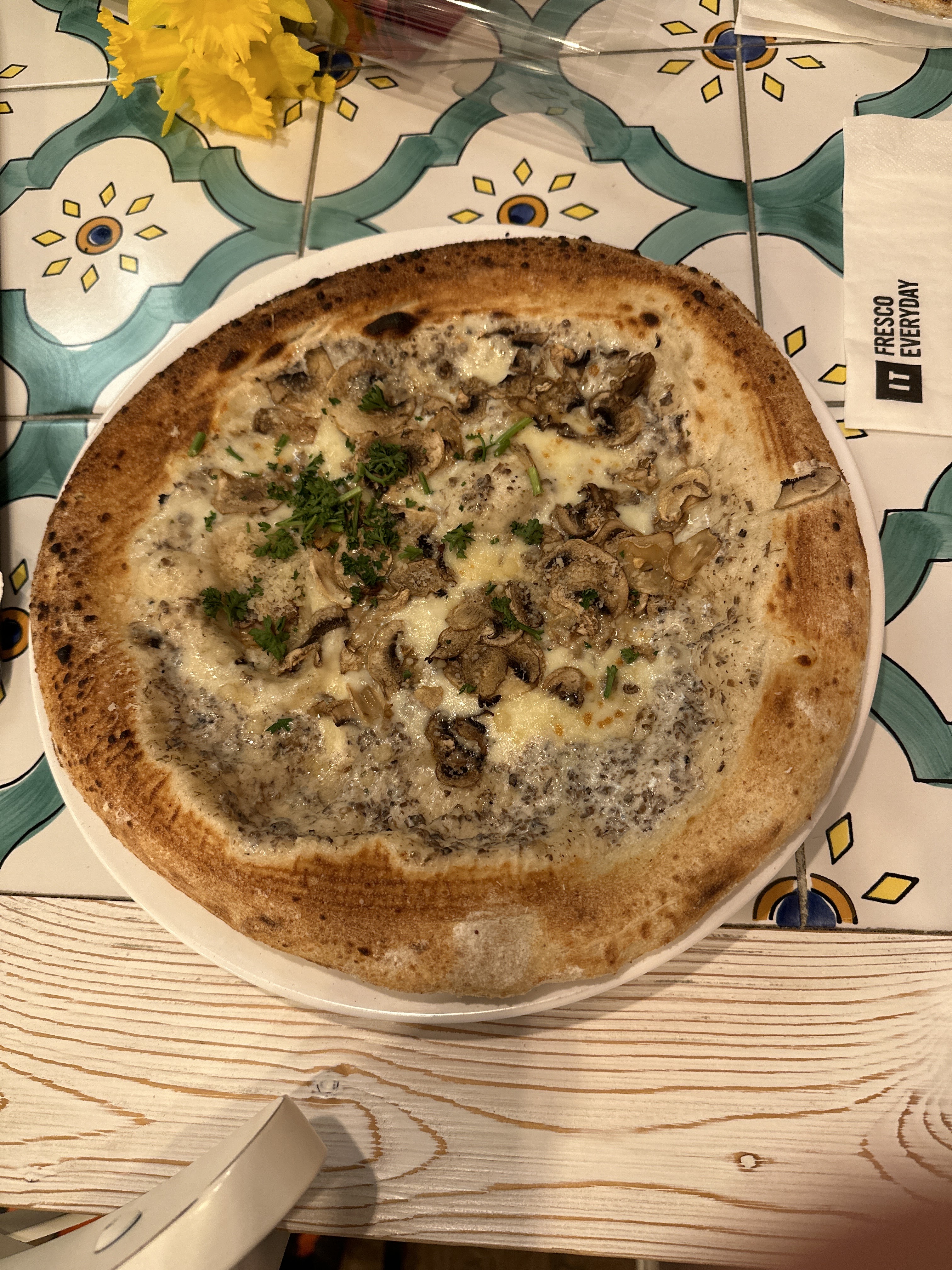déçue. Très surfait. Garniture ultra fine, pizza fade et tiède, courant d’air froid sur la table près de la porte des toilettes (ventilation) désagréable en décembre. Néanmoins déco sympa et personnel accueillant