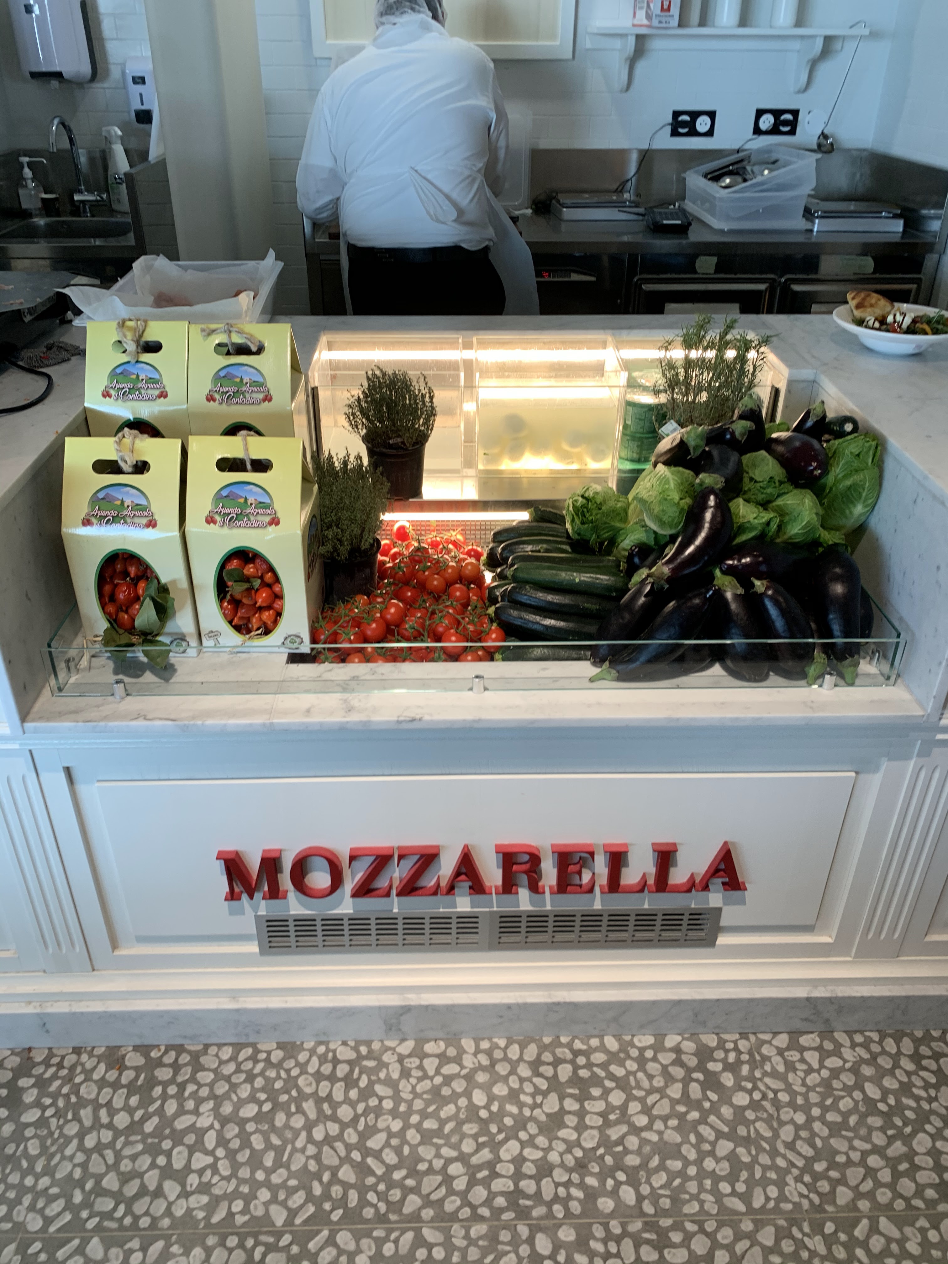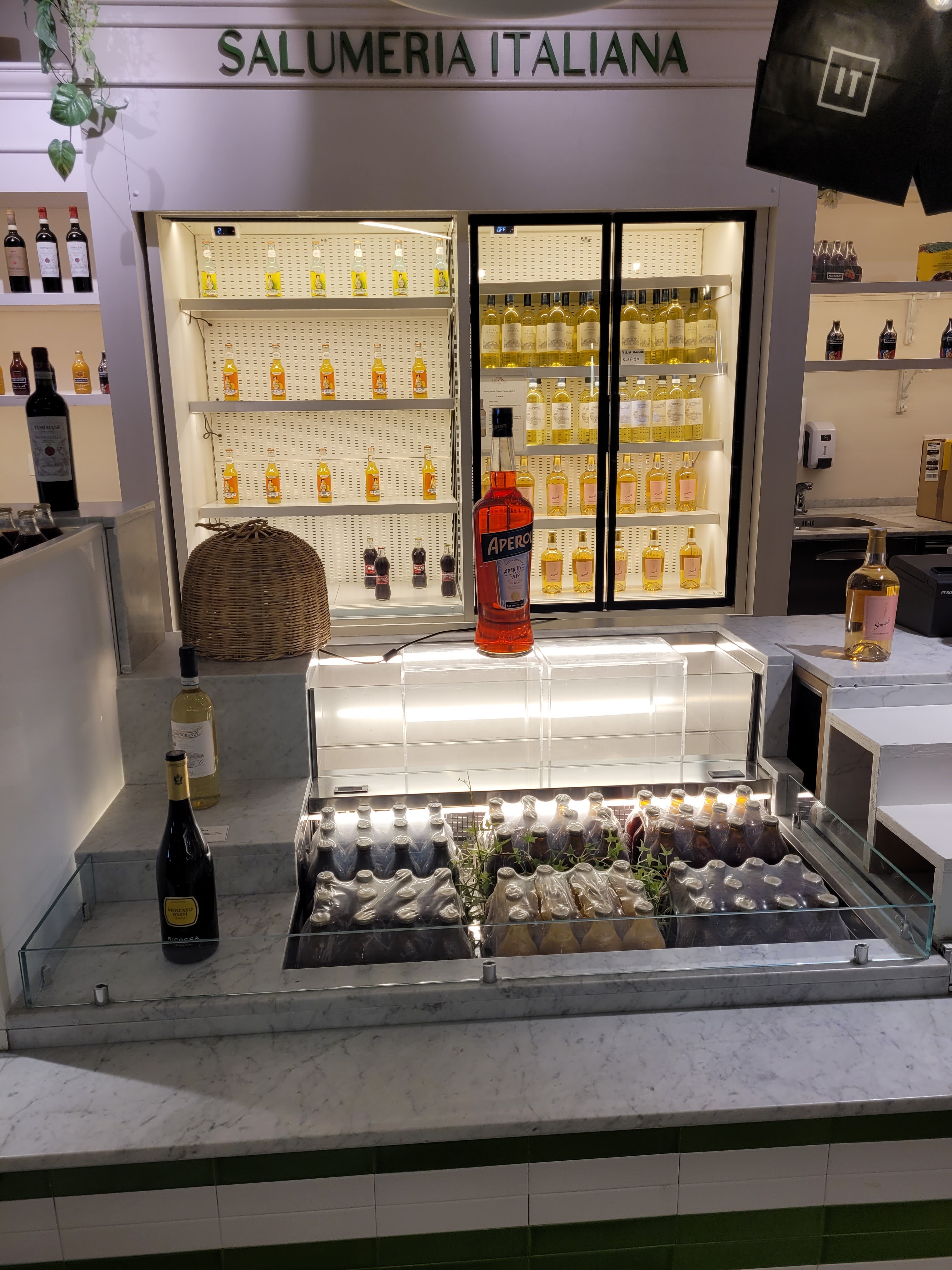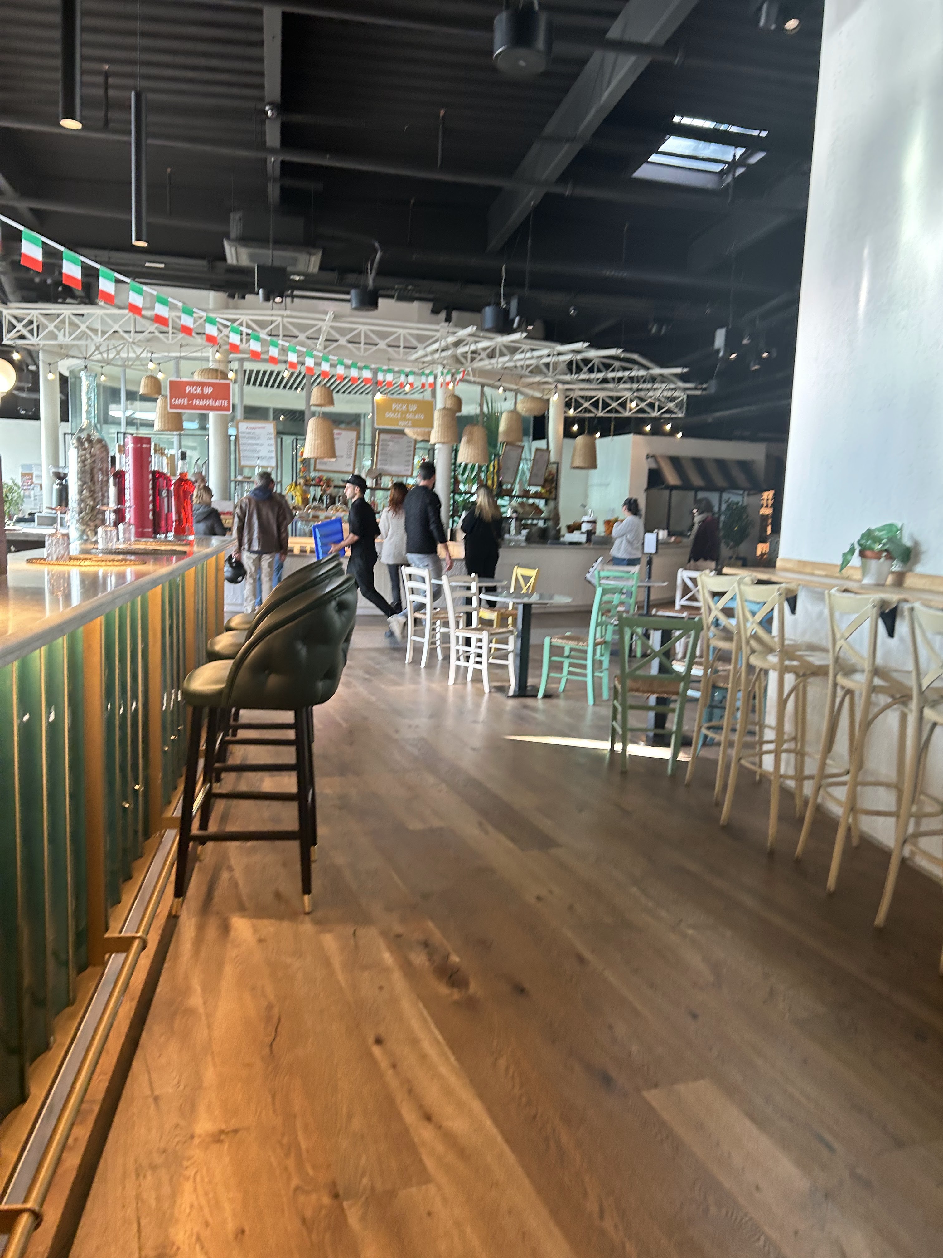 Pas encore rodé puisque ça vient d'ouvrir. Beaucoup de personnes cherchent où allez suivant les îlots ou quartiers. Mais en résumé vous vous rendez à n' importe quelle caisse, vous faites votre commande à l'aide du menu que l'on vous remets en entrant, puis vous venez retirer vos plats dans chaque stand correspondant. Grand espace qui se remplis rapidement à midi, superbe vue à l'extérieur. Une épicerie à l'entrée pour ceux qui veulent emporter. Un bar avec spécialités. Le vrai petit village italien. Pour la cuisine, rien d'extraordinaire, la pizza goût moyen, les pâtes avec les boulettes avaient un goût de papier mâché et le dessert fait industrielle oublié dans le frigo. Pas du tout emballée par leur cuisine.