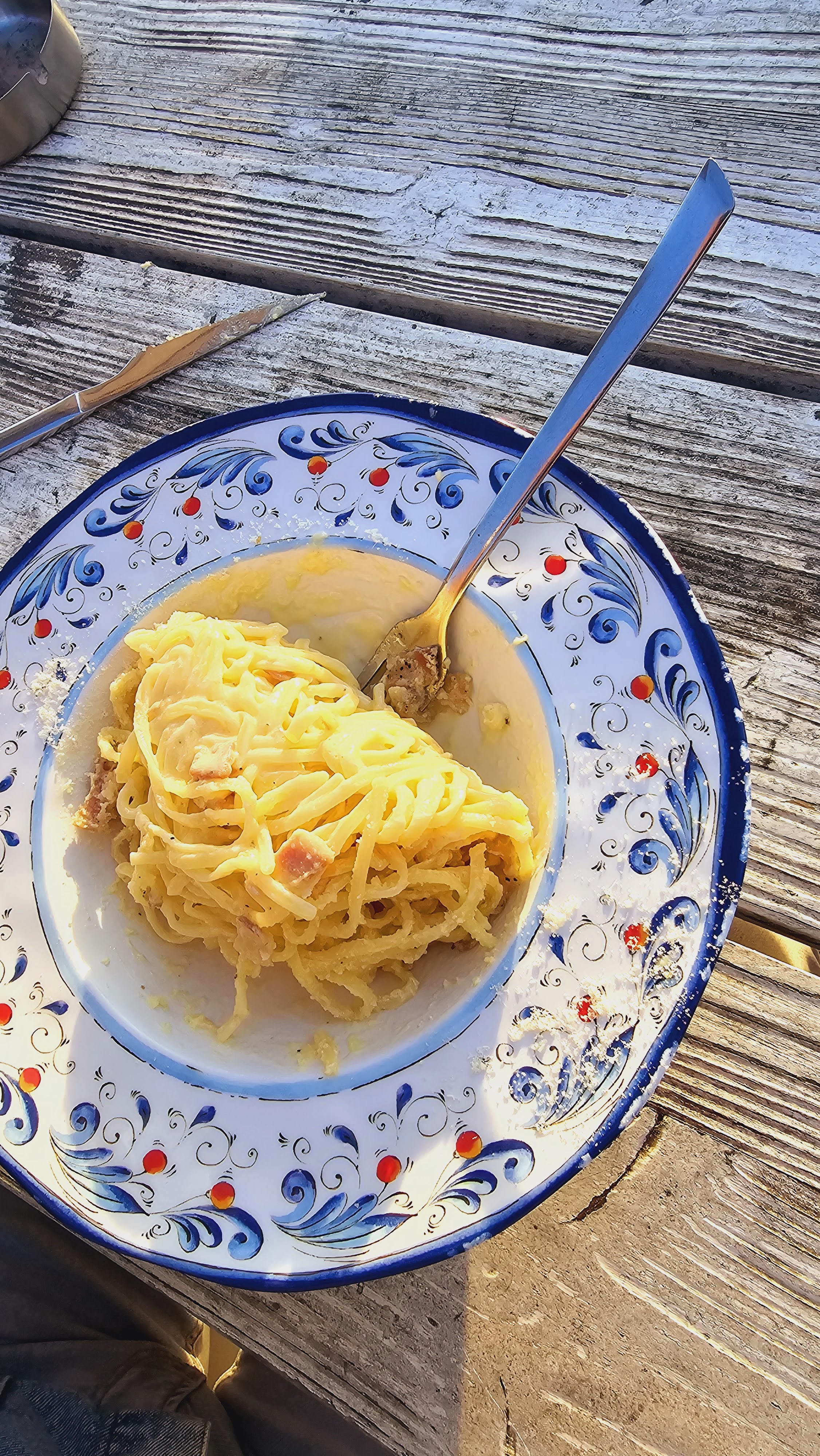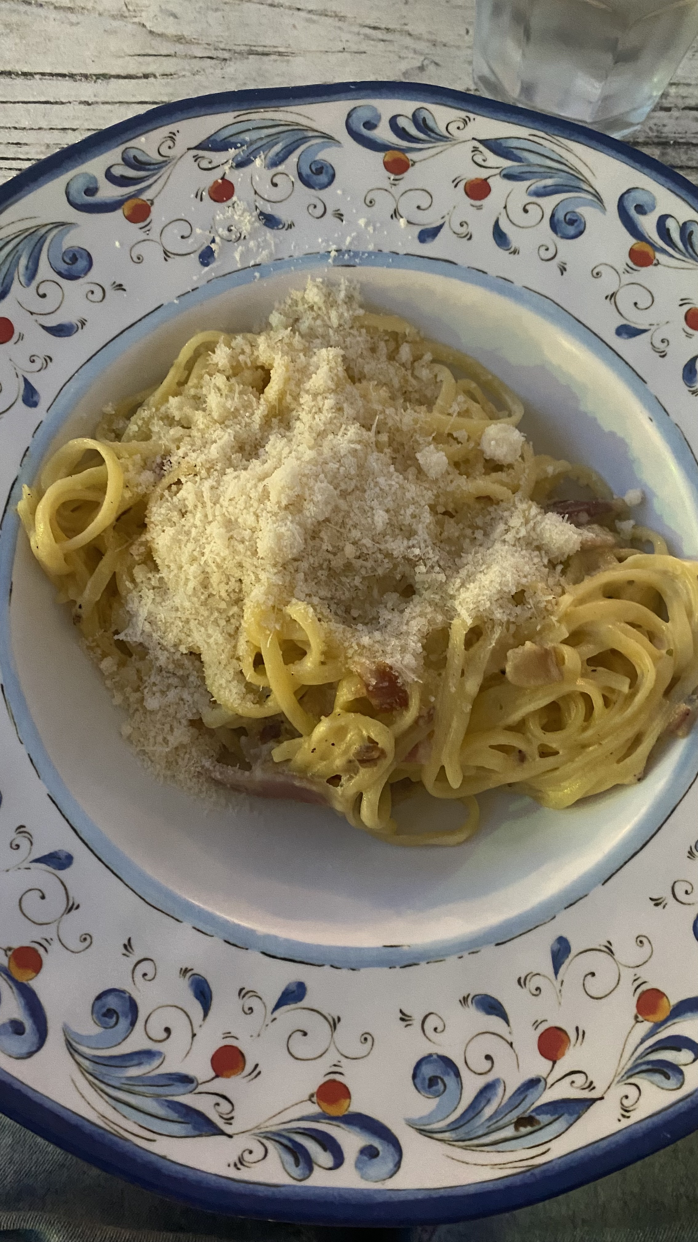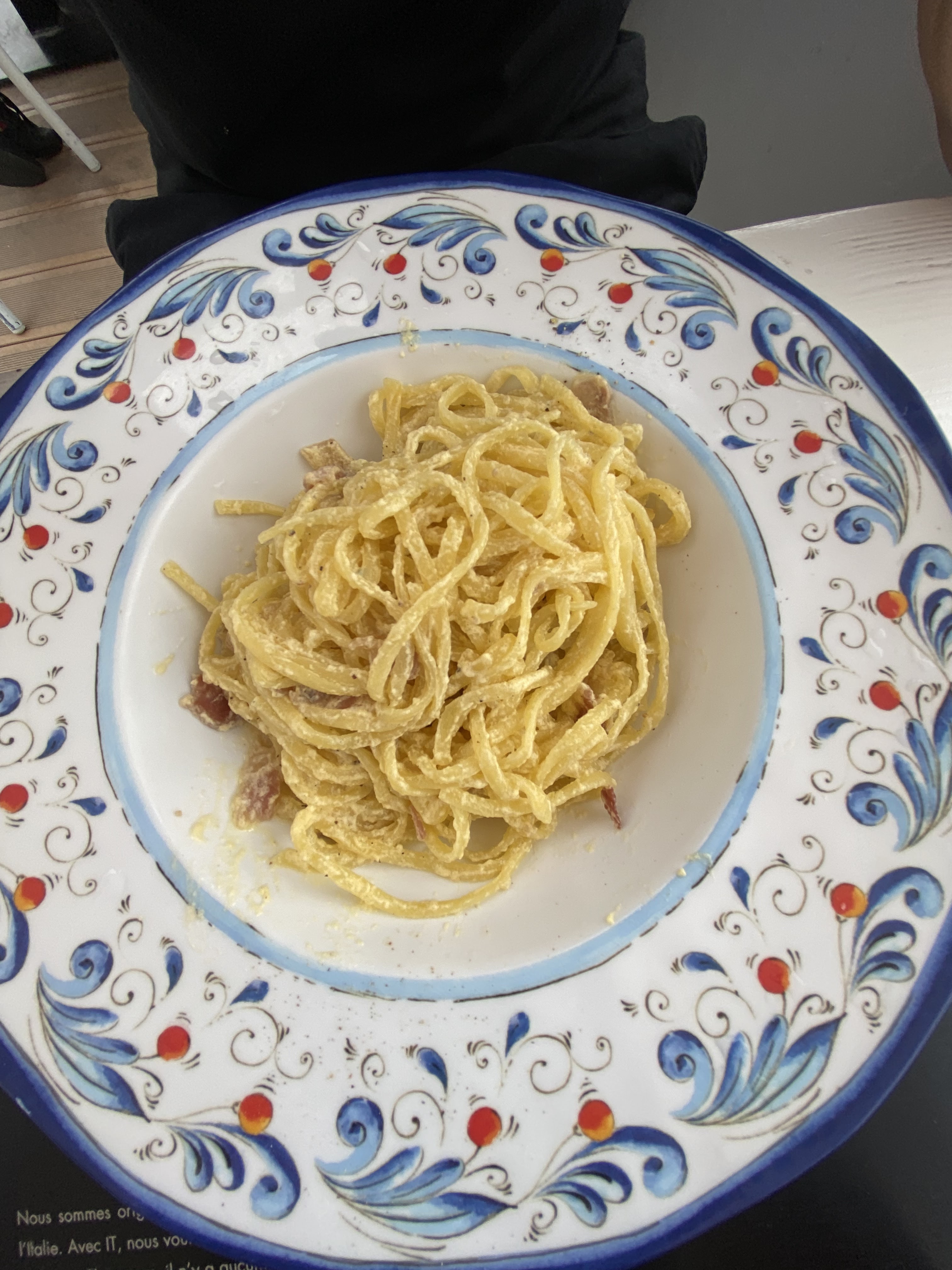 Cadre sympa car vue mer. Service aucun car c’est à nous de venir chercher nos plats. Cuisine. 15euros les carbonara (voir photo)…