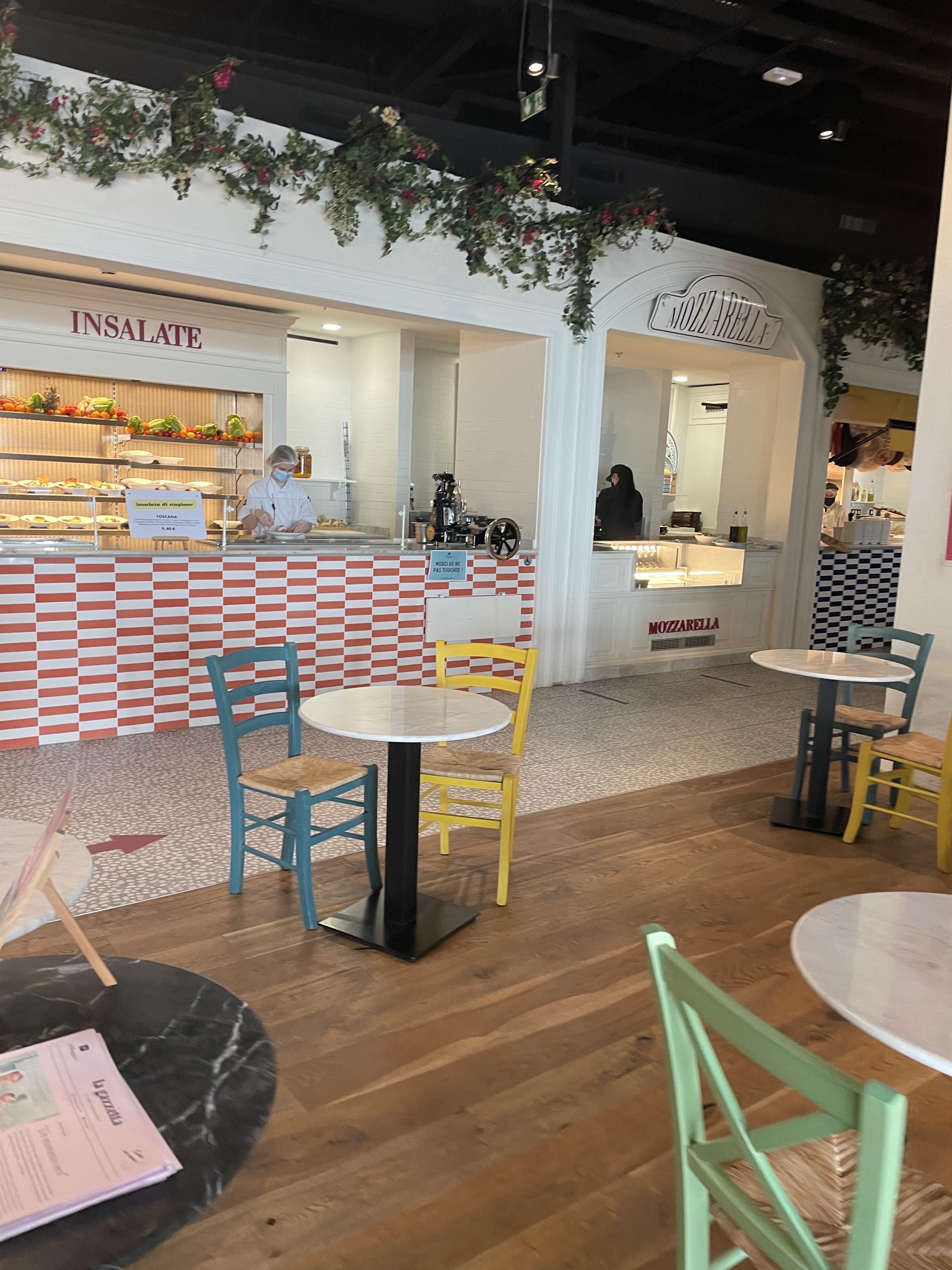 Concept sympathique de food court présentant la gastronomie italienne. Le service est rapide car les commandes se font à tous les comptoirs du restaurant (pâtes, pizzas, antipasti) vous pouvez faire différents choix et un seul encaissement. Le lieu est agréable, la décoration soignée et la terrasse ensoleillée au dernier étage du centre commercial est un plus ! Les plats sont bons, les portions sont correctes. Nous avons choisi de goûter la burrata qui était crémeuse comme attendue, la salade Romana copieuse et savoureuse. Seul bémol pour les pâtes carbonara, nous nous attendions à une portion plus grosse et le « goût » n’était pas au rendez vous. Nous reviendrons profiter des beaux jours sur cette terrasse.
